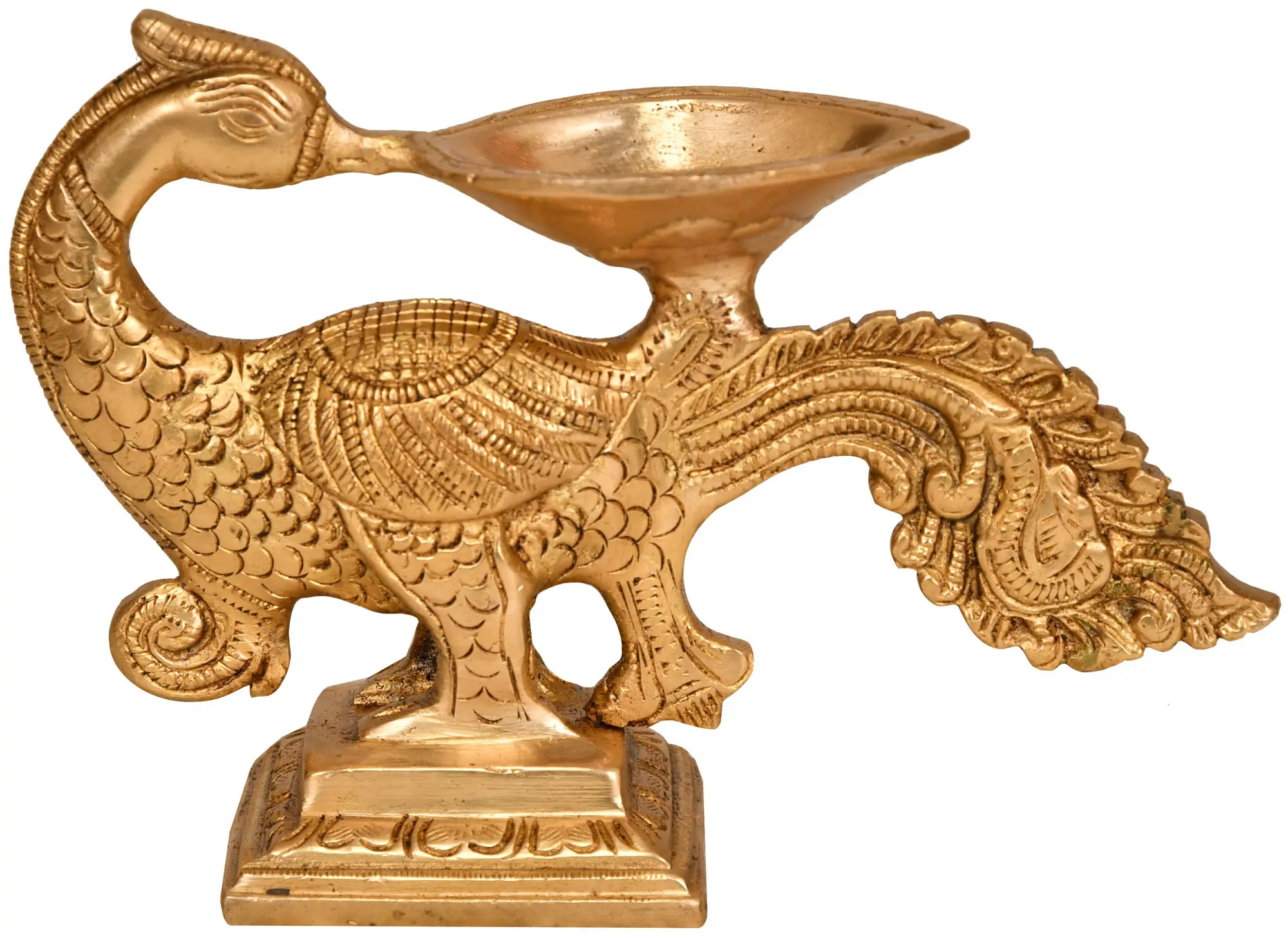 Mayil Vilakku, or peacock lamps, are portable lights with a picture of the mythological peacock Annam on top. This brass lamp with a single candle linked to the beak of the bird or Annam on the top of the lamp is a lovely example of auspiciousness combined with simplicity. The lamp's wick is sharp and shaped like a leaf. The body of the lamp is rose gold in color and is magnificent in appearance. The wings are carved so meticulously that the scales can be prominently seen. Lighting this lamp is said to bring not only the heavenly warmth of the light but also wealth and good luck to the home.