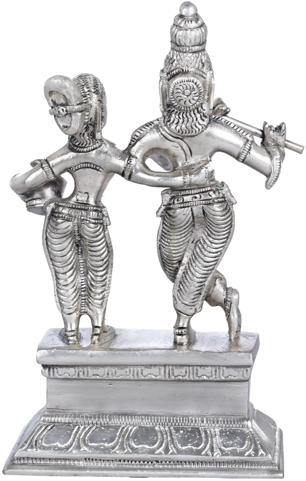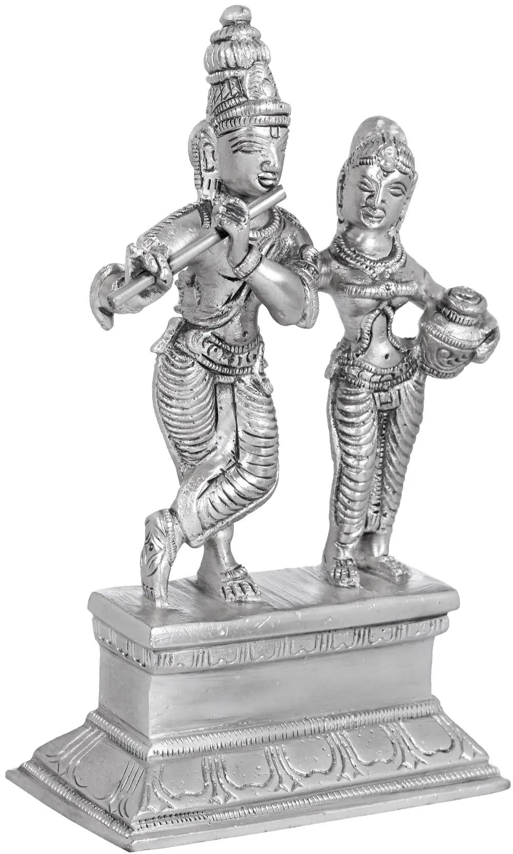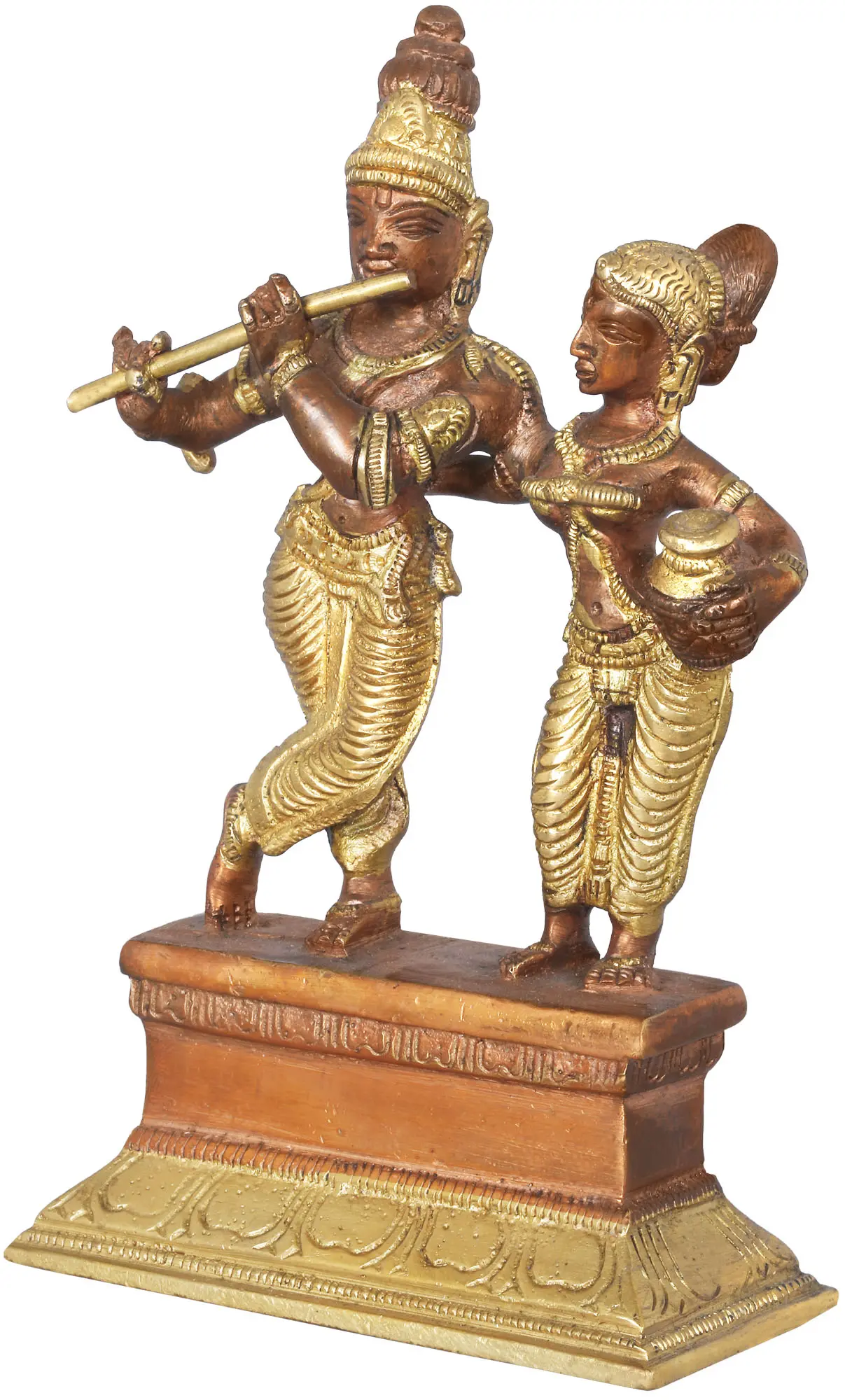 Handmade with devotion, the brass Radha Krishna sculpture captures the divine love between Radha and Krishna. Radha, adorned with intricate jewelry, symbolizes devotion and human emotion. Krishna's flute resonates with melodies that allure the soul. His peacock feather crown signifies his divine playfulness. Their intertwined hands reflect divine union. As Krishna's beloved, Radha embodies pure devotion. This artwork encapsulates the depth of their love, an enduring testament to the intimate bond between the soul and the divine.