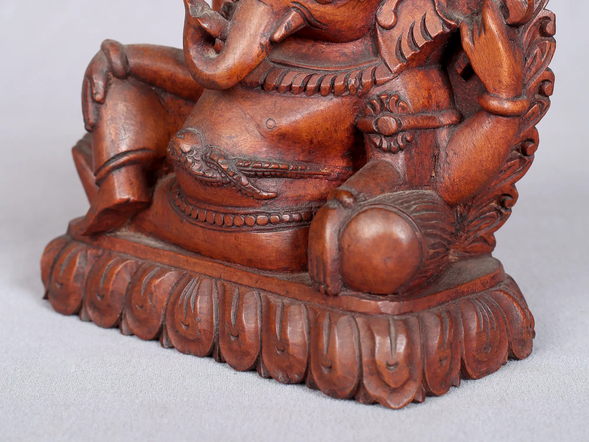 Crafted by skilled hands, this sacred wooden statue from Nepal exudes tranquillity and elegance. Ganesha, the benevolent deity, the harbinger of Success, reclines in divine repose, exuding an enchanting aura of serene omnipotence. A sinuous serpent lovingly enwreathed around his robust belly, symbolising his mastery over fear. Ganesha’s wooden form, richly adorned with ornate details, resonates with grace and grandeur. A regal crown graces his noble head, a tribute to his divine authority. This artwork embodies the very essence of serenity, a masterpiece of spiritual artistry.