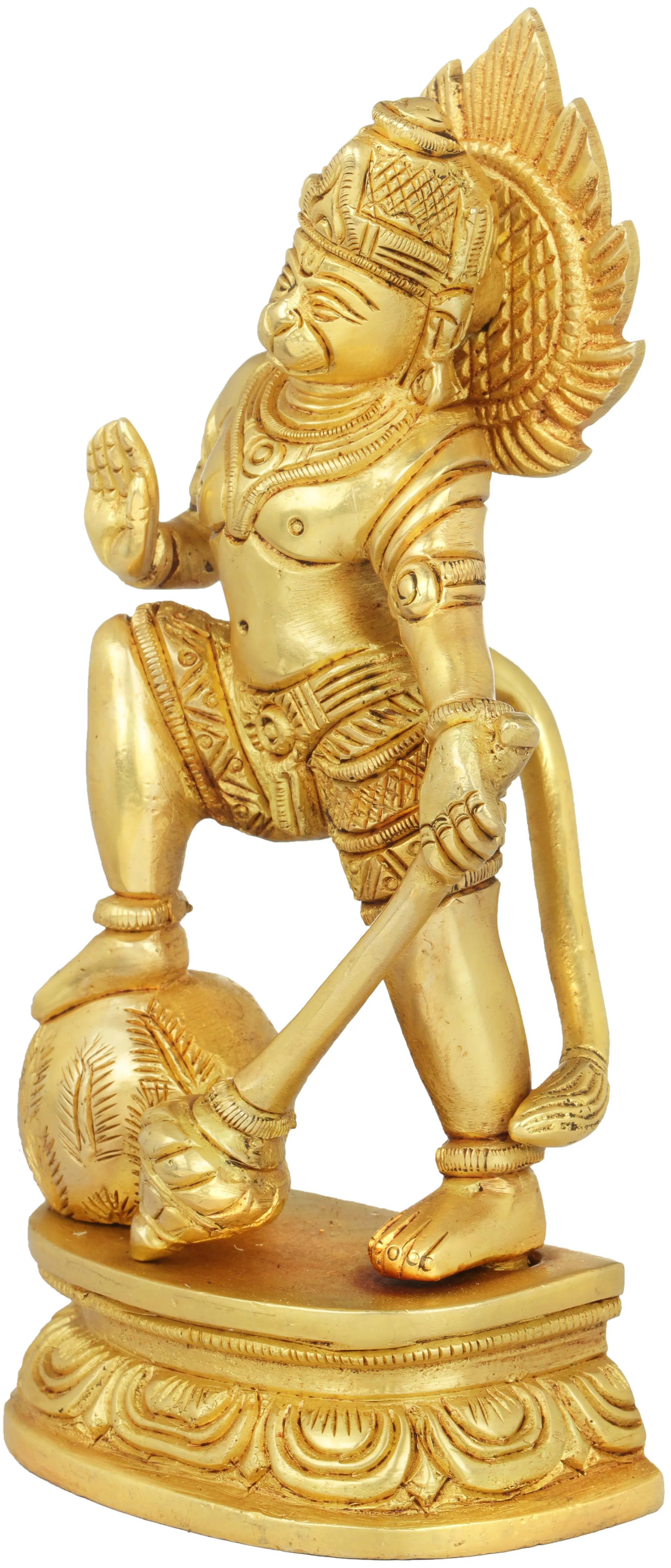 In Hinduism, Sankat Mochan Hanuman is a beloved deity, also known as the “Reliever of Troubles”. He is an embodiment of unwavering devotion, strength, and service. In this awe-inspiring form, Hanuman stands gracefully with his right foot placed on a sturdy stone, representing his steadiness and power. With a benevolent smile on his face, he exudes an aura of compassion and fearlessness. His right hand is held in the “Abhaya Mudra”, assuring protection to his devotees. In his left hand, he holds his formidable Mace, symbolizing his prowess and determination to overcome obstacles. Made with skilled artistry, the magnificent brass sculpture inspires devotees to overcome challenges and find solace in his divine presence.