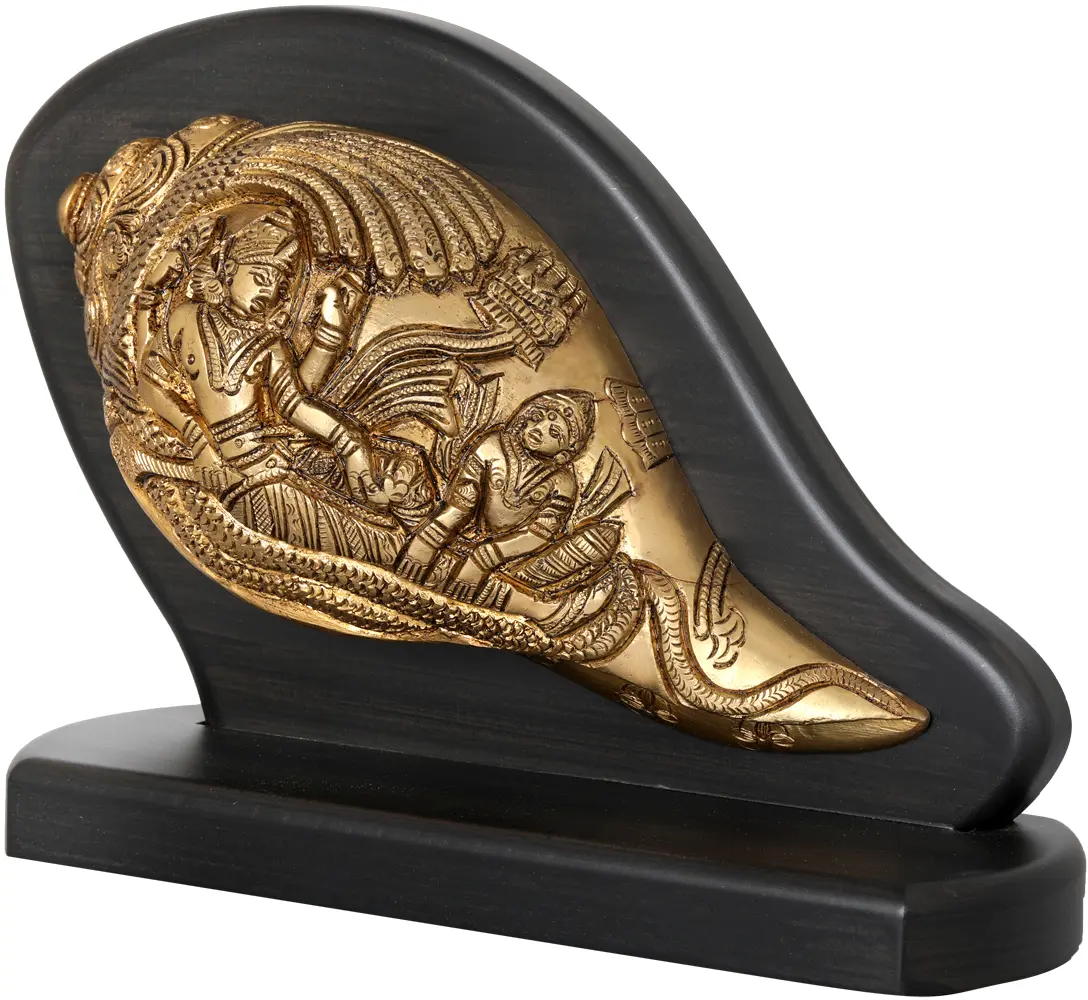This Sheshashayi Vishnu conch, meticulously crafted from brass and wood, invites tranquility on your car dashboard. Vishnu, reclining on the cosmic serpent, symbolizes the serene sustainer of the universe. His thousand-hooded protector, Adishesha, forms a canopy. The conch in Vishnu's hand resonates with the primordial sound, AUM, signifying creation's genesis. As the conch rests in your car, it becomes a voyage to inner calm amidst the world's chaos. A gentle nudge to find solace in your own sanctuary, even amidst the bustling highways.