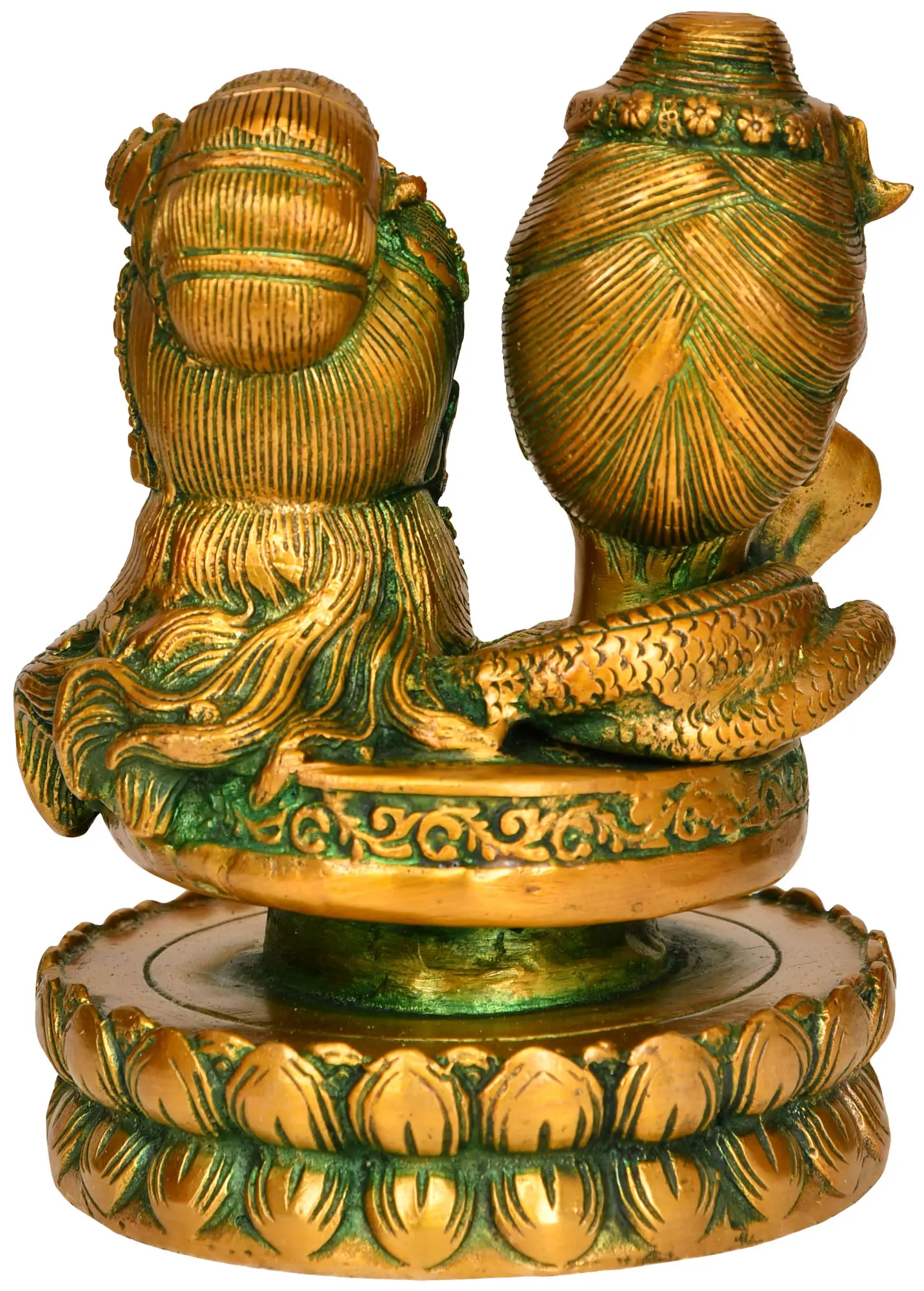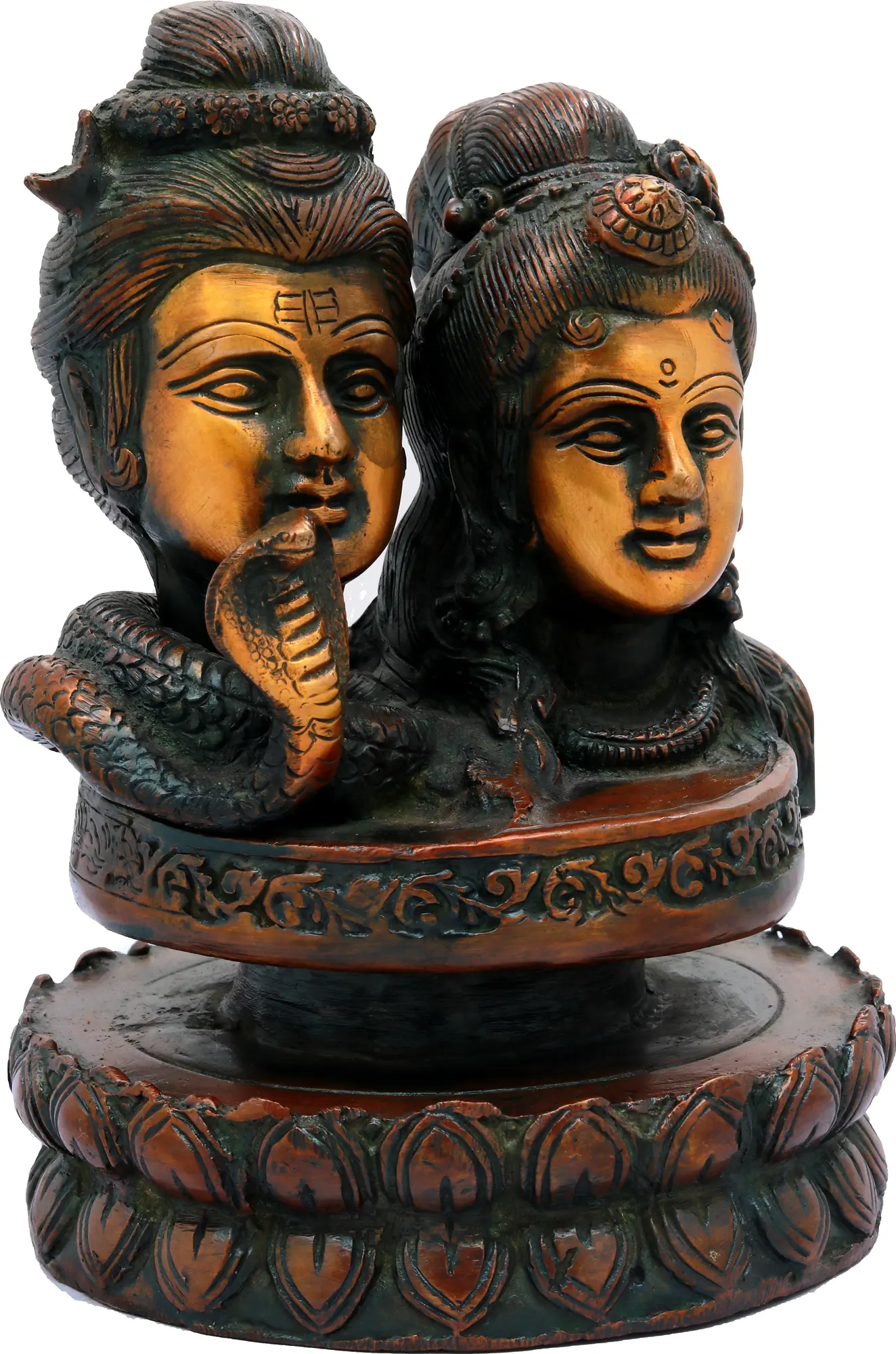This brass sculpture portrays the divine union of Shiva and Parvati in the form of a Shiva Linga. Shiva, the destroyer and creator, holds a trident, symbolizing his mastery over the three gunas (qualities) of nature. Parvati, the nurturing mother goddess, holds a lotus, signifying purity and enlightenment. The Shiva Linga represents the cosmic pillar, the source of all creation. As you contemplate this sculpture, it becomes a reminder of the balance between the masculine and feminine energies, the dance of creation and destruction, and the union of opposites that underlies all existence.
