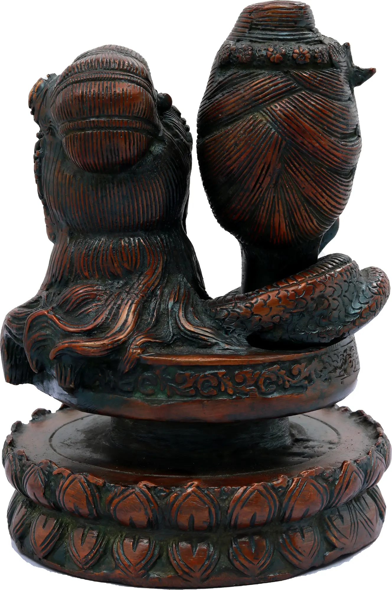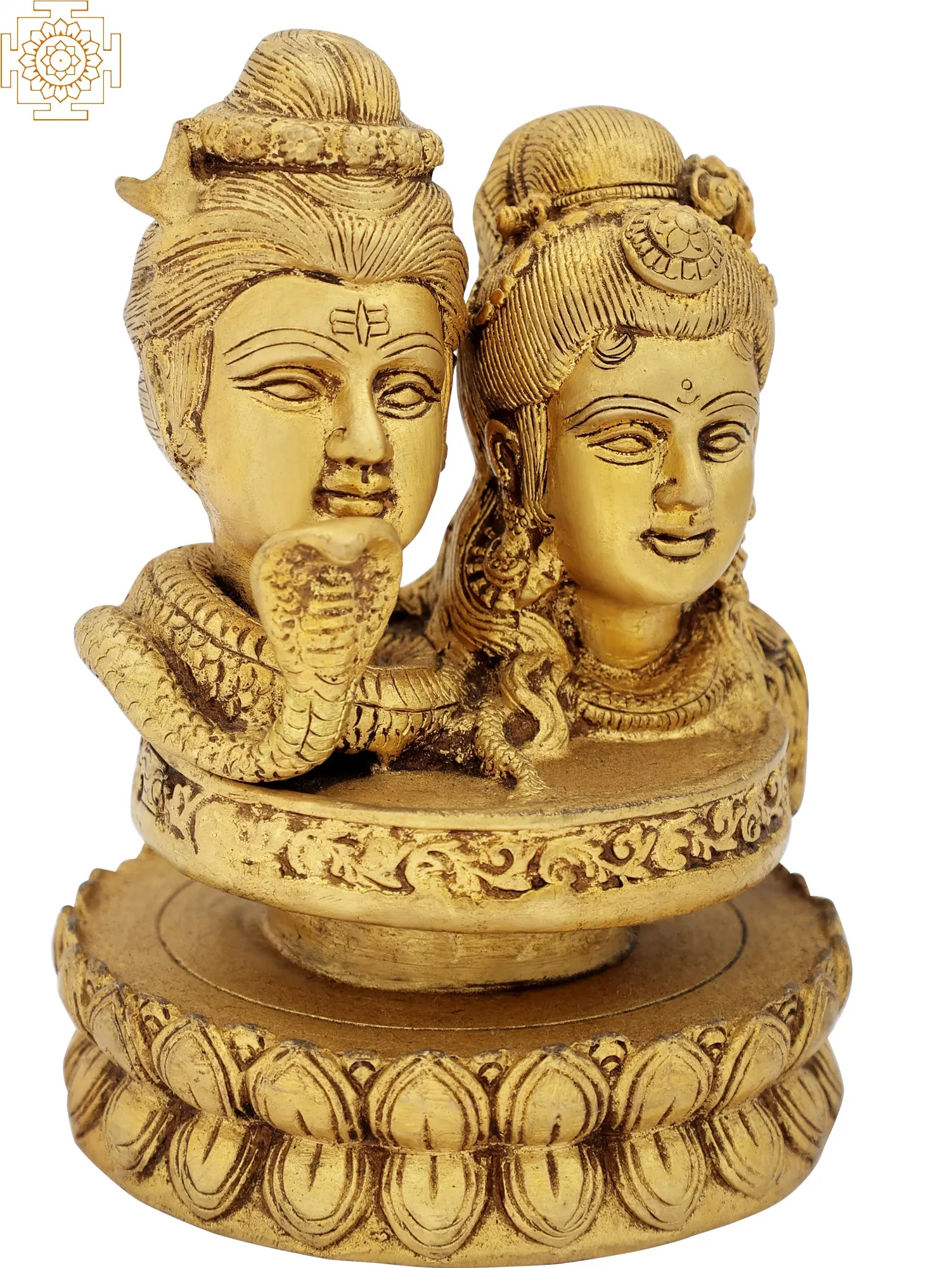 This brass sculpture portrays the divine union of Shiva and Parvati in the form of a Shiva Linga. Shiva, the destroyer and creator, holds a trident, symbolizing his mastery over the three gunas (qualities) of nature. Parvati, the nurturing mother goddess, holds a lotus, signifying purity and enlightenment. The Shiva Linga represents the cosmic pillar, the source of all creation. As you contemplate this sculpture, it becomes a reminder of the balance between the masculine and feminine energies, the dance of creation and destruction, and the union of opposites that underlies all existence.