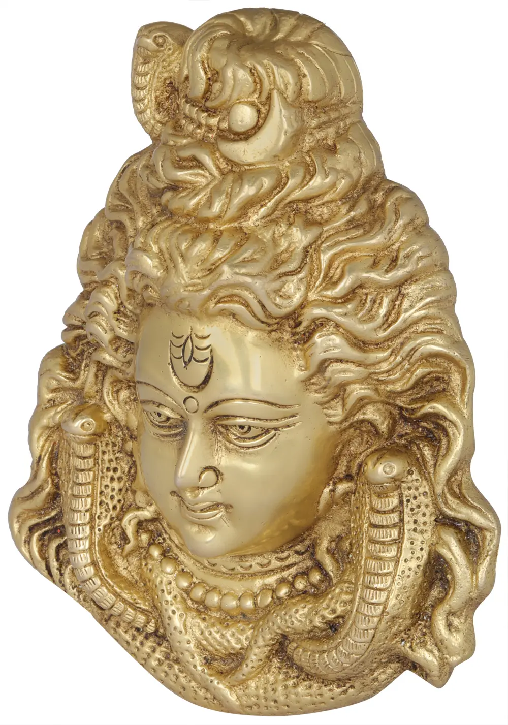 This wall hanging featuring Lord Shiva's elegant meditating visage emits a sense of peace. His matted locks flow like the Goddess Ganga, and a crescent moon rests delicately atop a mound of locks. The lofty bun was kept in form by a serpent coiling around it. His eyes were half-closed, indicating a contemplative condition, cementing his reputation as the Adi Yogi. Lord Shiva is wearing a chain of Rudrakshas and has two snakes wrapped around his neck. The calm depiction of Lord Shiva on this wall hanging can provide tranquility to the viewer.