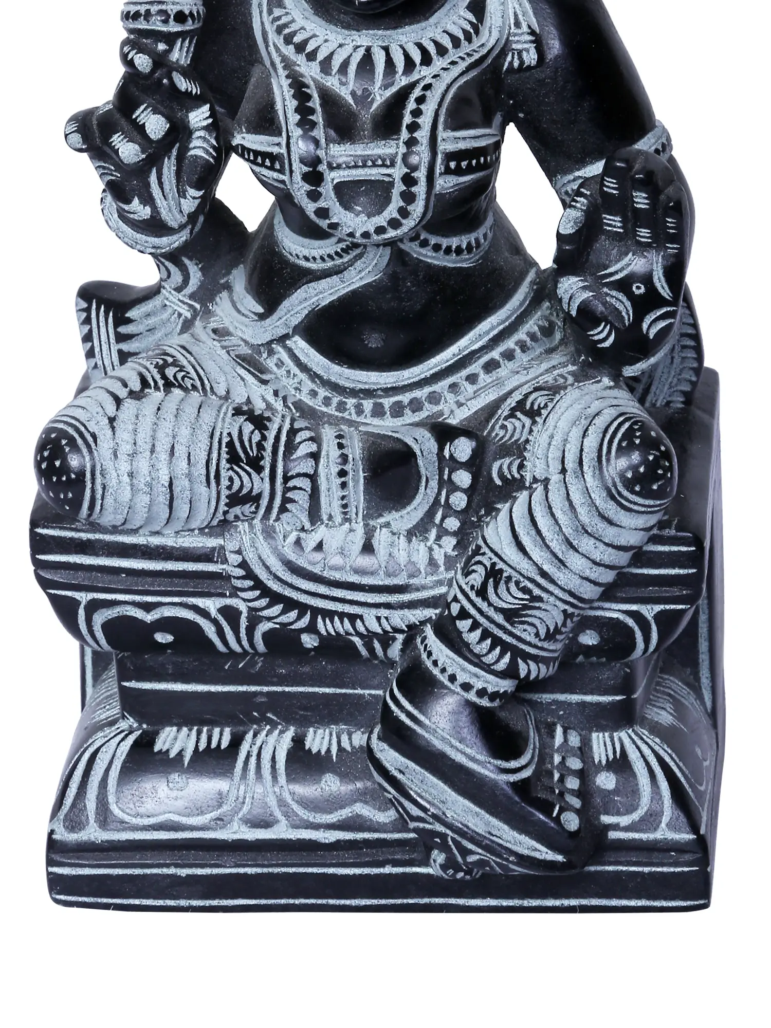 This exquisite stone statue captures the serene and powerful presence of Devi Parvati, the divine consort of Lord Shiva and the mother goddess in Hinduism. Carved with meticulous detail from the renowned stone quarries of South India, specifically from Mahabalipuram, a UNESCO World Heritage site celebrated for its ancient rock-cut temples and sculptures, this piece embodies centuries of artistic tradition. The dark, polished stone lends an air of timelessness and gravitas to the representation, while the contrasting incised white lines highlight the intricate ornamentation and divine form. Parvati, a principal deity in Hinduism, is revered for her boundless love, maternal compassion, and immense power. She is often depicted as the mother of Ganesha and Kartikeya, the embodiment of Shakti (feminine energy), and the patron of arts, music, and dance. Her mythology is rich and varied, with tales of her asceticism to win Shiva's heart, her fierce manifestation as Durga to protect the universe from demons, and her loving portrayal as the gentle mother. This statue captures her seated posture, exuding an aura of calm authority and nurturing grace.