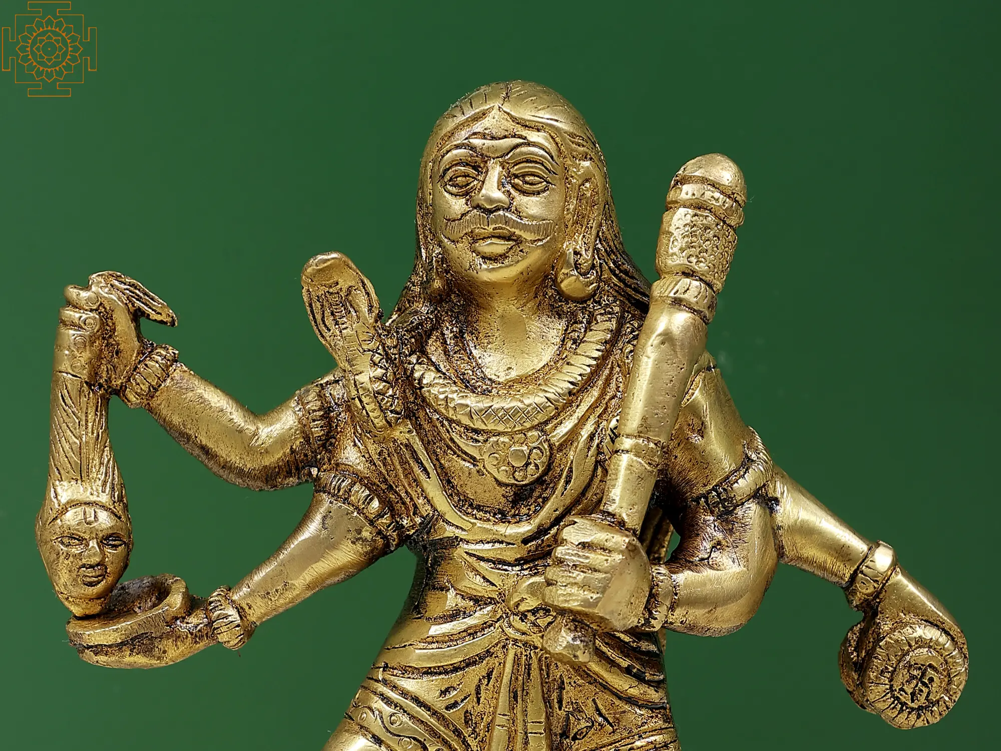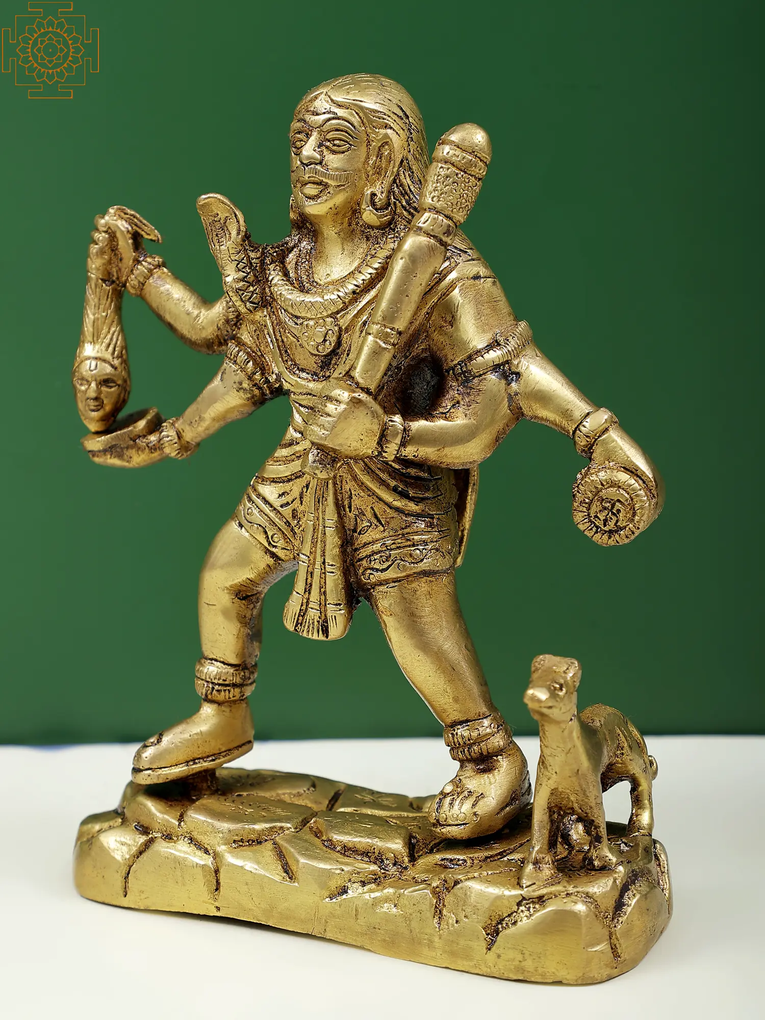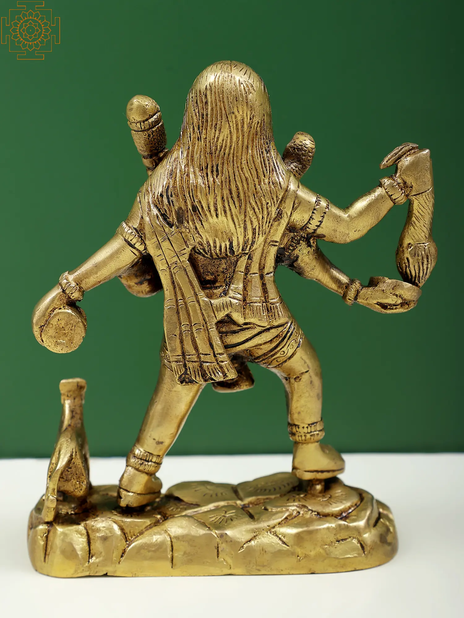 Bhairava adorns himself with a variety of entwined serpents, serving as earrings, bracelets, anklets, and sacred thread (yajnopavita). This fearsome yet compassionate manifestation of Shiva strides forward with his loyal canine companion and resonant damru drum. The canine symbolizes unwavering protection and steadfast devotion, while the drumbeat resonates the cosmic dance of creation and annihilation. The serpent coiled around the drum signifies the kundalini serpent, awakening the dormant embers of spiritual awareness. Lord Bhairava's brass form, akin to a radiant flame in the darkness, illuminates the intricate and diverse nature of the deity, embodying both the destructive and creative forces of the universe.