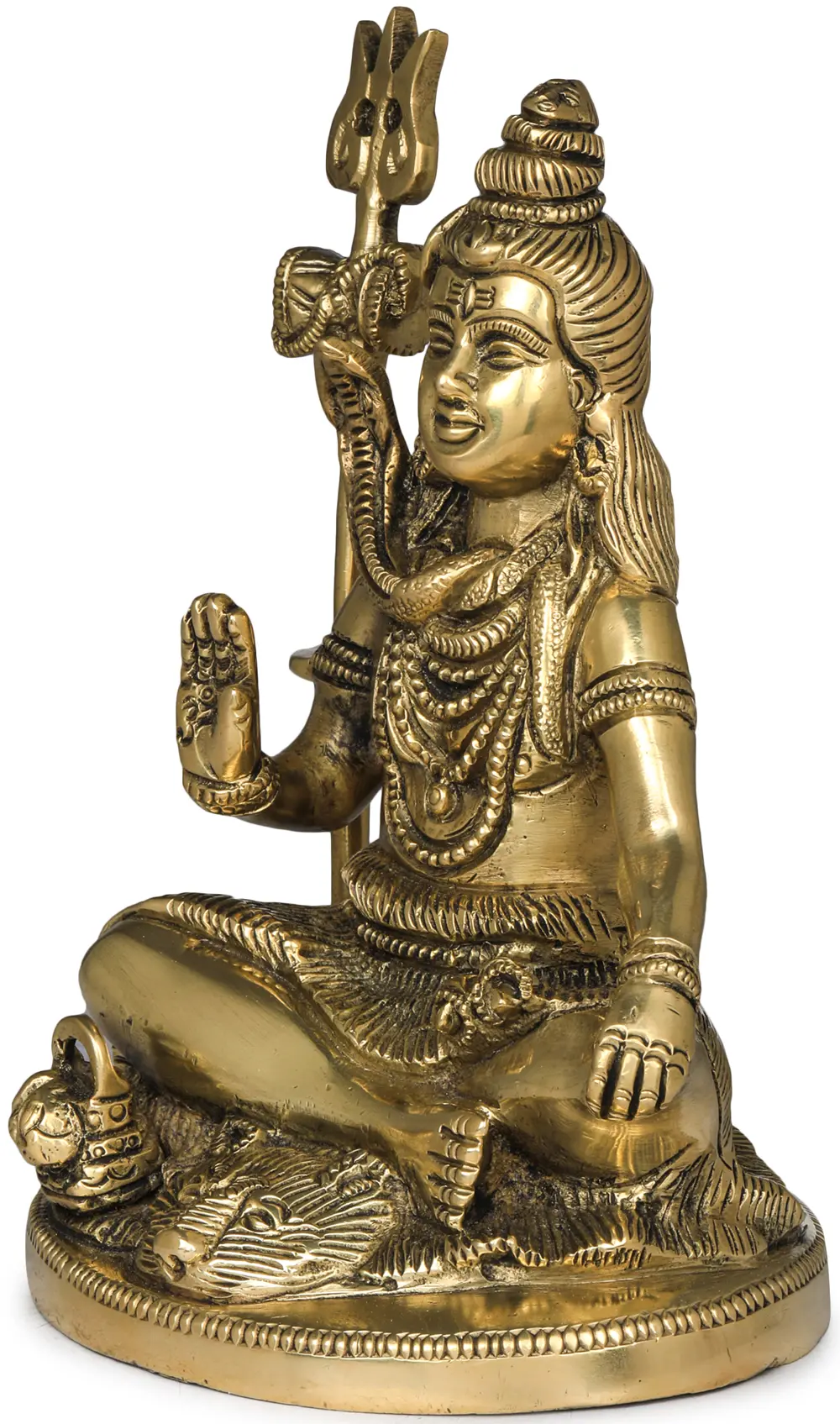 Invite the presence of the benevolent deity, Lord Shiva, into your sacred space with this exquisite brass sculpture. Crafted with meticulous attention to detail in India, this piece embodies the divine grace and powerful aura of the Mahadeva. Lord Shiva, revered as the destroyer and transformer, is a central figure in Hinduism, representing the cycle of creation, preservation, and destruction that governs the universe. His serene countenance, depicted in this sculpture, offers a sense of peace and spiritual grounding. The tranquil posture of Shiva, seated in a meditative pose, invites contemplation and inner reflection. His eyes, seemingly closed, suggest a deep immersion in transcendental consciousness. Adorned with a majestic crown, a serpent coiled around his neck symbolizing control over primal energies, and intricate bead necklaces, each element of this sculpture is a testament to Shiva's divine attributes. The trident, or Trishul, held upright, is a potent symbol of his power to destroy ignorance and evil, while also representing the three gunas (Sattva, Rajas, Tamas) that compose the material world.