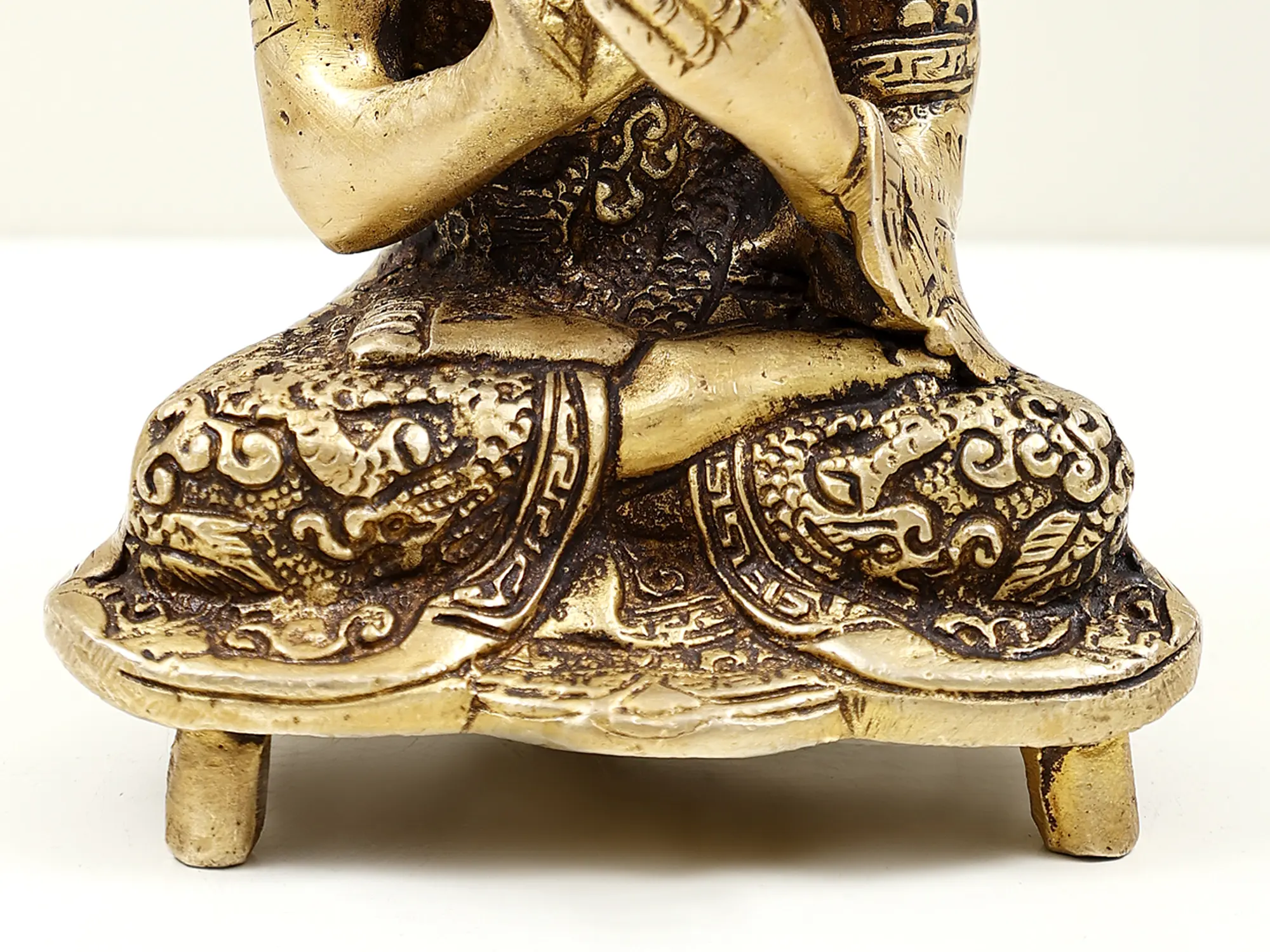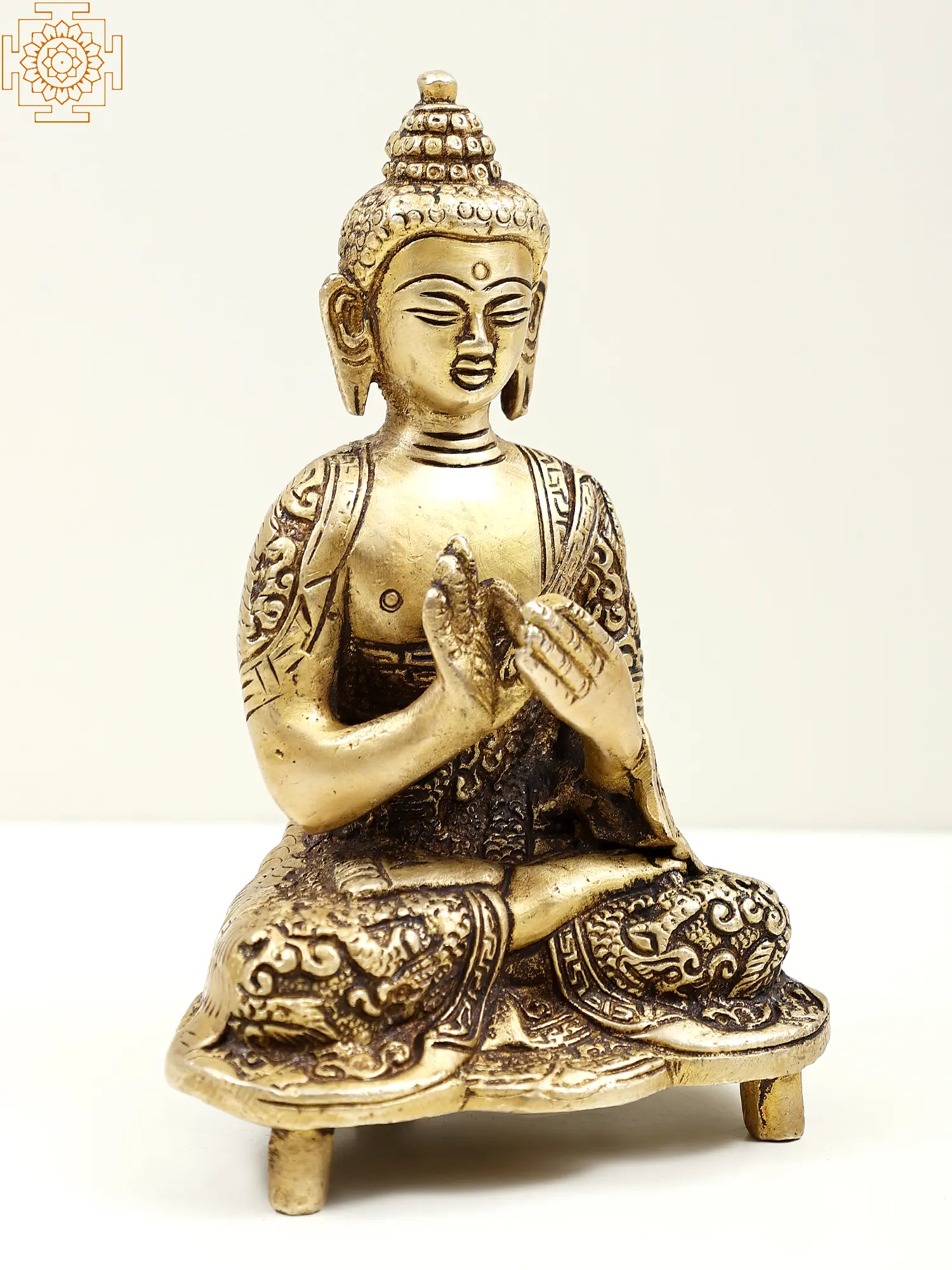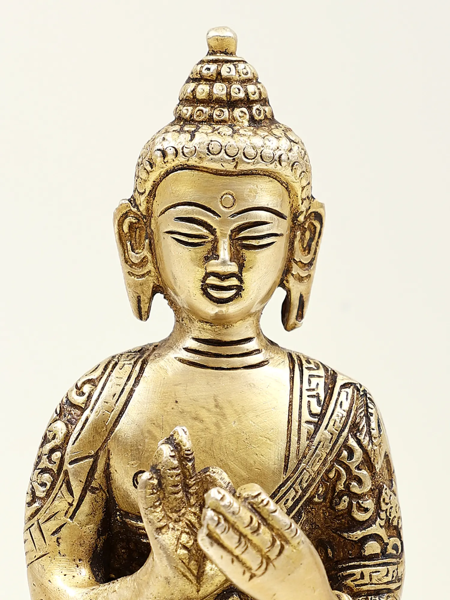The Small Brass Buddha, caught in the Dharmachakra Mudra, beckons us to follow the path of righteousness. His hand gesture signifies the turning of the wheel of dharma, setting teachings into motion. Within his eyes, enlightenment's flame burns, inviting us to illuminate our own journey. Crafted in brass, this sculpture becomes a companion for self-discovery. As Buddha's gaze meets ours, we find solace in his presence, a reminder that enlightenment is not a destination but a transformative journey. Within his serene countenance, we hear the whisper, The way is not in the sky. The way is in the heart.