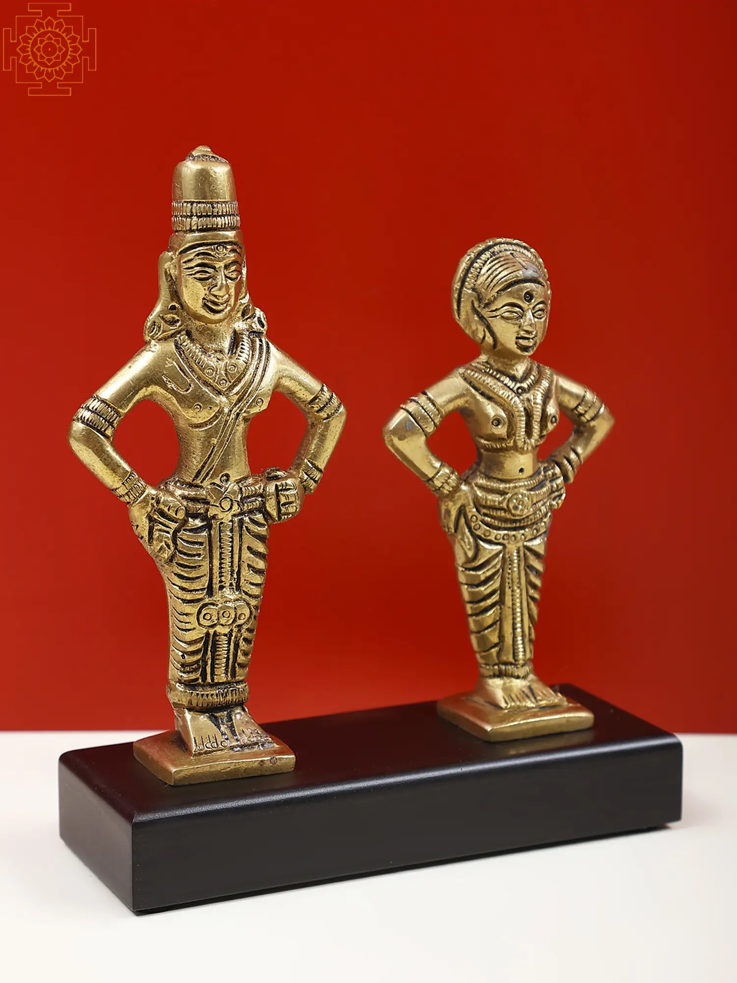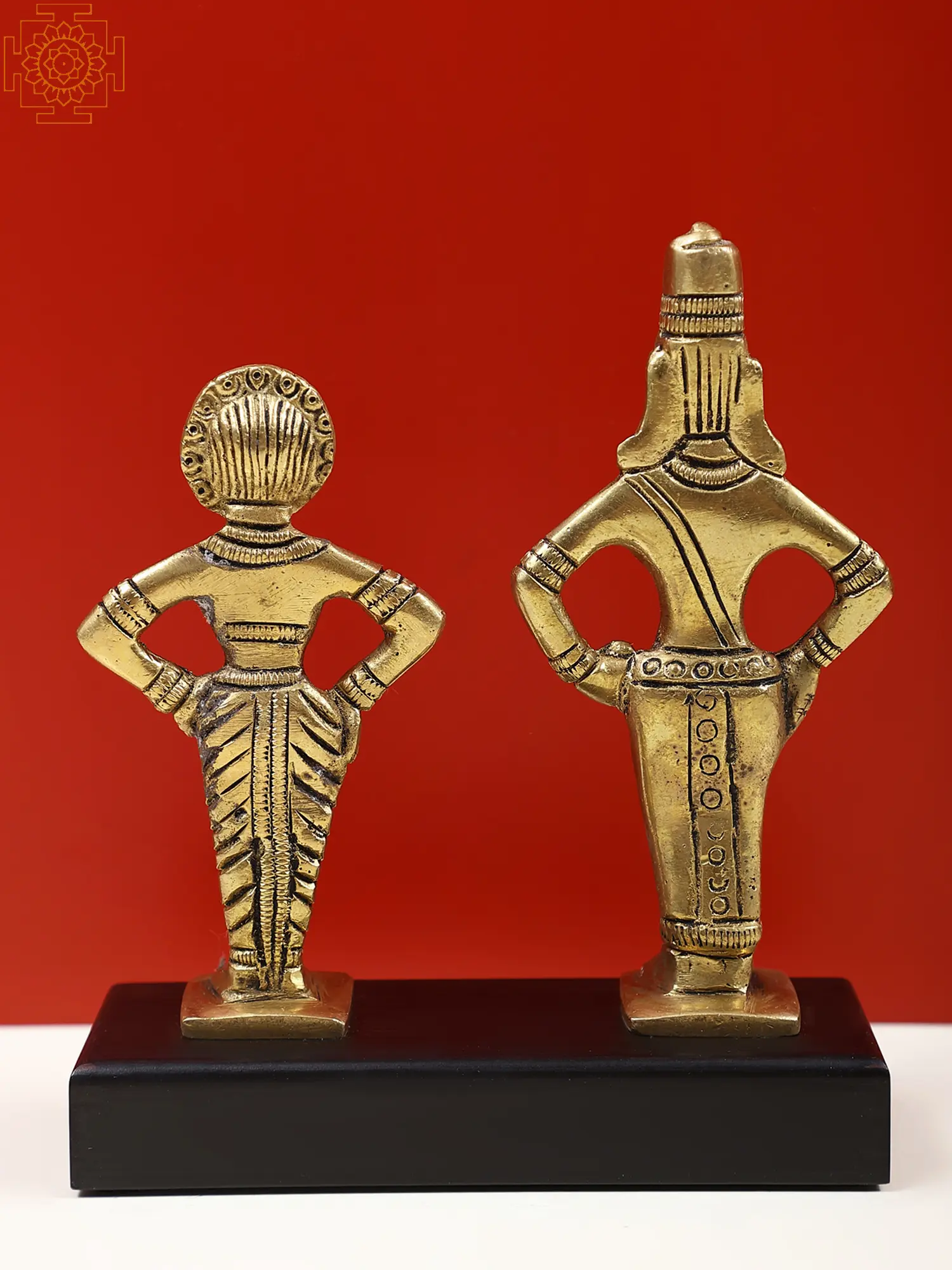 "Love's embrace, eternally entwined." This stunning brass sculpture depicts Lord Vitthal and Rukmini, embodiments of divine love. Lord Vitthal, an incarnation of Vishnu, stands humbly with a brick, signifying his accessibility to devotees of all walks. Rukmini, his divine consort, holds a lotus, symbolizing purity and devotion. Their joined hands represent an eternal bond of love, a testament to the enduring harmony between soulmates. Set upon a wooden pedestal, they become an embodiment of unwavering love and partnership, inspiring us to nurture and cherish the precious bonds in our lives.