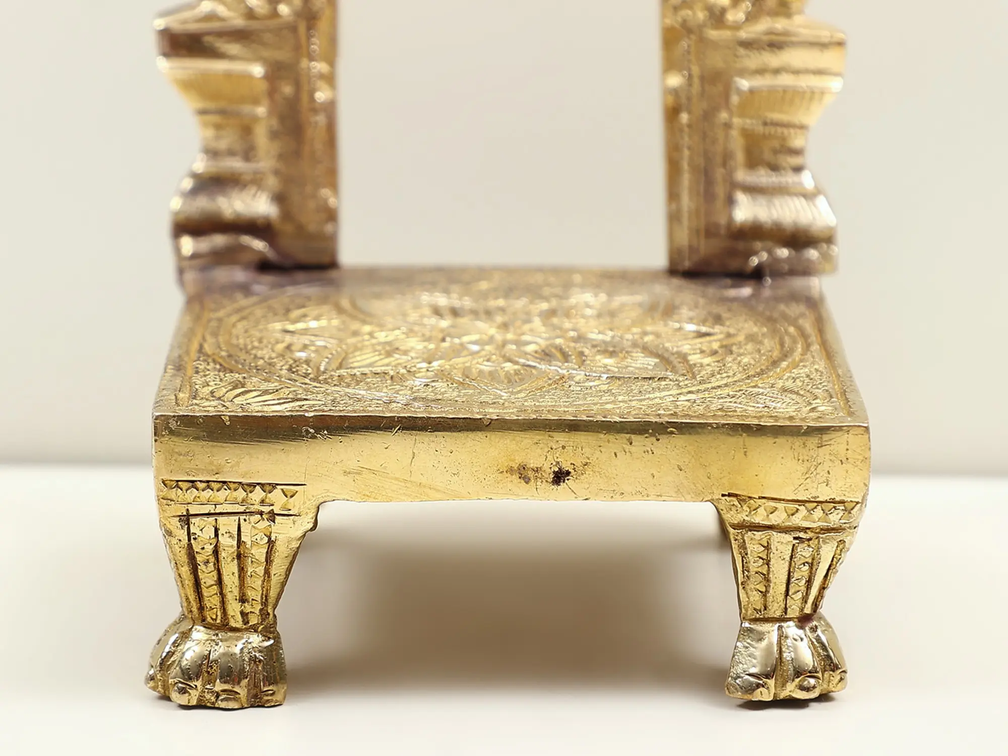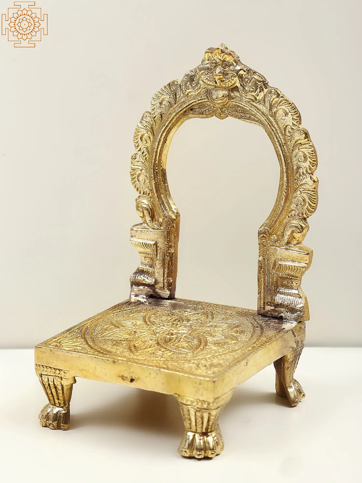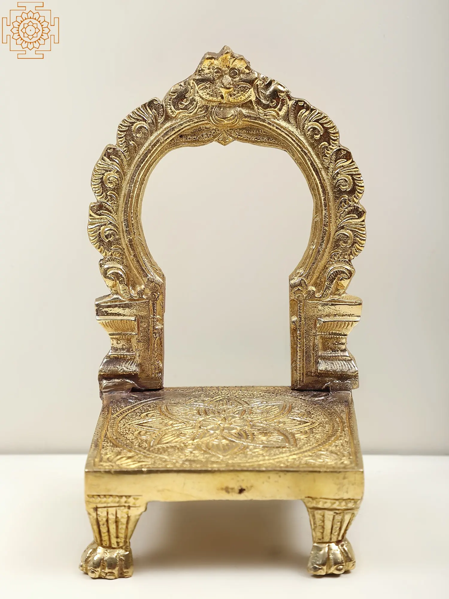 Standing tall, the brass throne adorned with a Kirtimukha Prabhavali exudes a resplendent aura. The intricate throne symbolizes the pinnacle of accomplishment and perseverance. Kirtimukha, a mythic creature, represents overcoming challenges with fortitude. The prabhavali, or aureole, signifies the divine grace that envelops triumphant efforts. It frames a sacred space, inviting one to seek higher realms of achievement. This sculpture's craftsmanship captures the essence of reaching for the heavens, a reminder that embracing challenges can lead to a realm of unprecedented glory and spiritual enrichment.