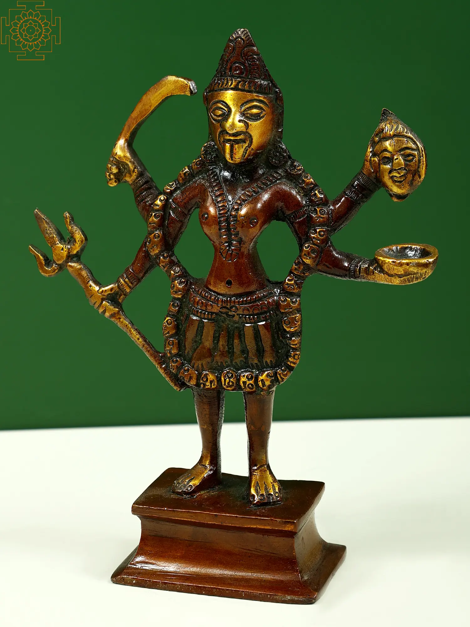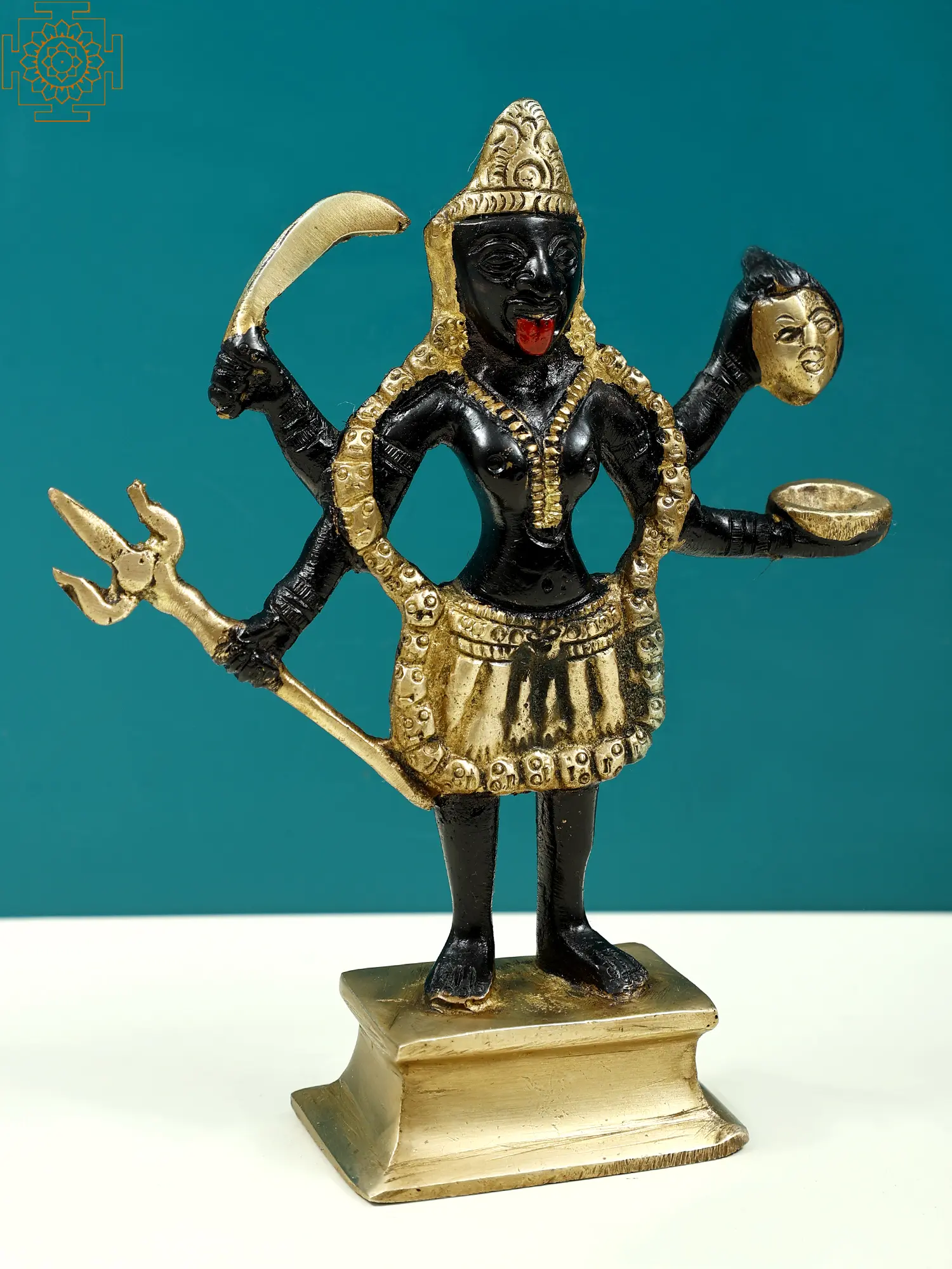 The Chaturbhuja Kali brass sculpture creates an atmosphere of empowerment and protection. Whether put on a holy altar, meditation room, or as a focal point in your house, it serves as a constant reminder of the divine feminine transformative power and your own inner strength. With her untamed hair flowing freely and her tongue protruding, the Chaturbhuja Kali depicts the Devi in her classic form. She is pictured wearing a garland of demon heads, symbolizing her victory over Moha (humane attachment) and Maya (misbelief). Her four arms are adorned with weaponry specially designed for her to combat the devils who lead the human race astray from the path of enlightenment.