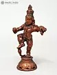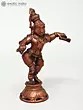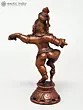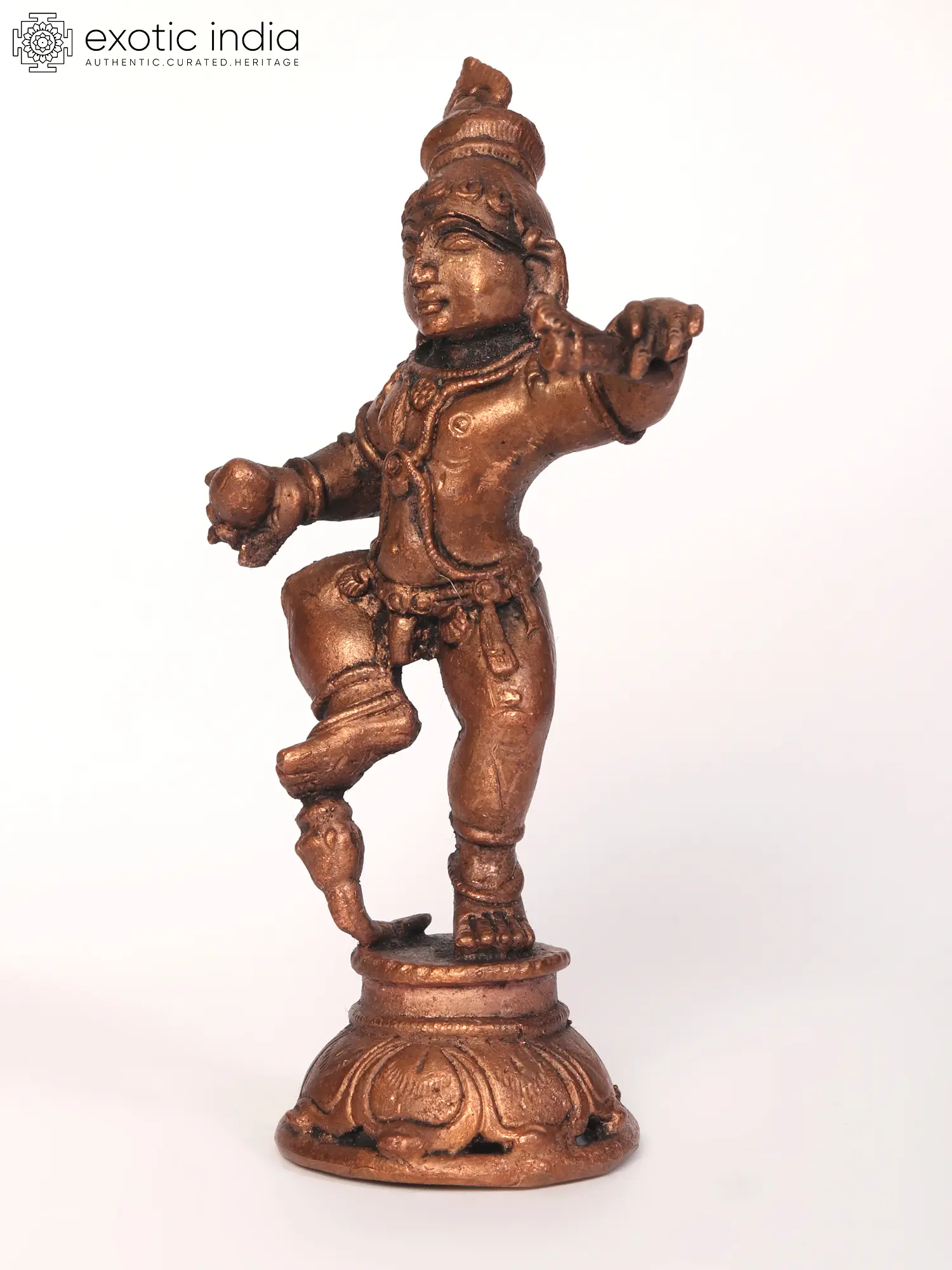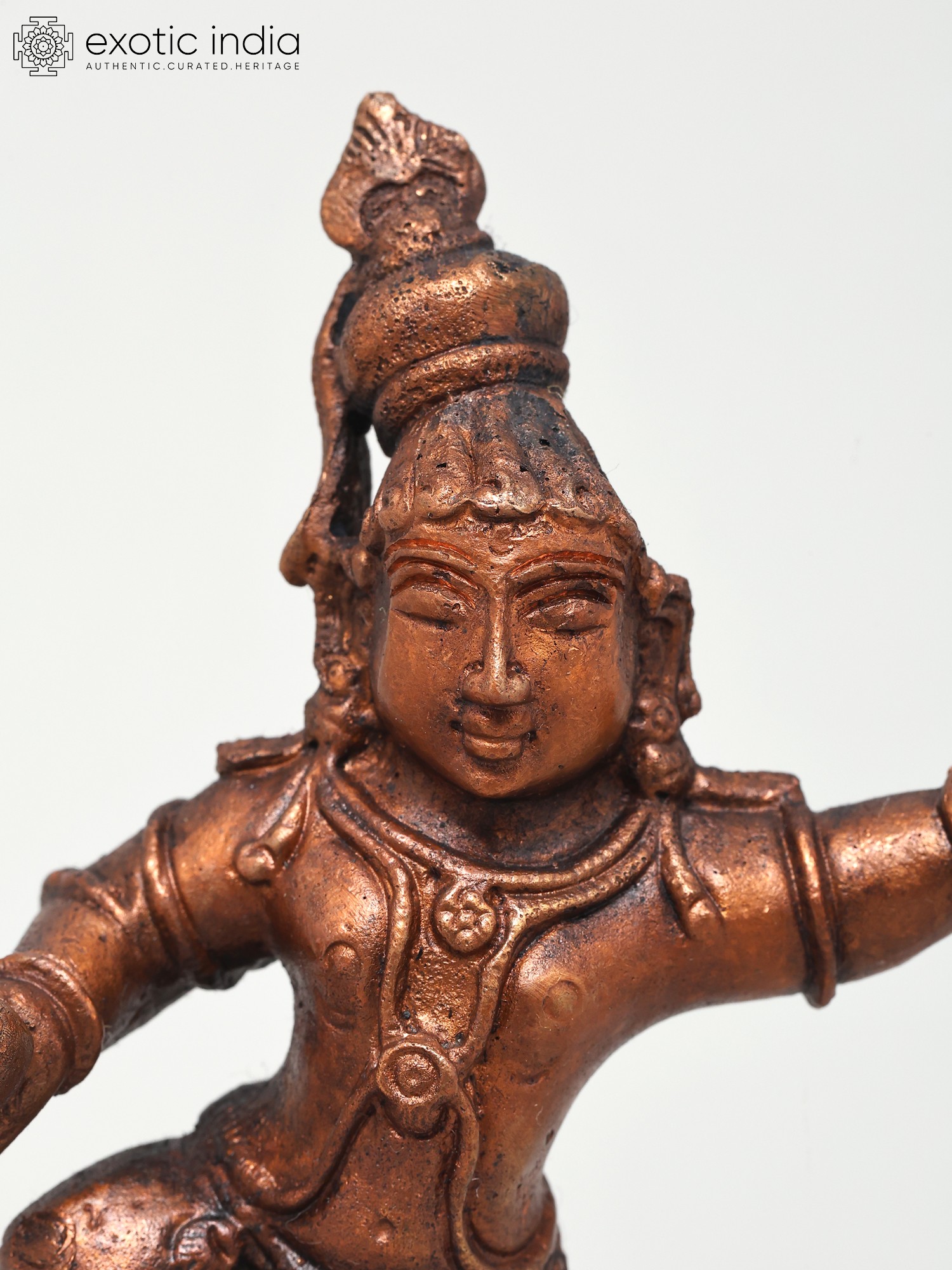 Sri Krishna is often referred to as "Natawara" among Hindus in India, which literally means "the excellent dancer." The ecstatically holy dance that the dark-skinned God did on the heads of the serpent Kaliya earned him this moniker. This lovely hand-crafted copper dancing Krishna statue pays homage to Krishna, from whose movement the classical Indian dance style "Kathaka" gets inspiration. It replicates Krishna's energetic movements as recounted in the Puranas and local traditions. Exuding beauty, Bal-Krishna dances in an animated mood, while a lotus bud, symbolizing the origination of the Universe, is placed under his upraised foot, underlining his majesty as the source of the Srishti and its splendor.
