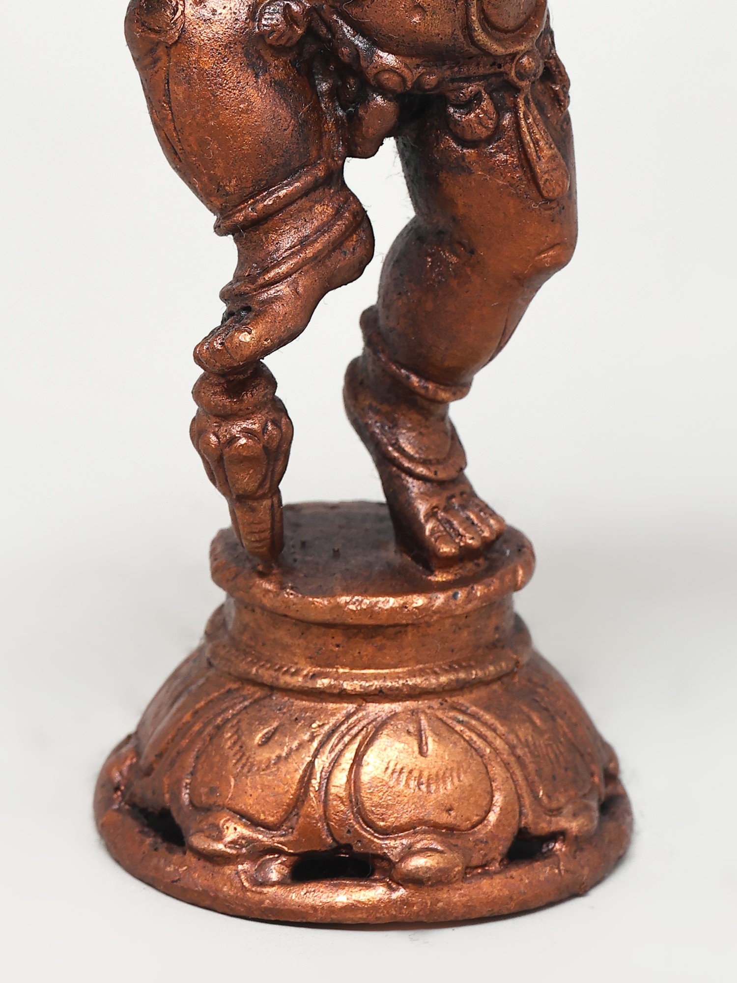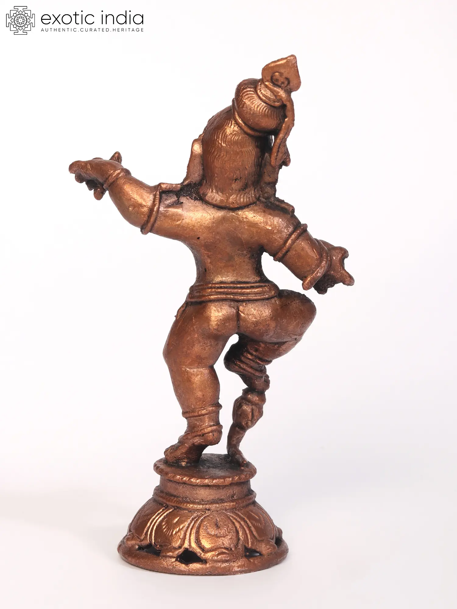 Behold a captivating representation of Krishna, the beloved Hindu deity, caught in a moment of eternal bliss. This exquisitely crafted copper statue depicts the youthful Krishna in his characteristic dancing pose, radiating joy and boundless energy. The statue captures the essence of Krishna's playful nature, making it a vibrant addition to any sacred space or collection. Every detail, from the delicate jewelry adorning his form to the intricate folds of his garments, is rendered with exceptional care and artistry. The statue stands at 5.5 x 3.2 x 1.8 inches, a size that brings the beauty and spiritual richness of Hindu tradition into your home.