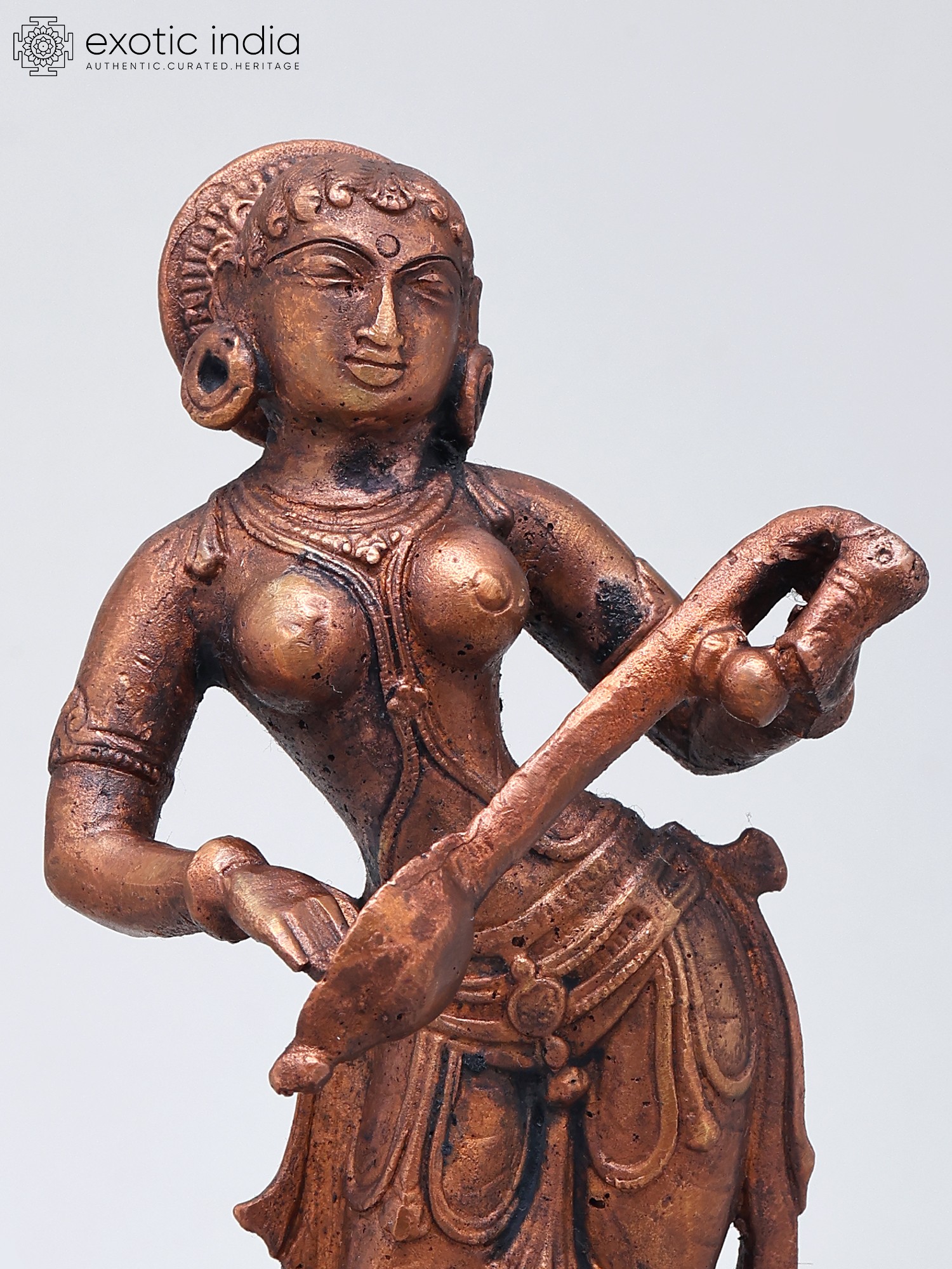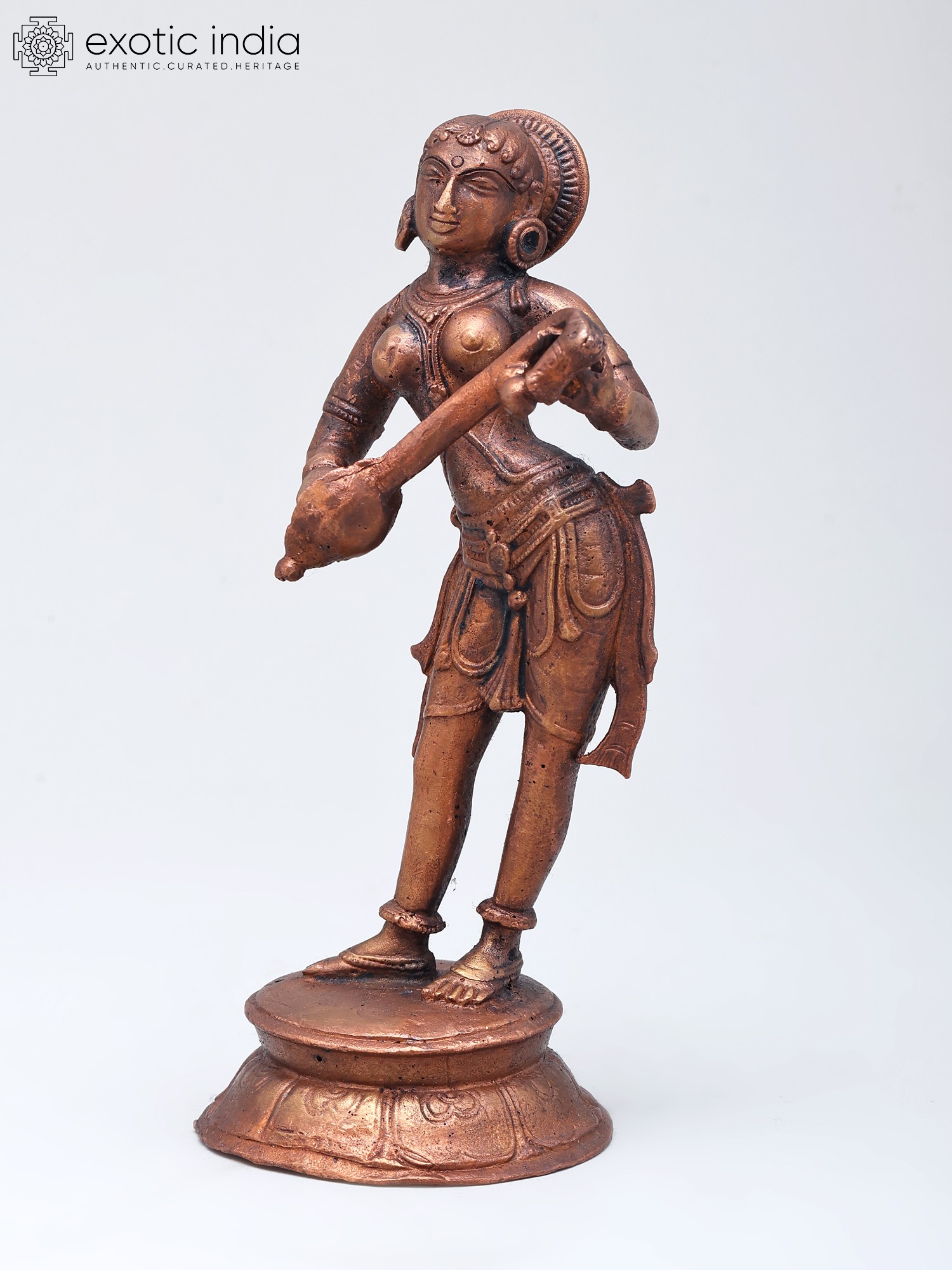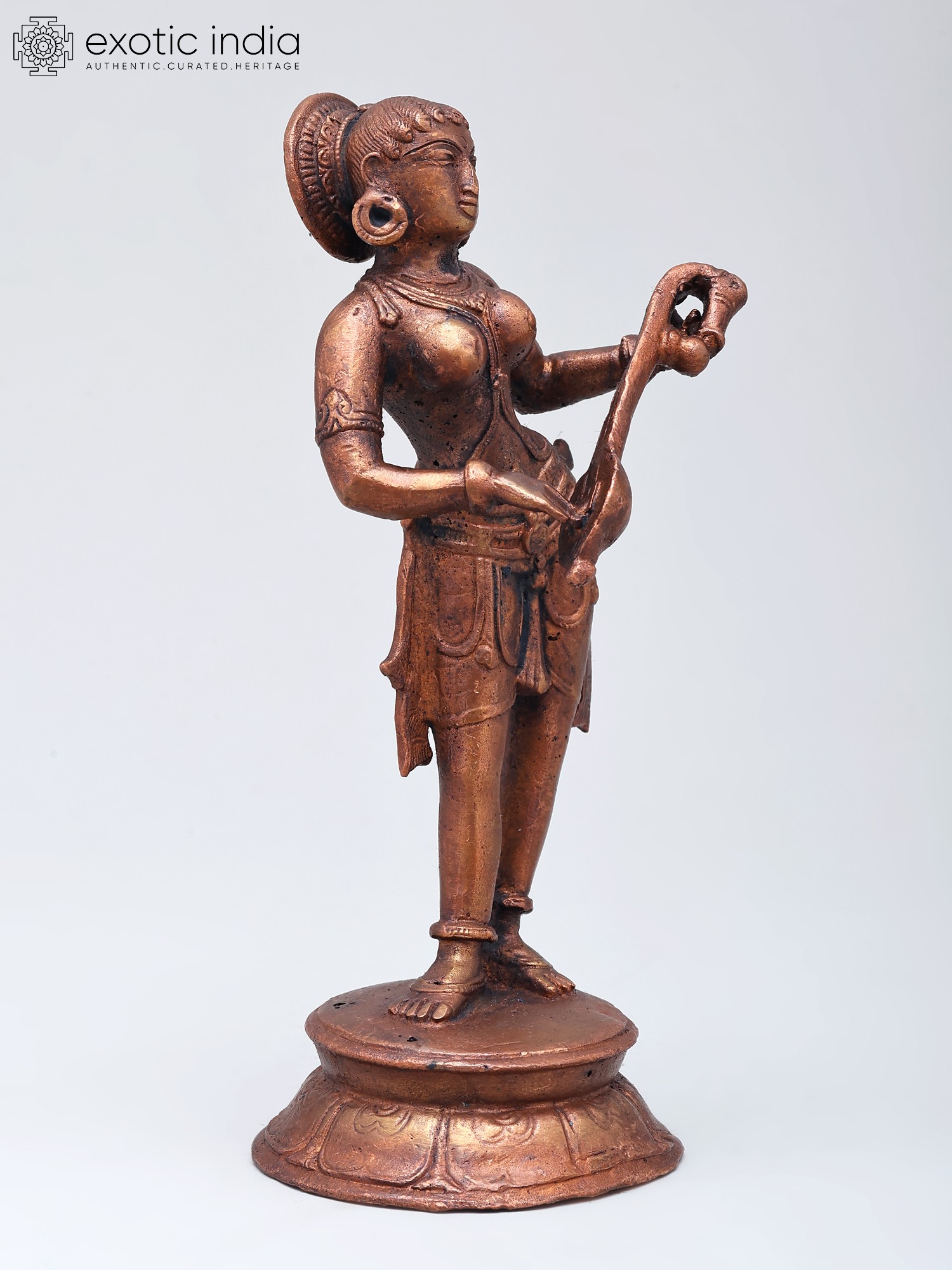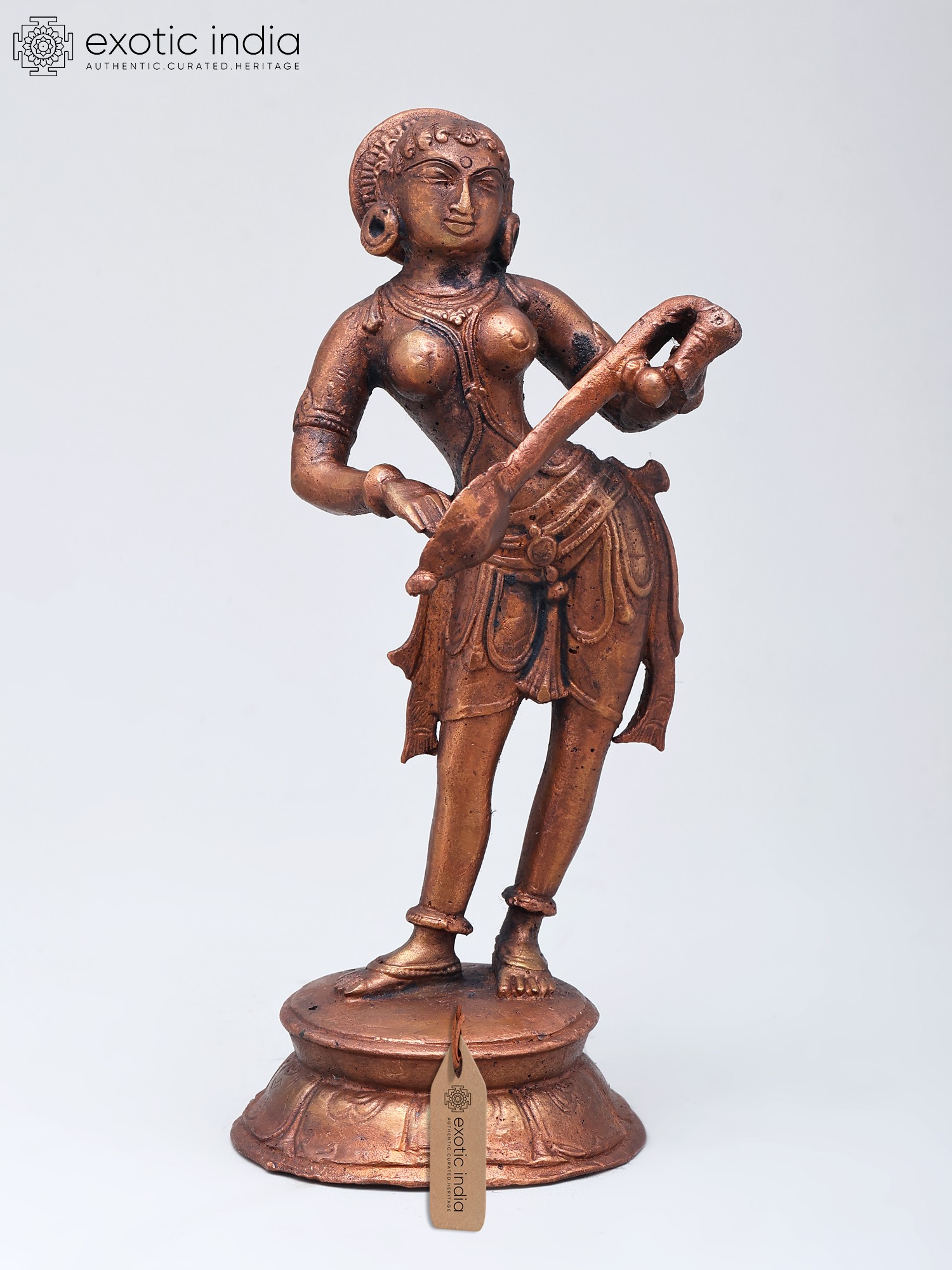 Apsaras, celestial nymphs in Hindu tradition, are celebrated as knowers of various arts, embodying grace and artistic prowess. This Small Apsara Playing Musical Instrument Copper Statue beautifully encapsulates this concept. Depicting an Apsara in tribhanga pose, holding a veena, it radiates elegance and artistic finesse.