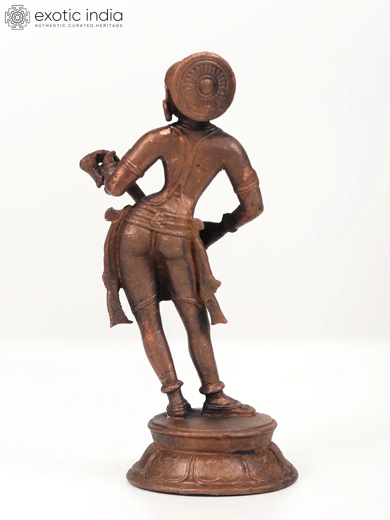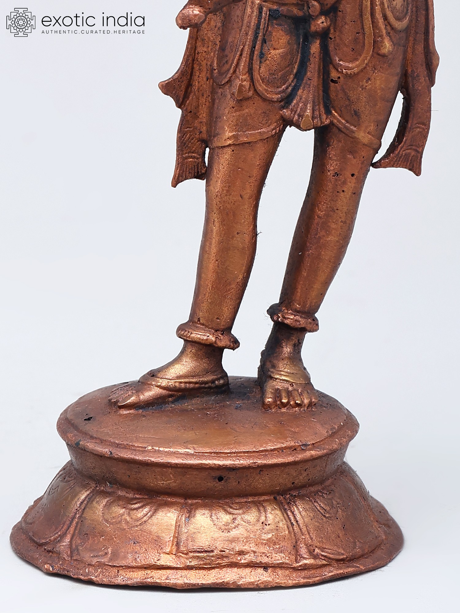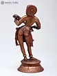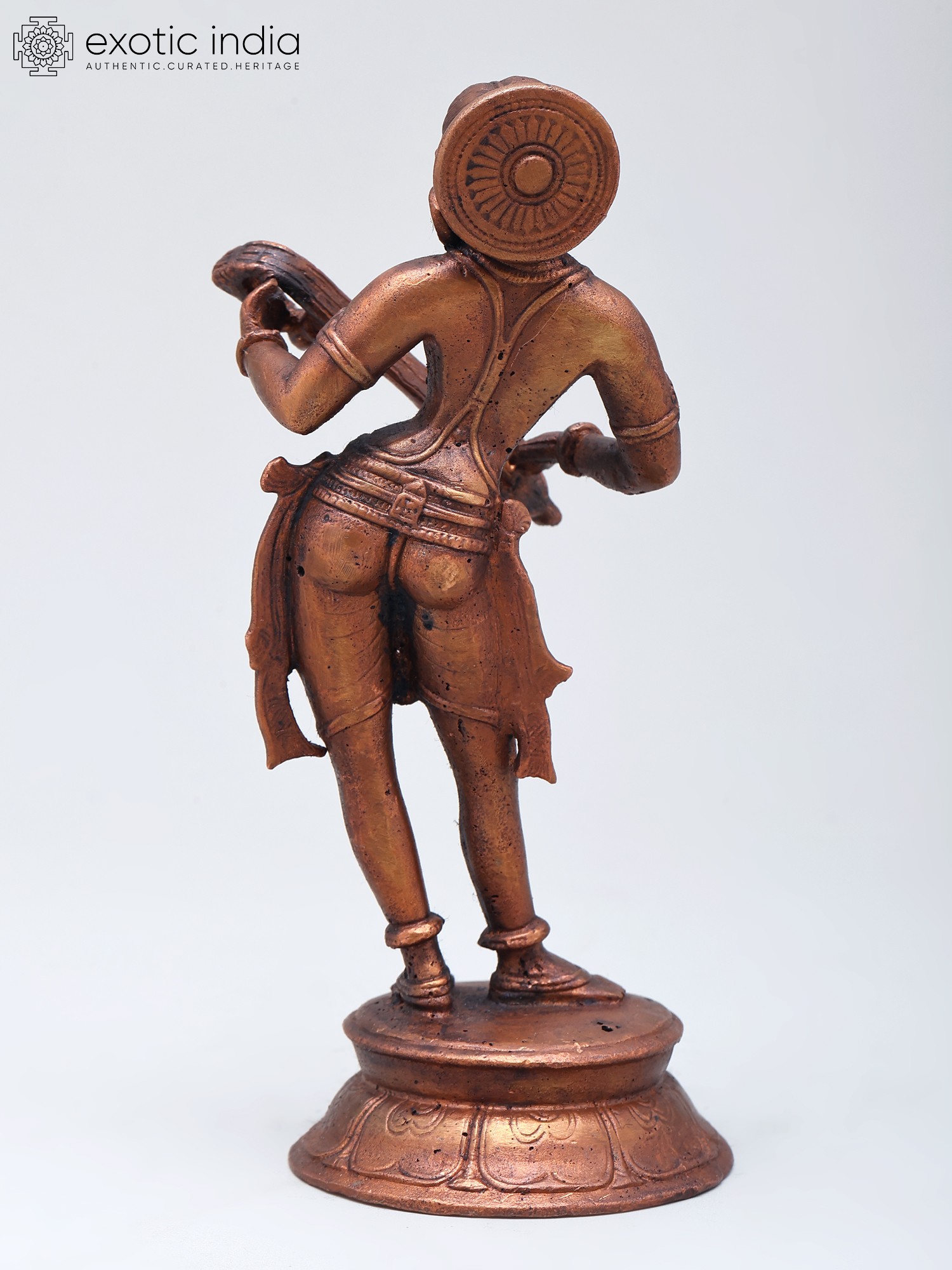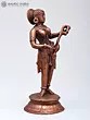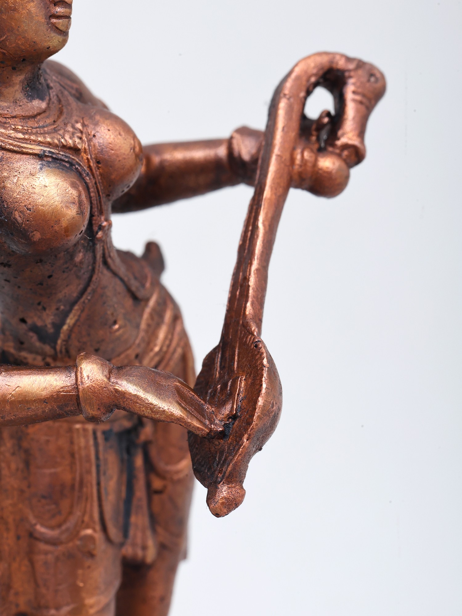 Apsaras, celestial nymphs in Hindu tradition, are celebrated as knowers of various arts, embodying grace and artistic prowess. This Small Apsara Playing Musical Instrument Copper Statue beautifully encapsulates this concept. Depicting an Apsara in tribhanga pose, holding a veena, it radiates elegance and artistic finesse.