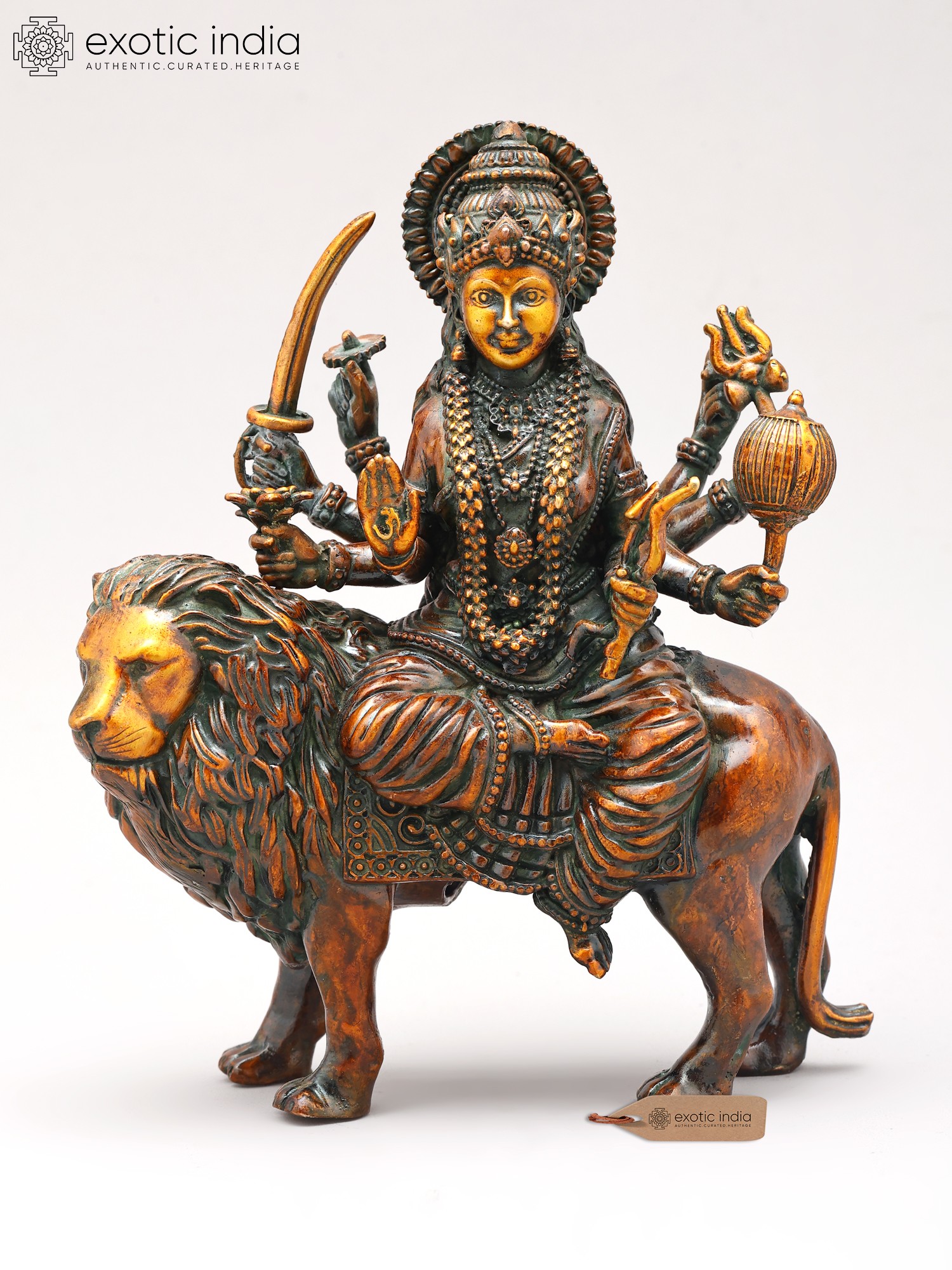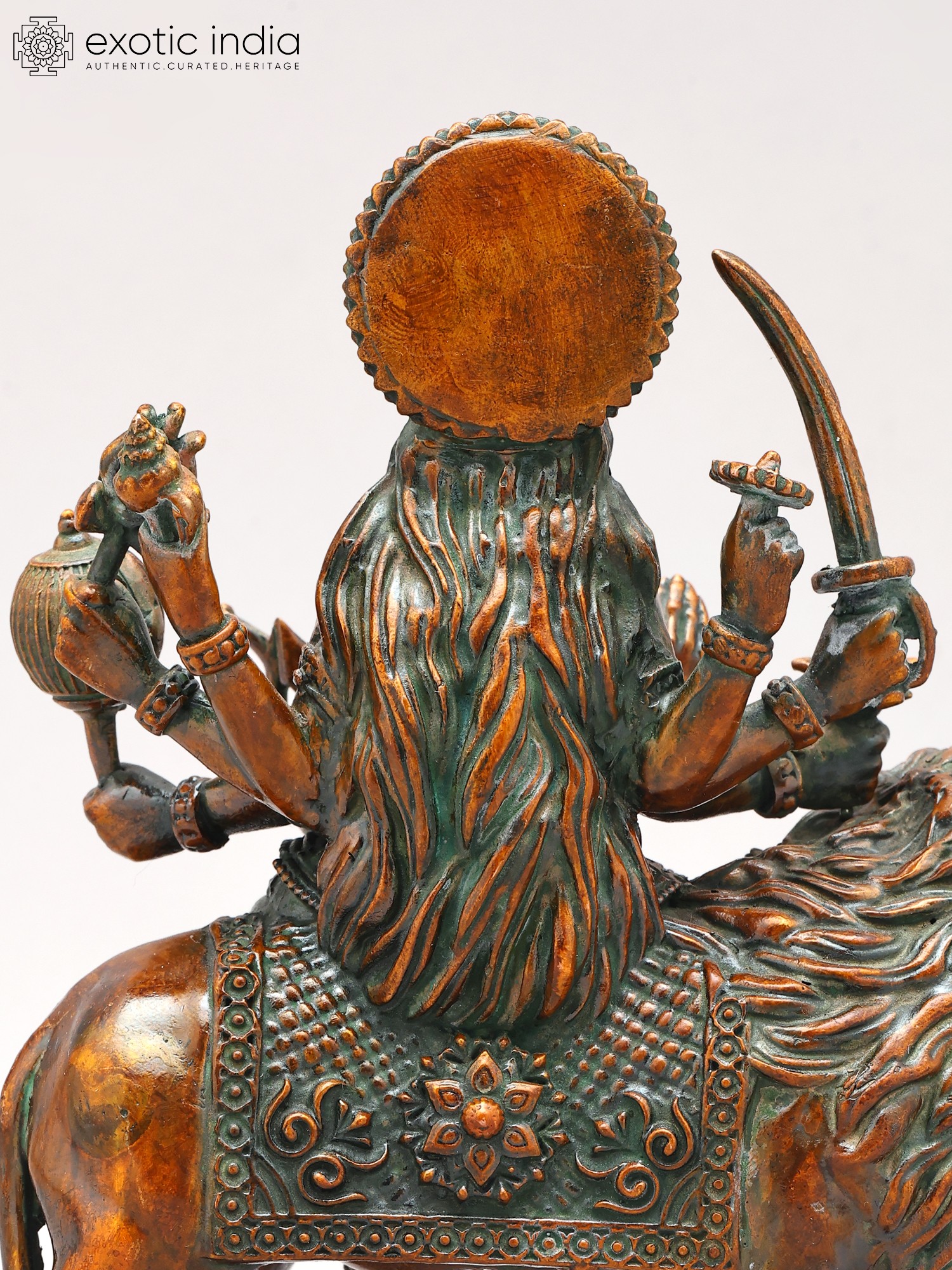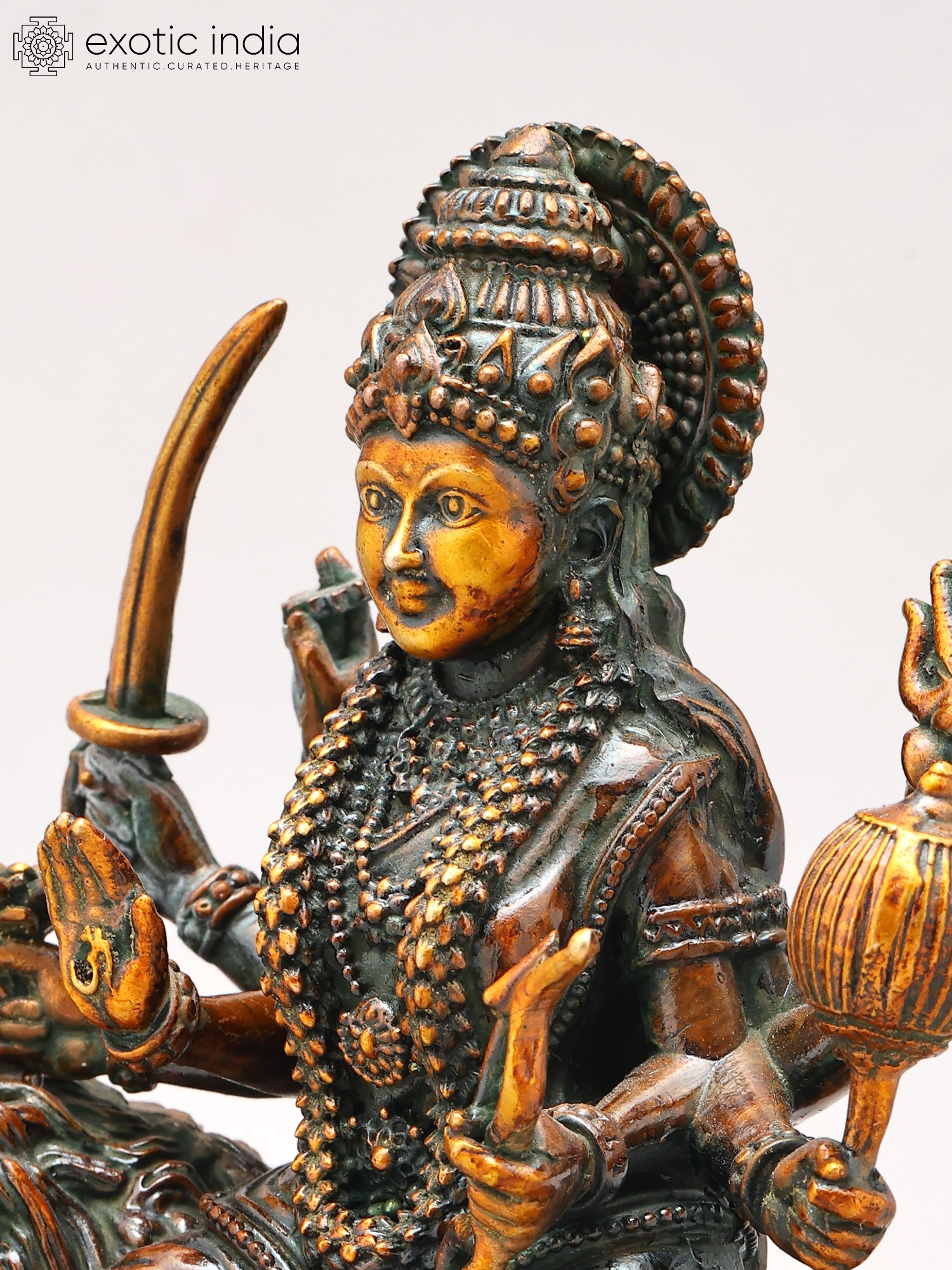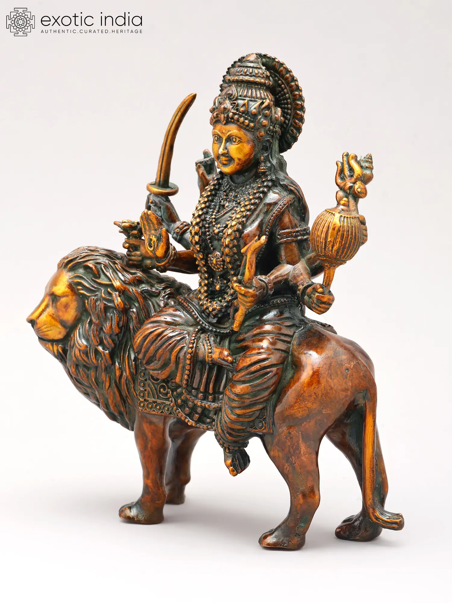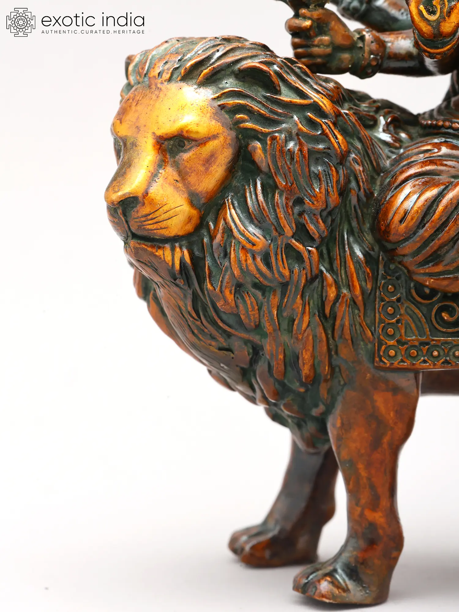 6" Small Eight Armed Goddess Durga Seated on Lion | Copper Statue | Made in India