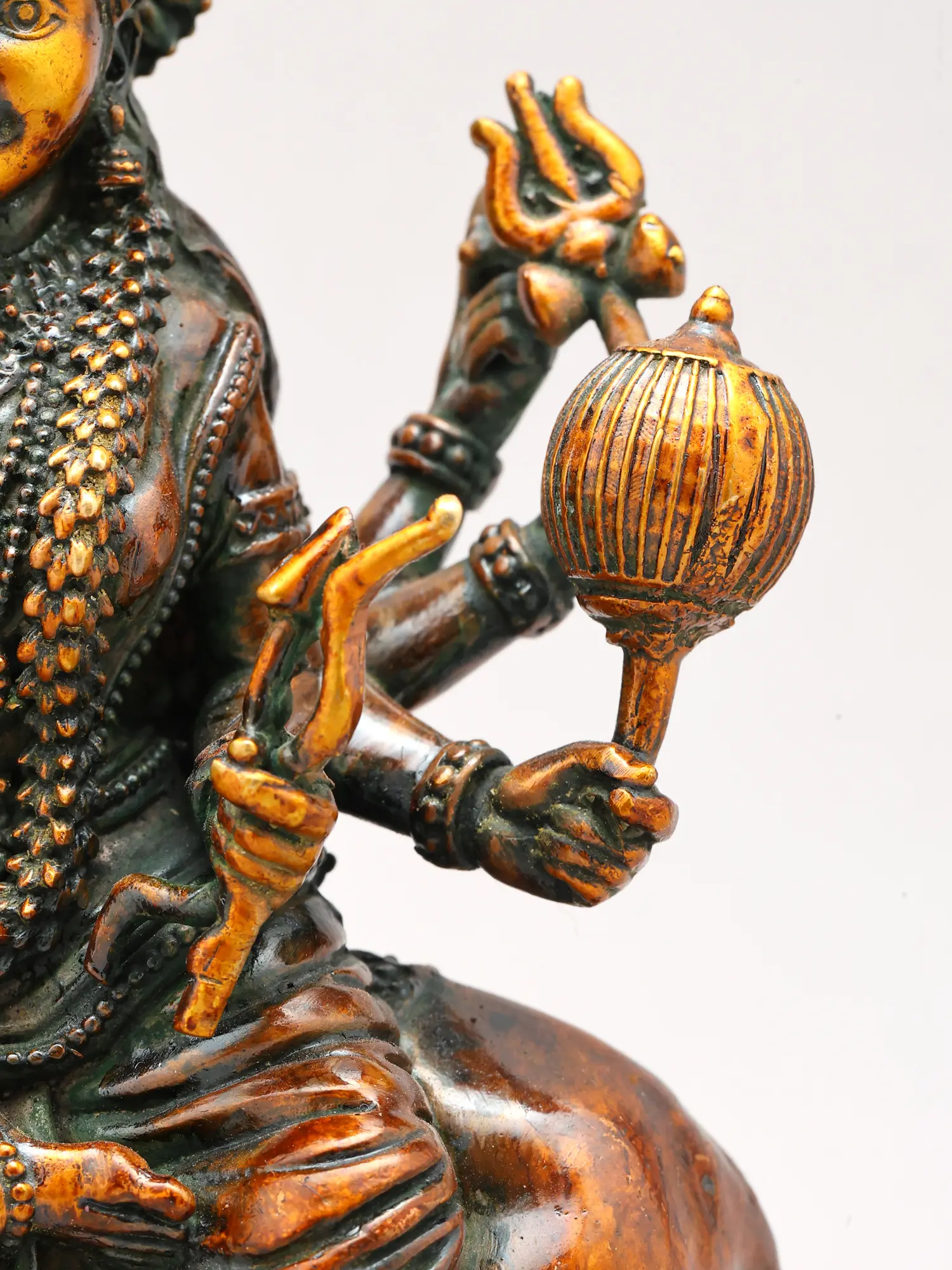This remarkable piece is a testament to centuries-old Indian artisanal traditions, meticulously crafted from robust copper with accents of brass and delicate silver inlay. Each curve and contour is painstakingly shaped by skilled hands, resulting in a sculpture that radiates a palpable sense of energy and devotion. The artists have achieved a stunning patinated finish, a complex process that imbues the metal with a rich, aged beauty and highlights the intricate details.