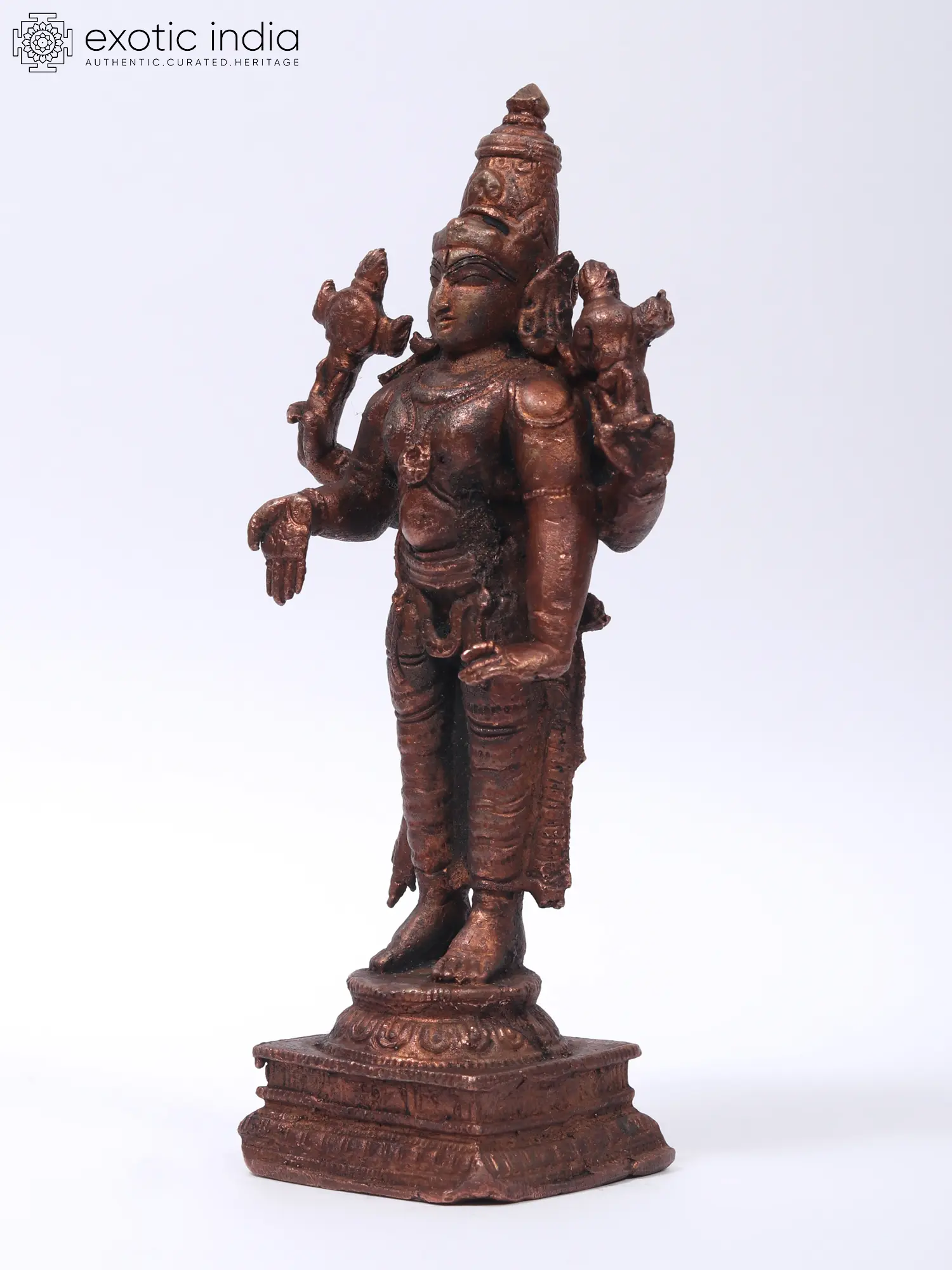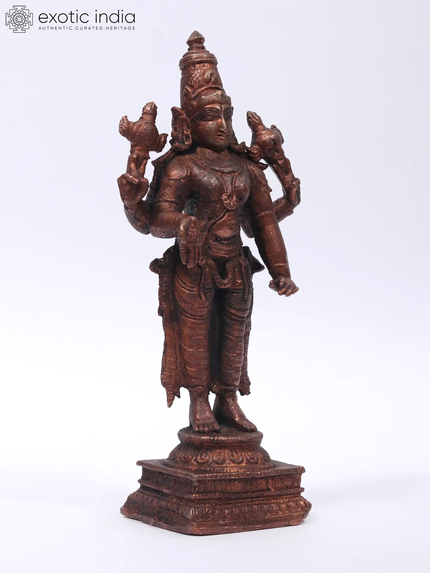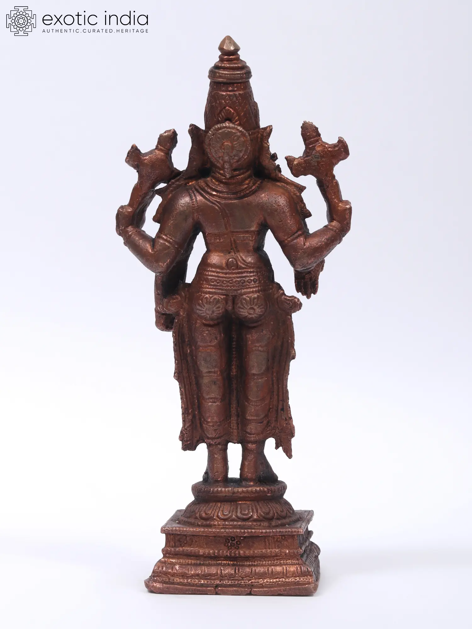 This Copper Statue of Lord Vishnu, painted in an ancient copper finish, is an amazing work of art that emits heavenly elegance. Lord Vishnu is elevated on a delicate lotus pedestal, displaying all of his celestial beauty. One hand is in the Varada mudra, offering blessings, while the other is in the Kati-Haasta posture. The upper set of hands gently cradles the sacred Shankha and Chakra, symbolizing preservation and protection. Wearing a Kirat mukuta, he oozes regal splendor and timeless presence. Worshipping this statue is believed to bring the protection of the deity and a smooth sailing life for the believer.