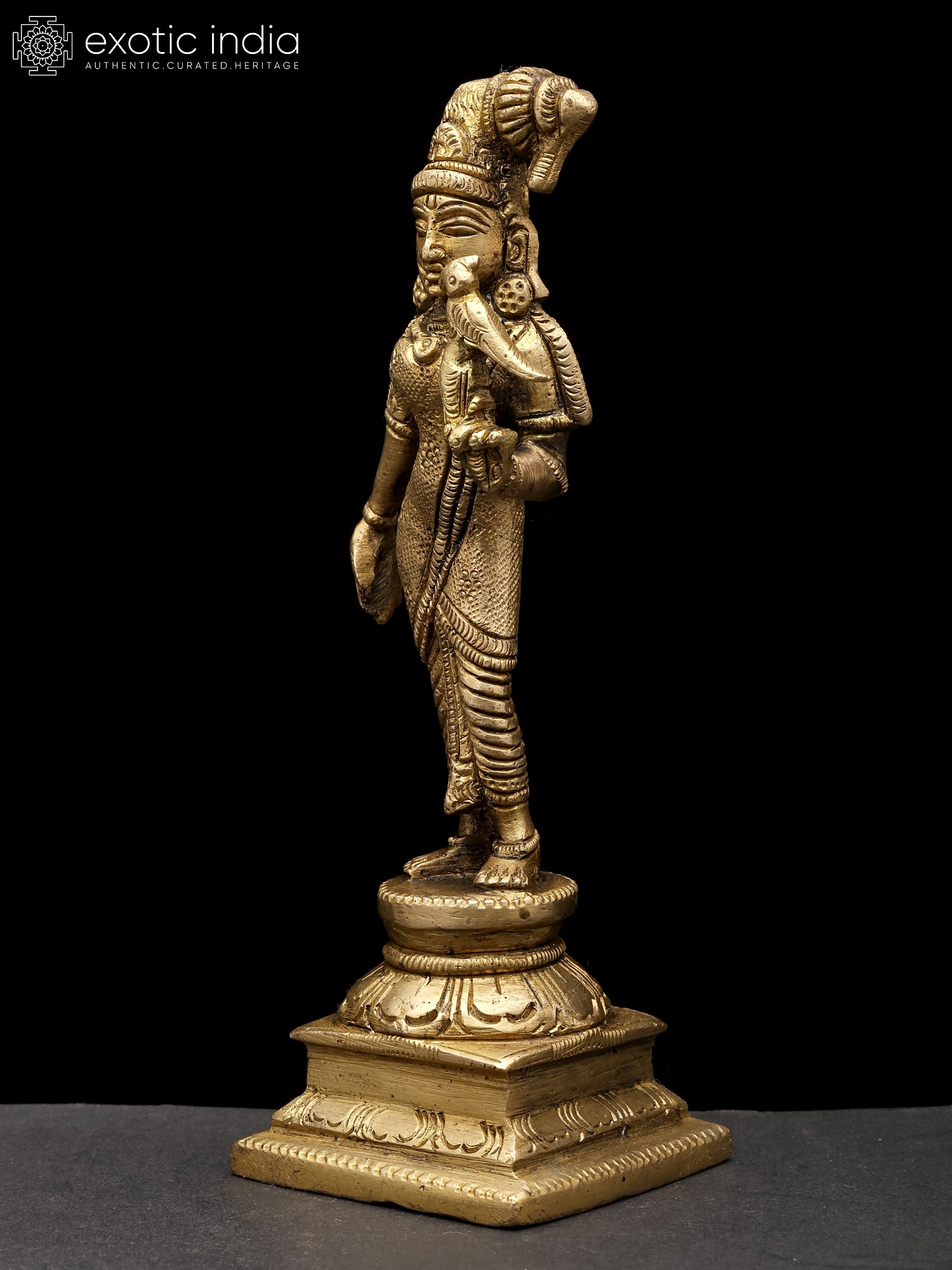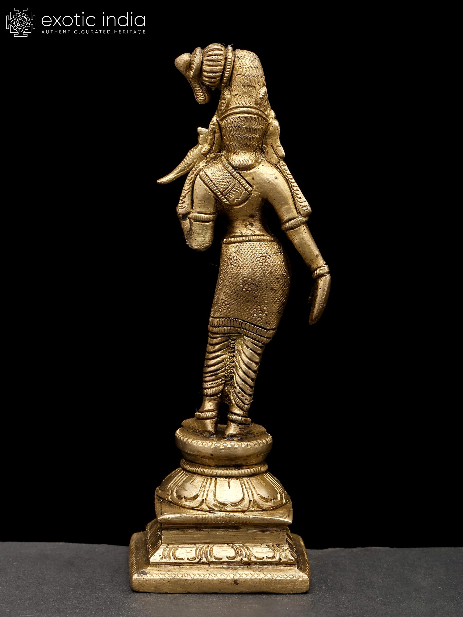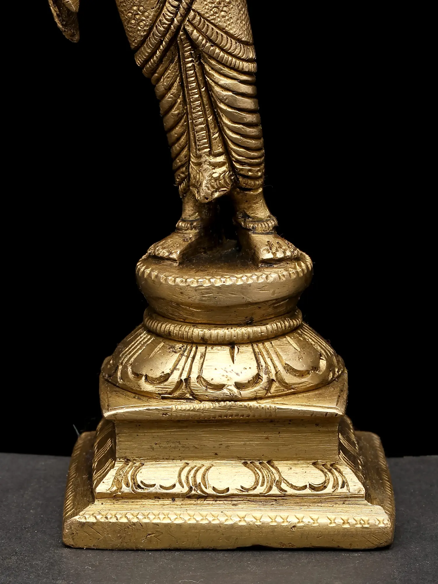 This intricately crafted brass statue presents Andal, also known as Goda, a revered Alvar saint from Tamil Nadu, India. She is uniquely celebrated as the only female Alvar among the twelve. Her life story, filled with intense devotion and divine love, continues to inspire countless devotees. Andal is known for her deep, unwavering love for Lord Vishnu, whom she considered her beloved. The sculpture embodies the grace and spiritual fervor associated with Andal. The artisans have painstakingly captured the delicate features of her face, reflecting her serene devotion. The attire, with its flowing lines and subtle detailing, suggests a divine presence. The statue stands on a tiered base, providing stability and visual appeal.