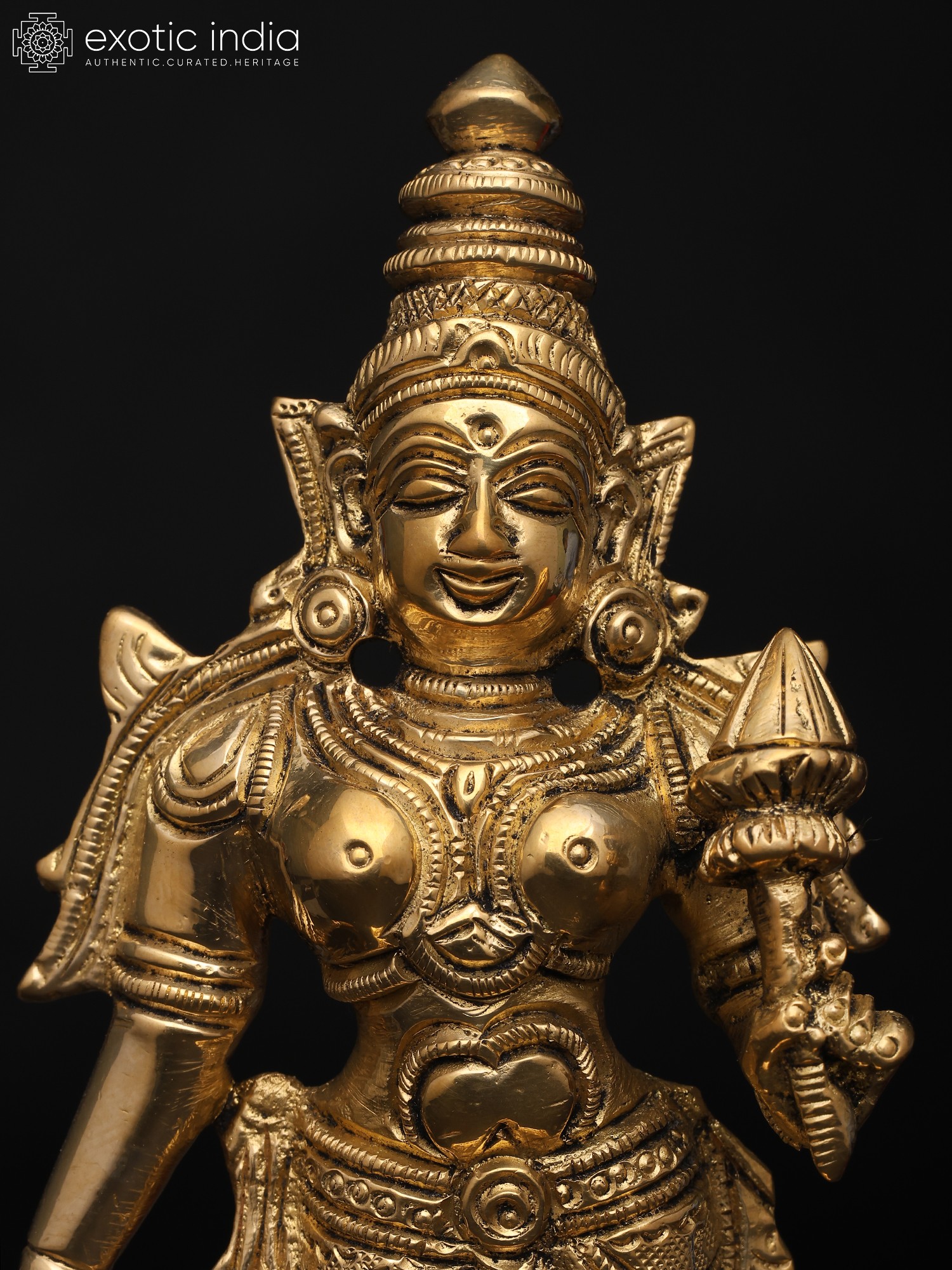 7" Superfine Goddess Dhanalakshmi Seated on Lotus with Four Arms and Wood Base | Brass Sculpture