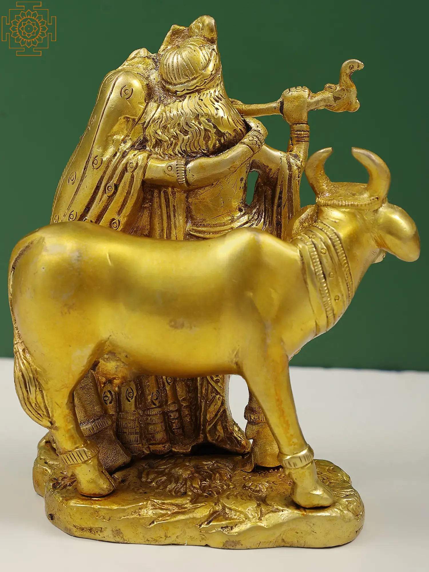 Gopala Krishna and Radha, in regal attire, stand together in a divine tableau. Krishna, the enchanting deity, delicately plays his flute, its melodies weaving through the air like magic. Radha, his eternal consort, gently rests her hands on his shoulders, a symbol of their eternal love. Behind them, a sacred cow stands, representing purity and abundance. This enchanting scene encapsulates the eternal bond between the divine lovers. Their presence radiates a sense of serenity and devotion. Meticulously crafted with precision in brass, this artwork invites serenity and grace into your home.