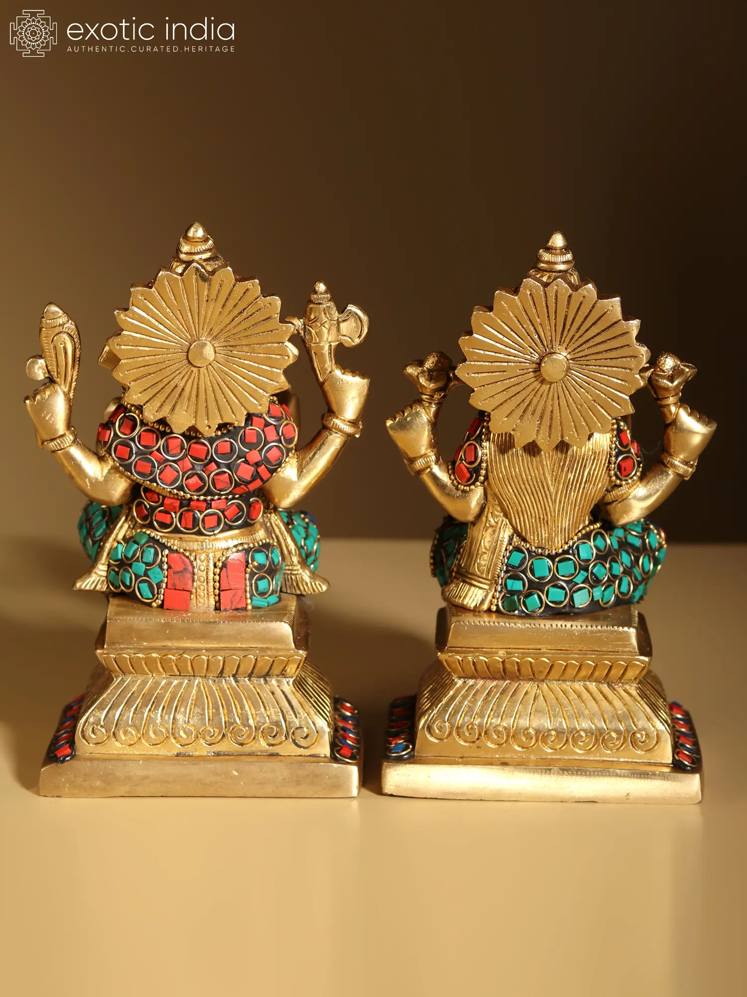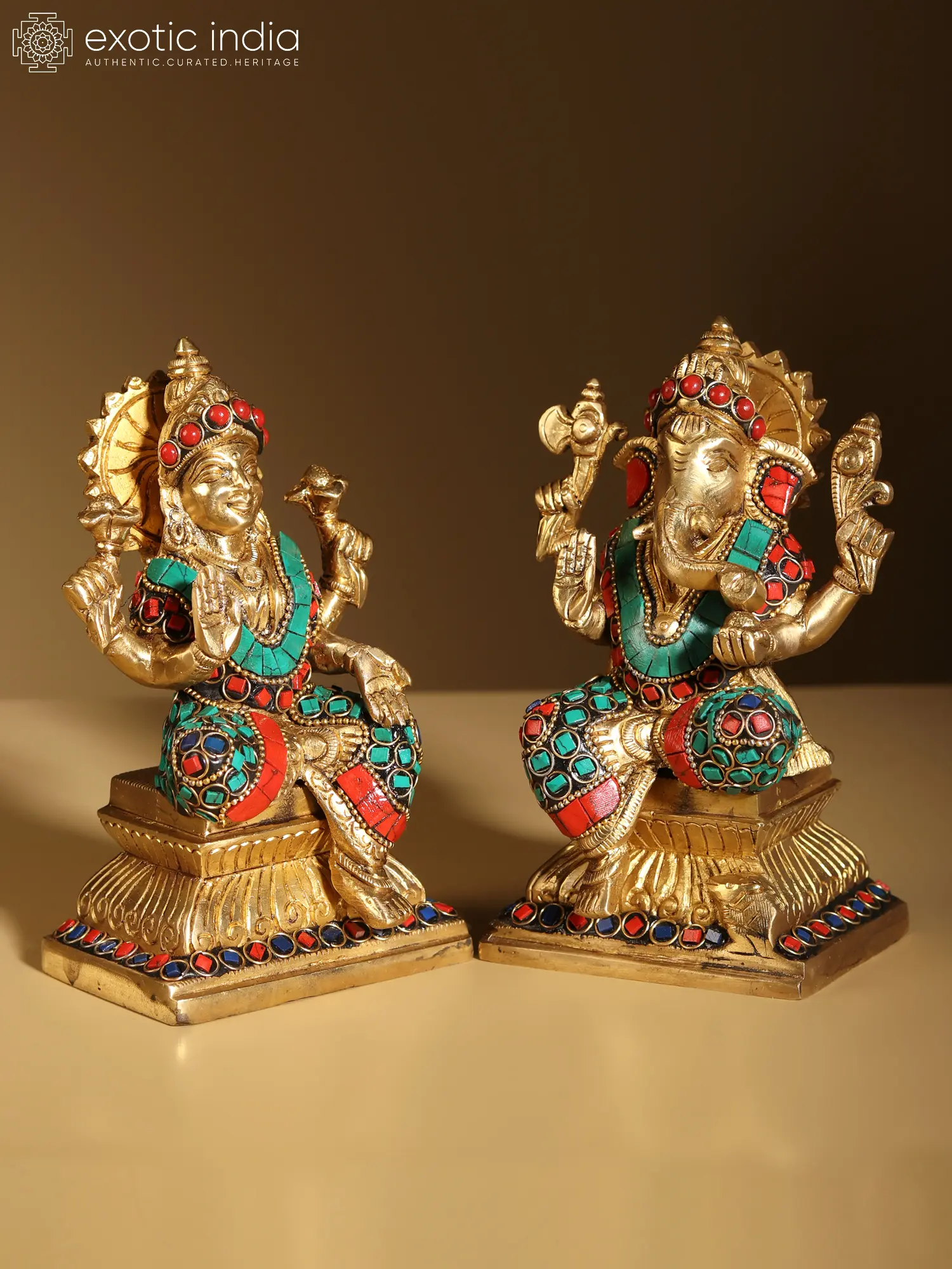 6" Brass Lord Ganesha and Goddess Lakshmi Statue with Inlay | Handmade
