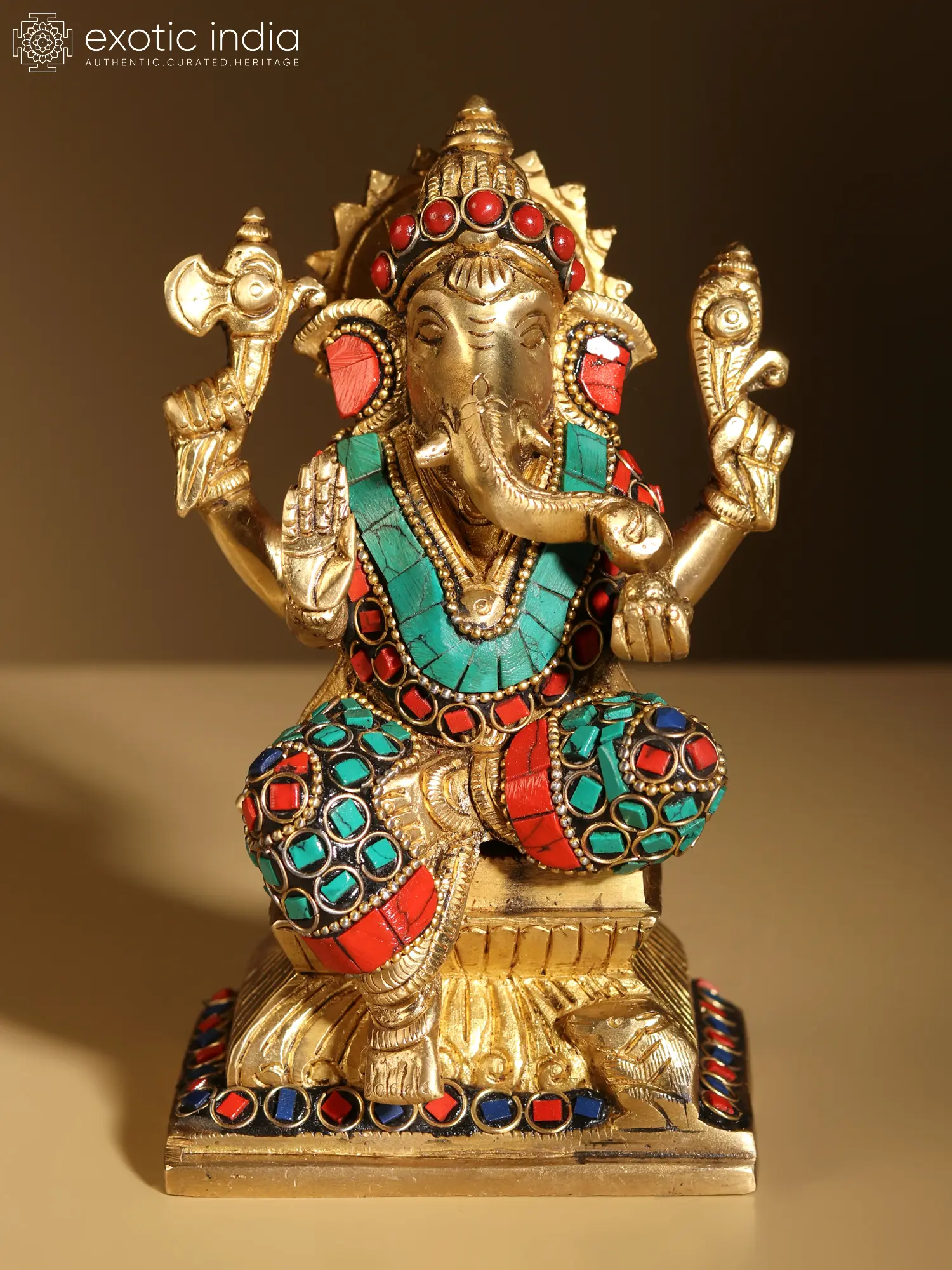 6" Small Four Armed Blessing Lord Ganesha | Brass Statue with Inlay Work