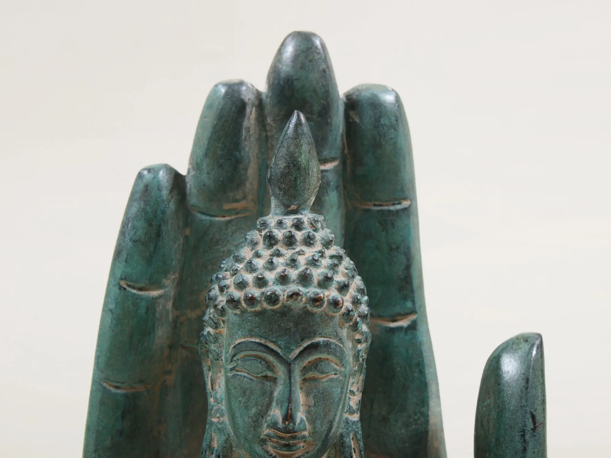 Invite a sense of profound peace and spiritual grounding into your home or meditation space with this exquisite brass statue. The Buddha's tranquil visage emerges from the cradling palm of a hand, a powerful symbol of protection, refuge, and nurturing. The aged patina, reminiscent of verdigris on ancient bronzes, lends an aura of timeless wisdom and sacred history to this captivating piece. The imagery of a deity held within a hand evokes various rich cultural narratives. In Buddhist traditions, the palm can represent the protective gesture of Abhaya Mudra, a symbol of fearlessness and reassurance. This gesture, often bestowed by the Buddha, signifies the dispelling of anxieties and the offering of solace. Culturally, hands are often seen as conduits of divine energy, and their depiction in art frequently signifies blessings, guidance, and the transfer of spiritual power. This statue captures that essence, presenting the Buddha as a source of ultimate comfort and unwavering support.
