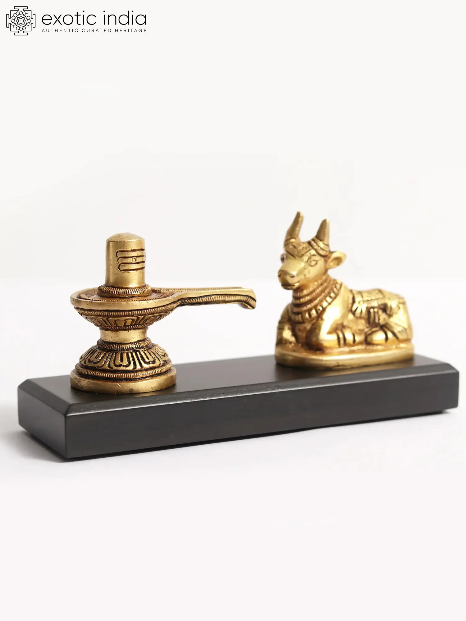 According to the sacred Shiva and Linga Puranas, the worship and Darshana of a Shiva Linga, the Nirguna (formless) roopa of Shiva, is all one needs to attain worldly and spiritual abundance. In this brass and wood statue, the potent presence of Shiva Linga is brought to your space with austere aesthetics that suit the modern taste. A beautifully polished wooden base serves as the Lingam seat, accompanied by an icon of Nandi, whose presence completes this miniature representation of a Shiva Mandir.