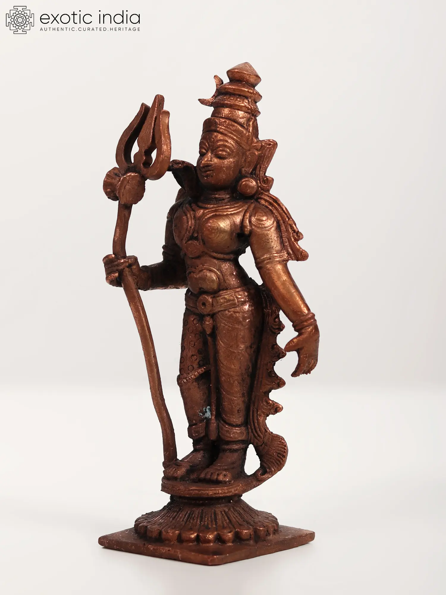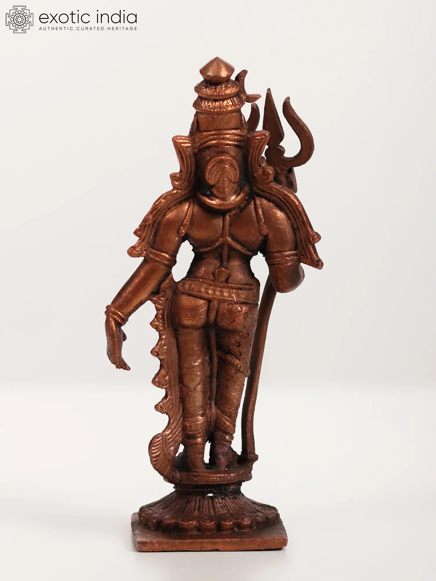 This copper Ardhanarishwar statue beautifully manifests the profound philosophy that male and female are inseparable aspects of the same cosmic entity. Lord Shiva (left) and Goddess Parvati (right) are depicted in infused form. Only the difference in dress allows for identification, since the dhoti on the left side is knee length, whilst the saree on Goddess Parvati's side reaches the ankle. Lord Shiva also wields a Trishul, while Goddess Parvati does the Katihasta hand motion.
