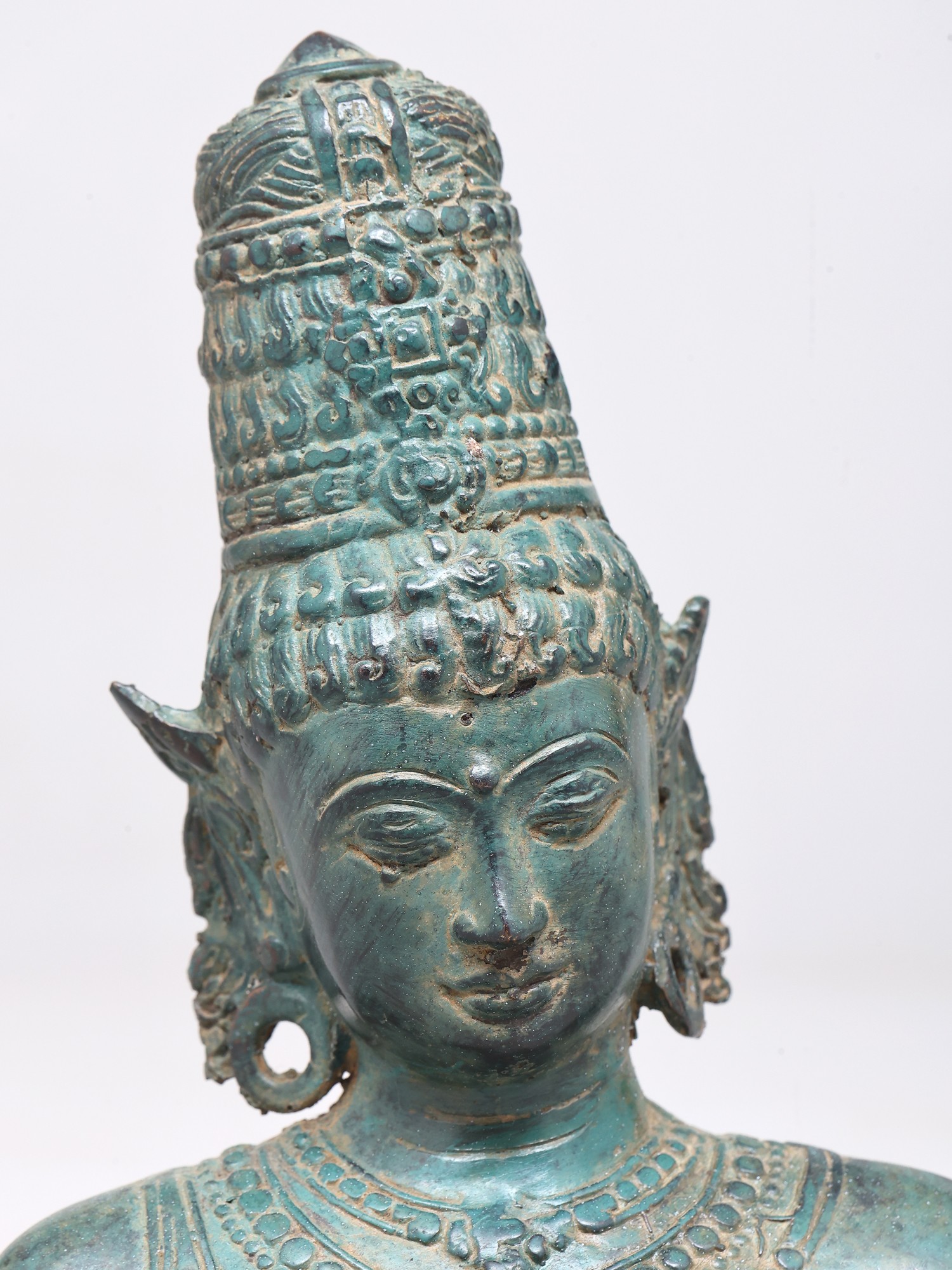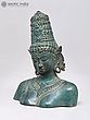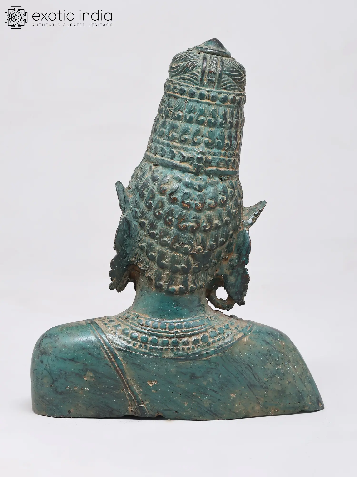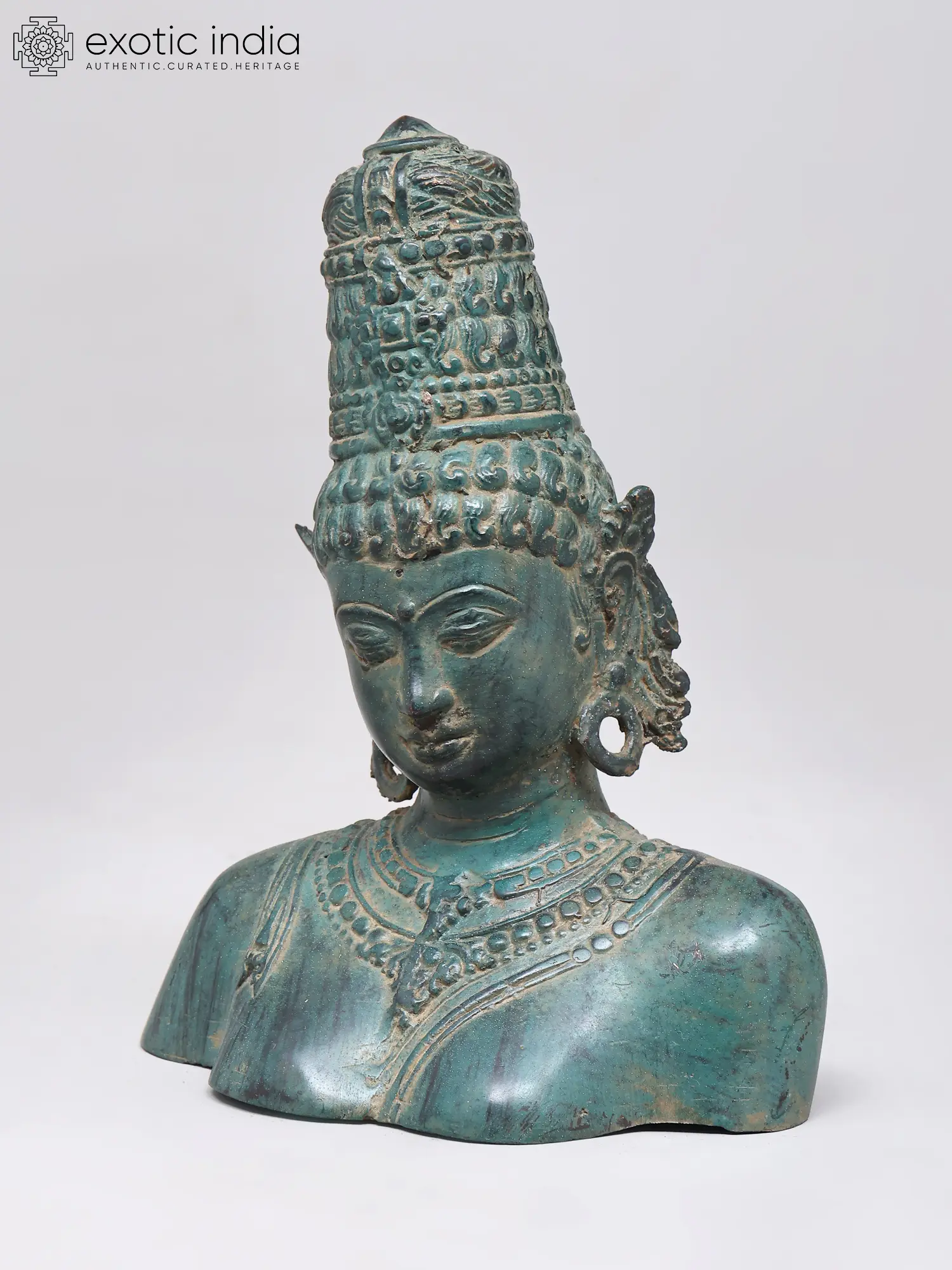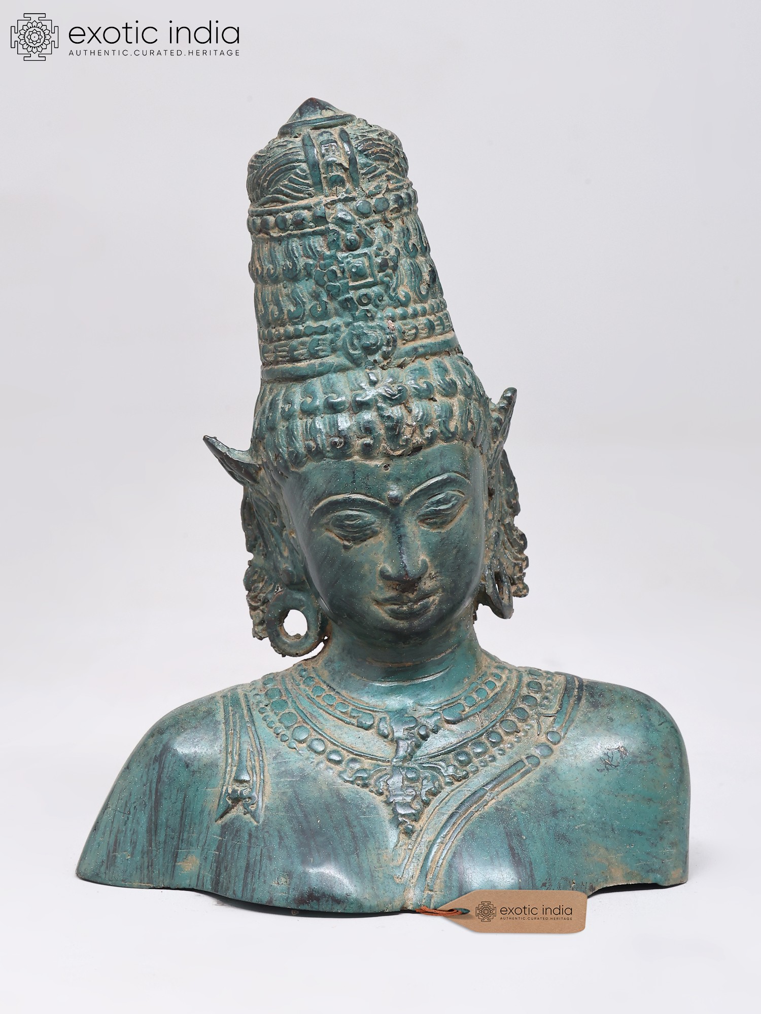 This exquisite brass bust captures the serene and powerful essence of Goddess Parvati, a principal deity in Hinduism. Revered as the divine consort of Lord Shiva, she embodies love, fertility, devotion, and power. Known by many names, including Uma, Gauri, and Sati, Parvati is the mother goddess, the universal mother who nurtures and protects all creation. This depiction, crafted using the intricate lost wax method, showcases the divine grace and profound spirituality associated with her multifaceted persona. The verdigris patina lends an ancient and timeless aura to the piece, suggesting a lineage of devotion that spans centuries.