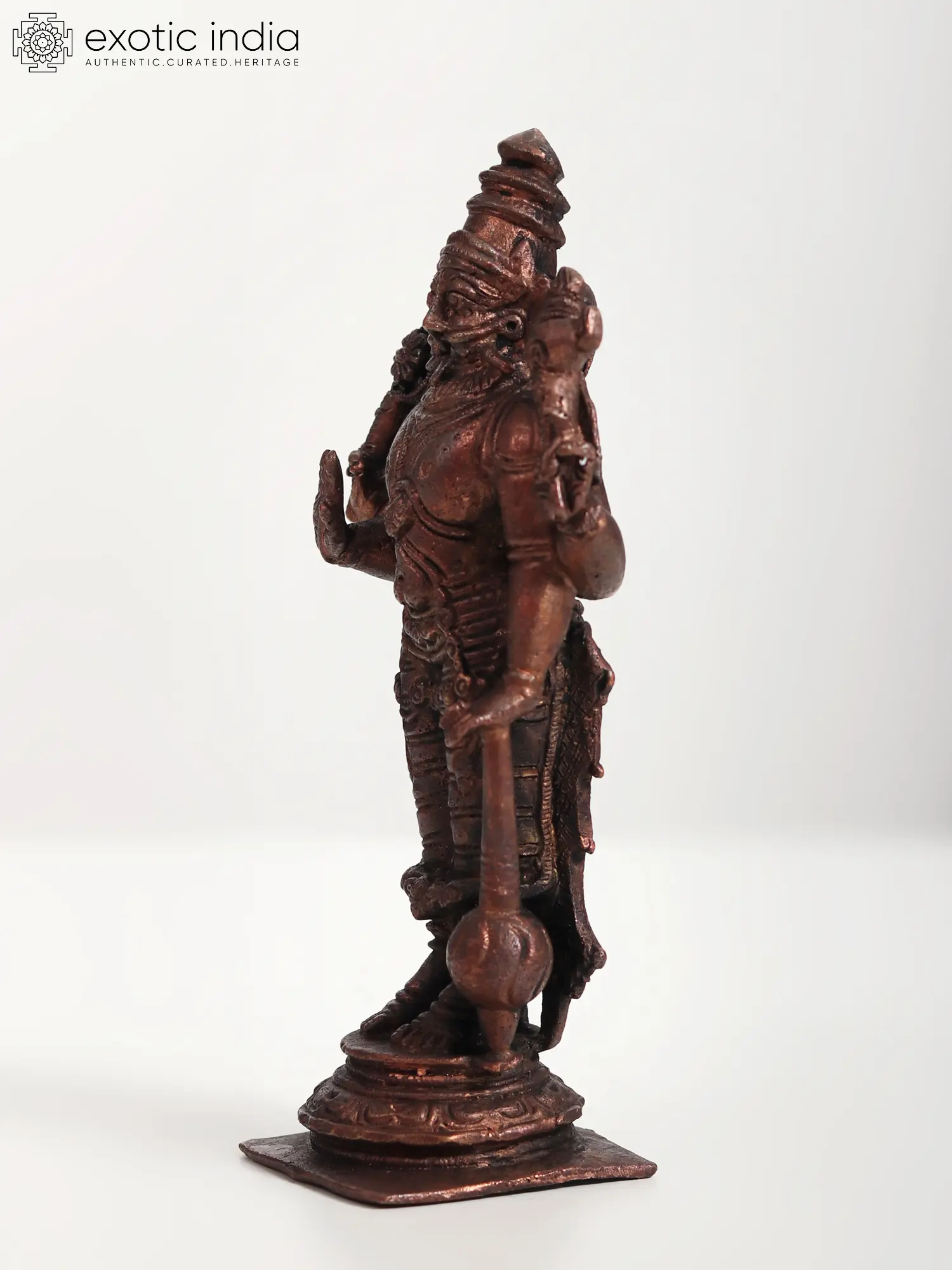 The intricate details showcase his fierce yet benevolent form, with claws and mane, embodying cosmic strength. This small yet impactful copper statue serves as a powerful visual representation of the divine blessings and cosmic harmony associated with Lord Narasimha, inviting reverence and contemplation from devotees.