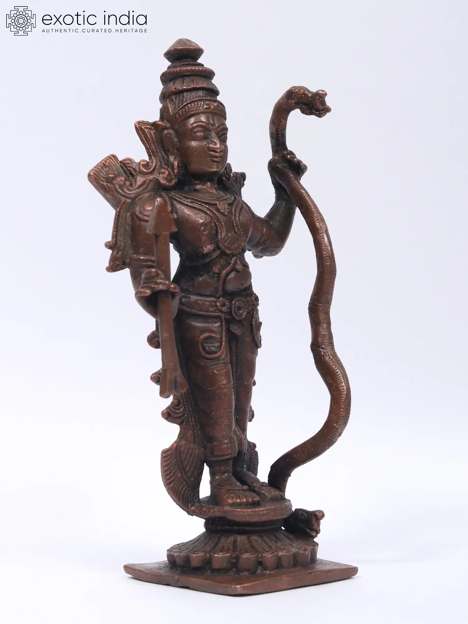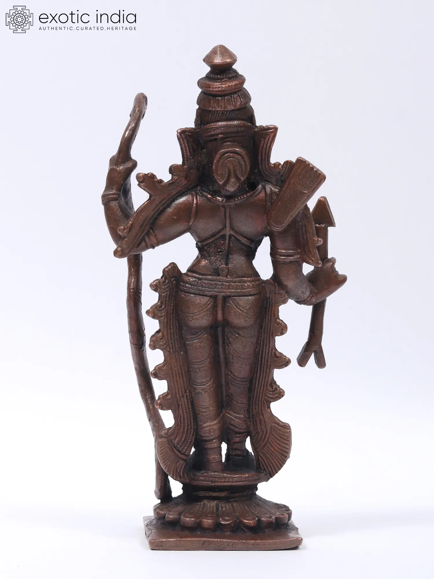 Crafted in shimmering copper, this Small Standing Lord Rama statue emanates elegance and power. With delicate precision, Lord Rama is depicted in a Tribhanga or three-fold standing posture, holding his iconic bow and arrow, Kodanda.