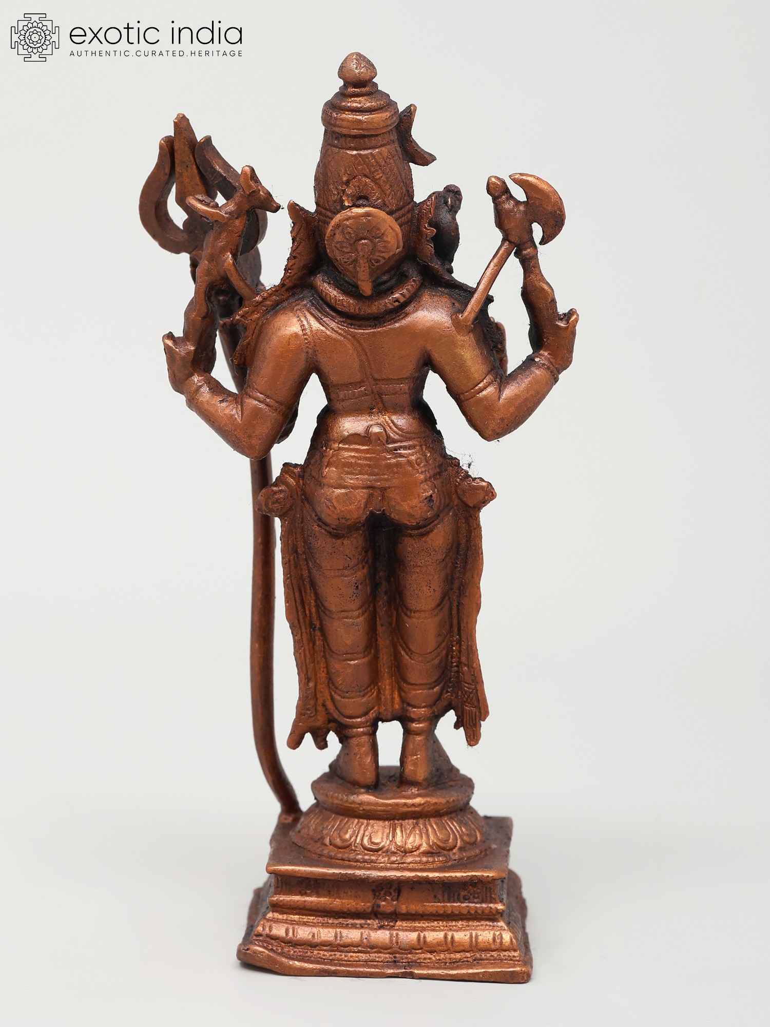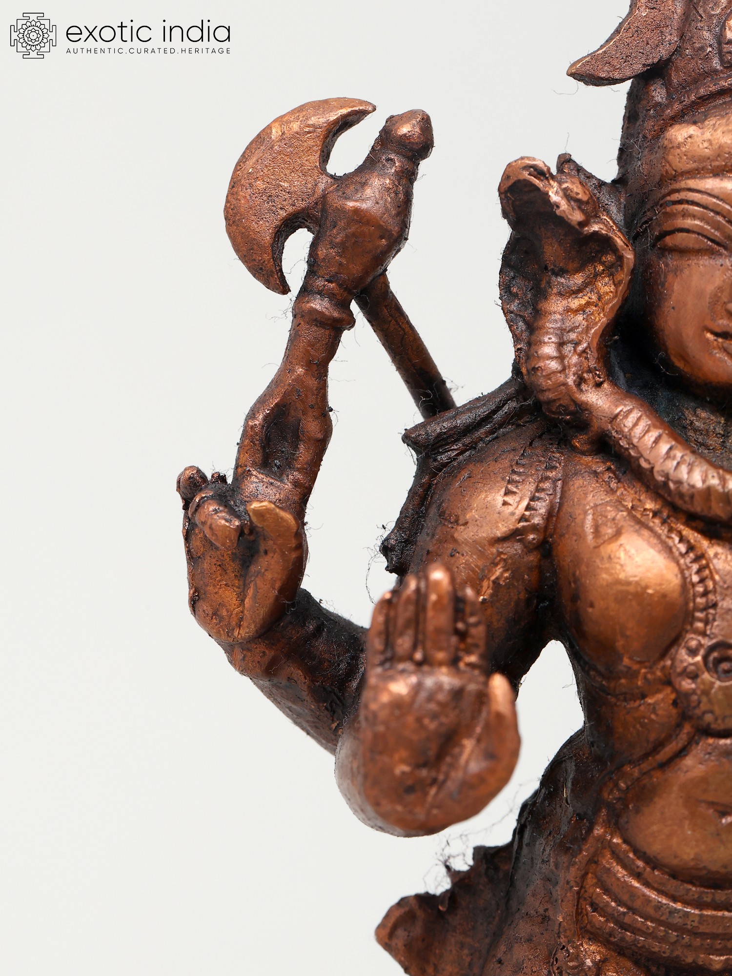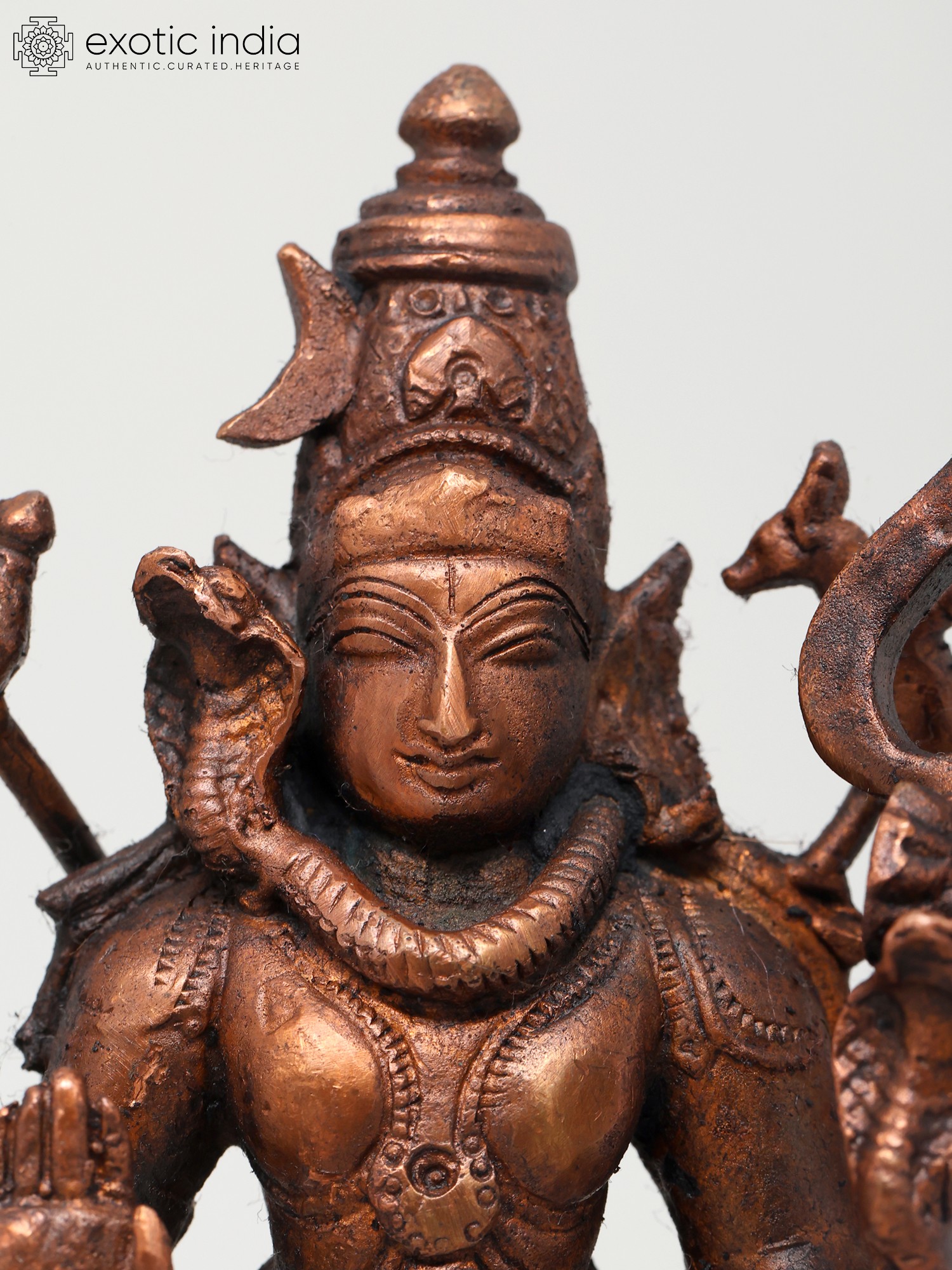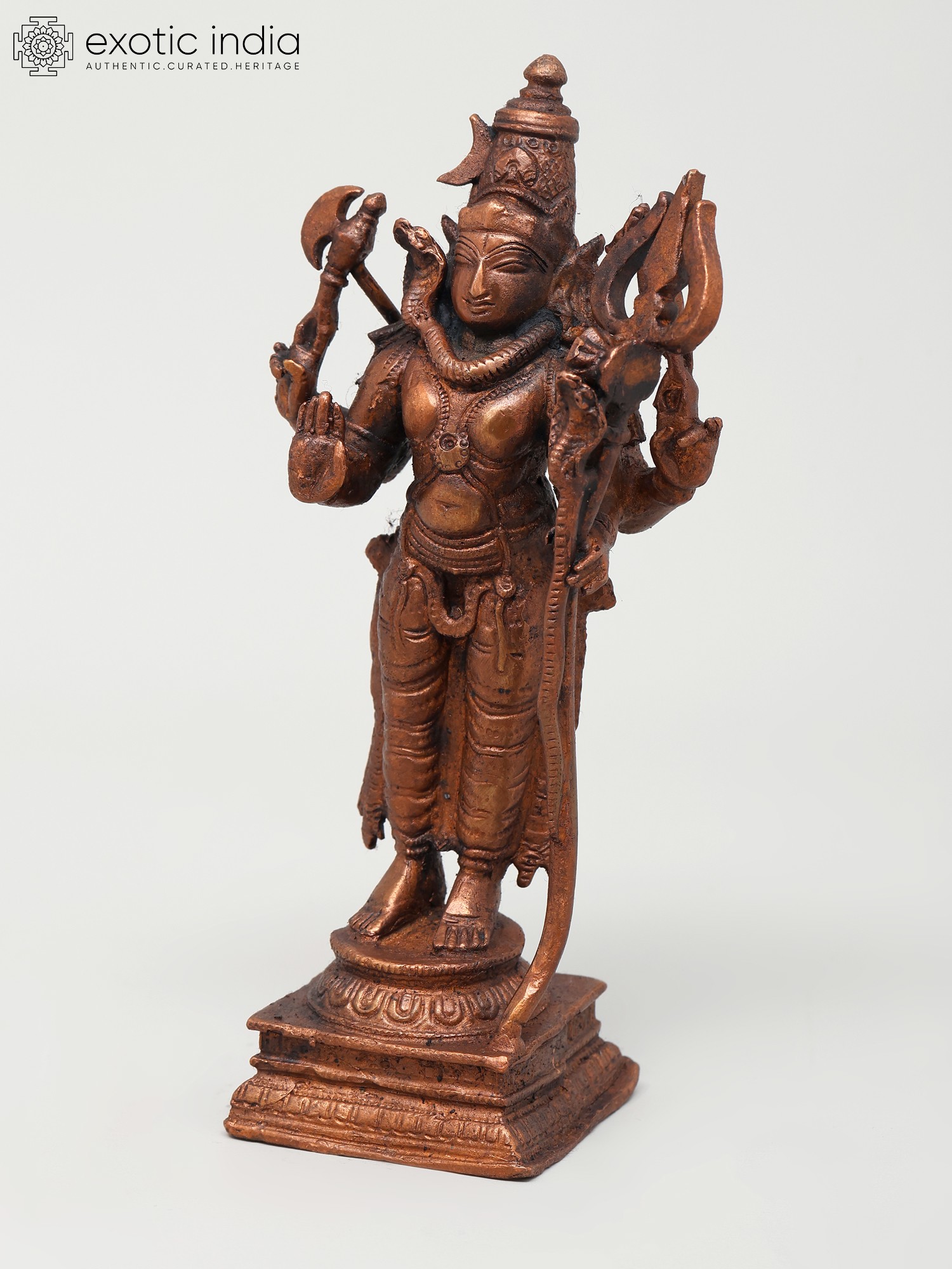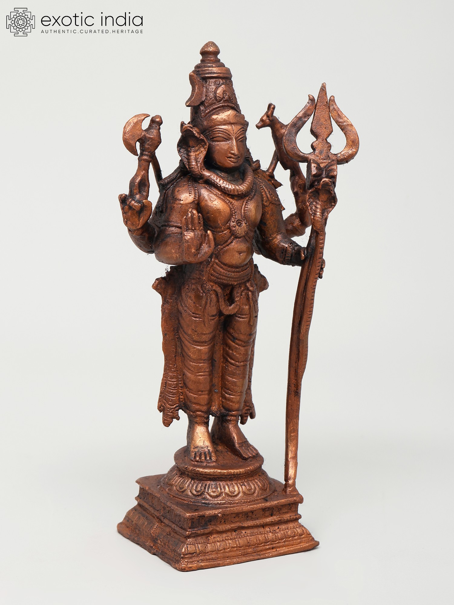 This exquisite copper statue depicts Lord Shiva in a serene and benevolent posture, offering blessings to his devotees. Standing at six inches tall, this finely crafted piece captures the divine essence of Mahadeva, the Supreme Being in Hinduism. Lord Shiva is revered as the destroyer of evil, the transformer, and the ultimate ascetic, embodying a complex interplay of destruction and creation. His presence signifies the cyclical nature of existence, where endings pave the way for new beginnings. The statue showcases Shiva holding his iconic trident, the Trishul, a symbol of his mastery over the three gunas (Sattva, Rajas, and Tamas) and his power to destroy ignorance, ego, and illusion. In his other hand, he wields the Parashu, the axe, representing his ability to cut through obstacles and attachments that bind the soul. A serpent, often depicted around his neck or coiled on his head, symbolizes his control over cosmic energy and his transcendence of death and decay.