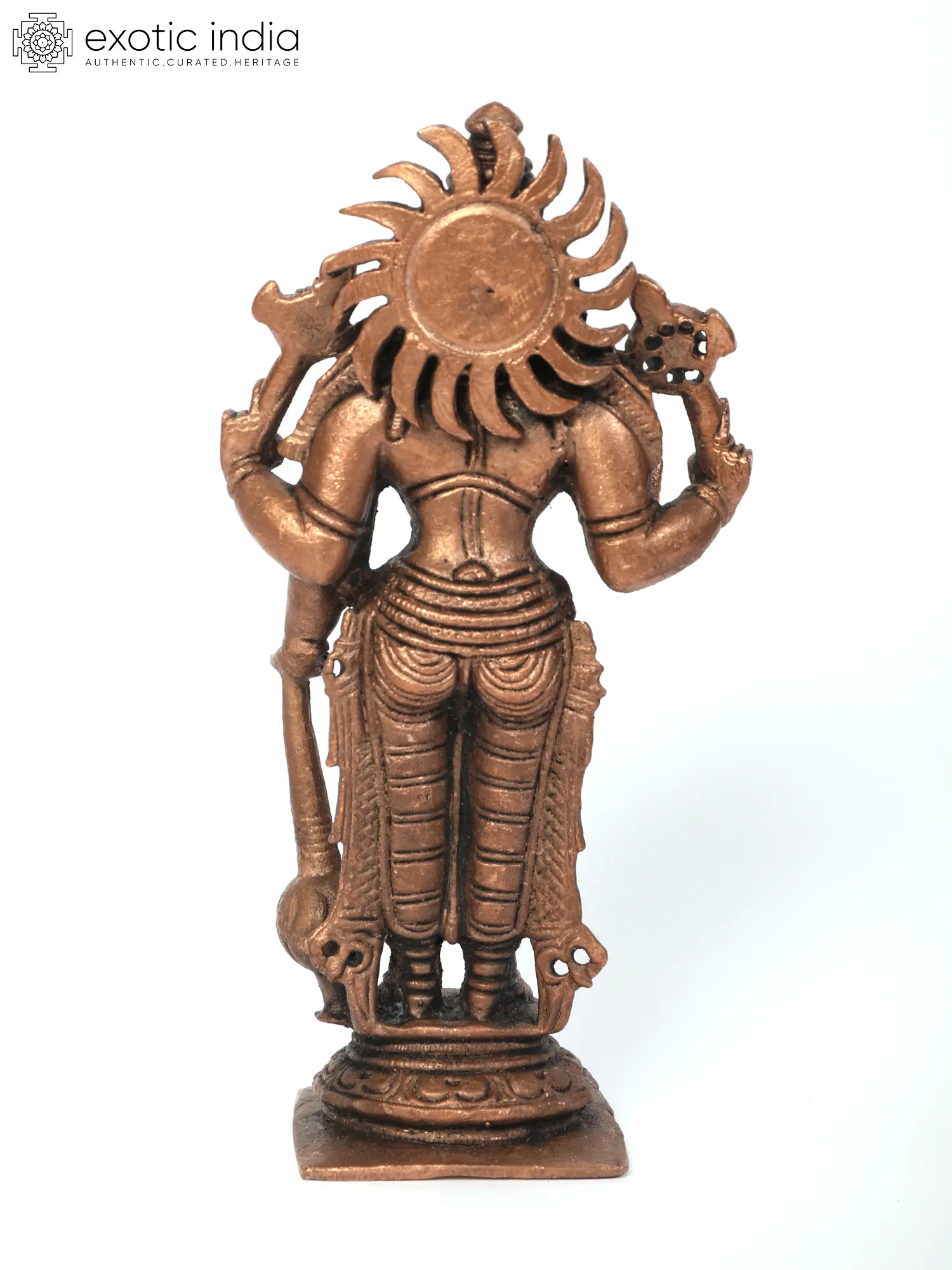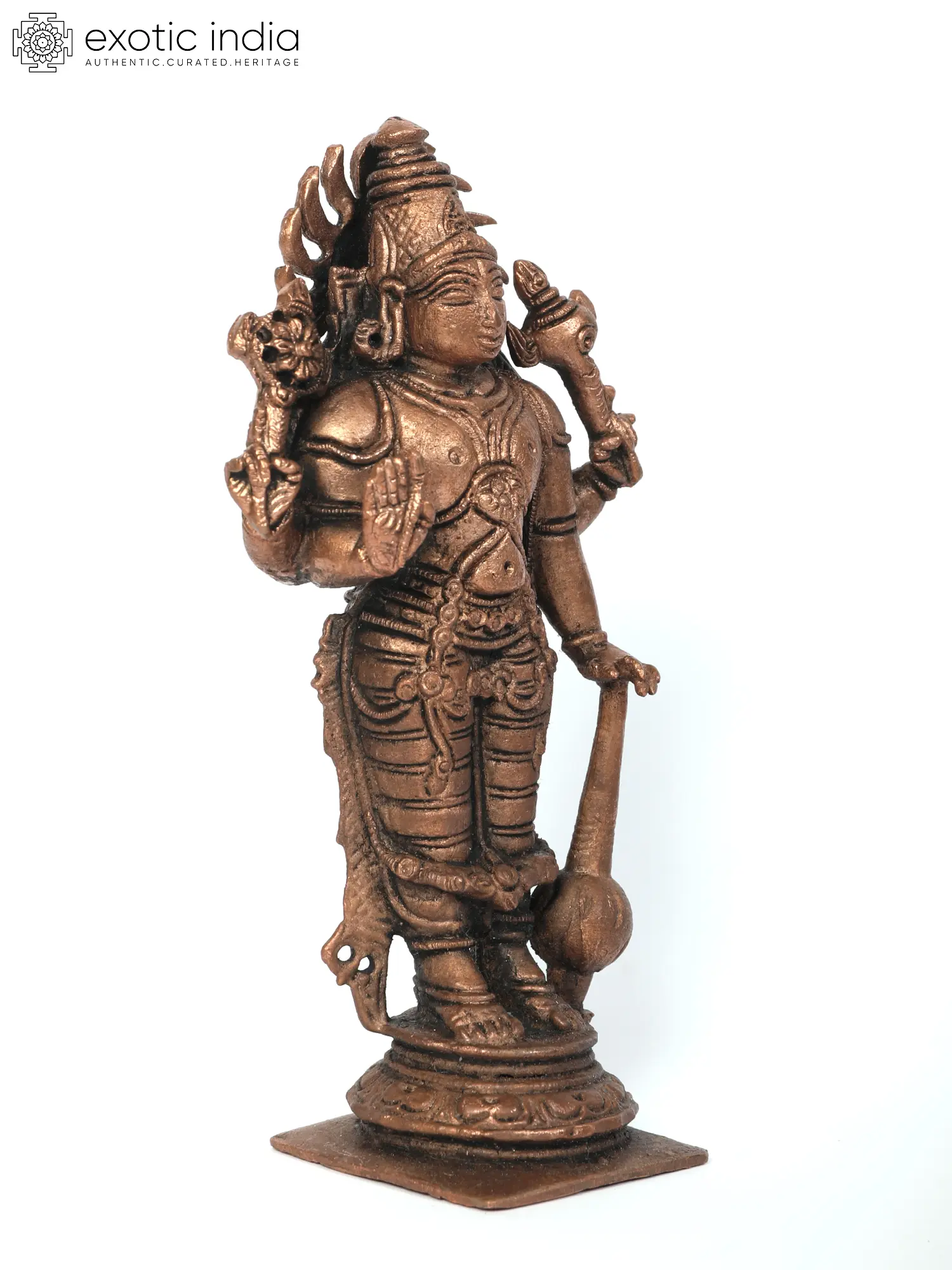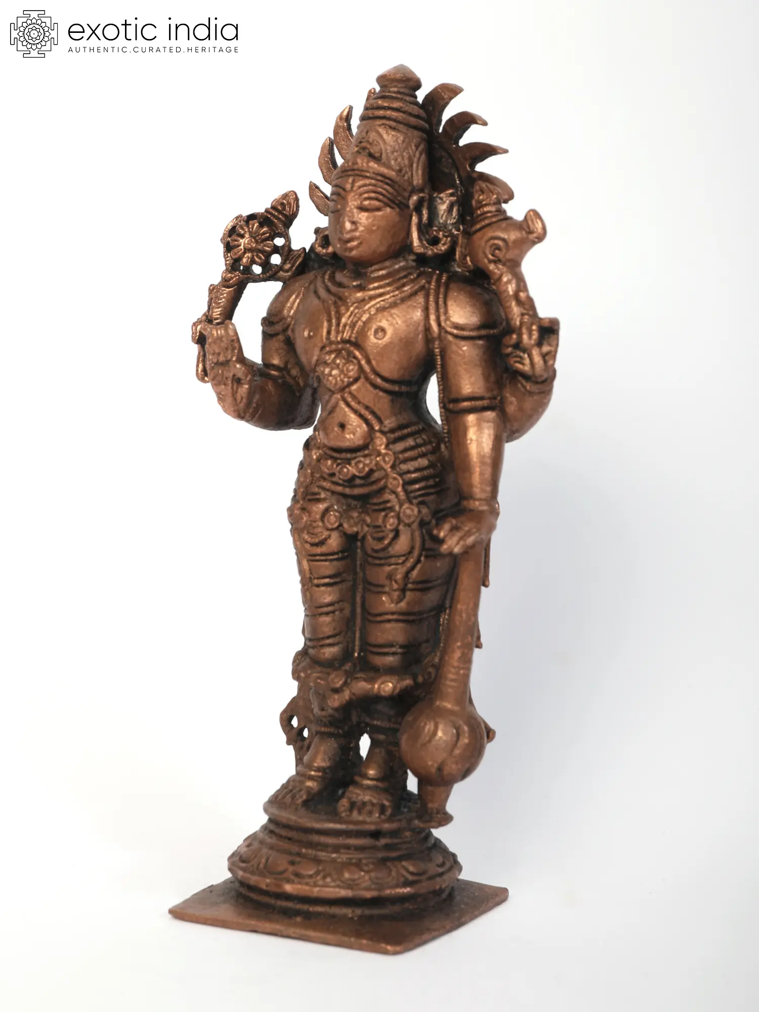 Also known as “Narayana” or “Hari”, Vishnu is one of the most popularly worshipped gods in the Hindu pantheon. He is the supreme being in “Vaishnavism”, who creates, protects and transforms the universe. Around his neck, Vishnu wears the auspicious Kaustubha necklace. A crown is adorning his head. His four hands hold Shankha (Conch), Chakra (Discus), Gada (Mace). He is seen wearing two earrings. The earrings represent inherent opposites in creation –Knowledge and Ignorance; happiness and unhappiness; pleasure and pain. His right hand is extended in “Abhaya Mudra”, signifying fearlessness, courage and strength. Worshipping this manifestation that is sculpted in copper bestows blessings upon devotees.