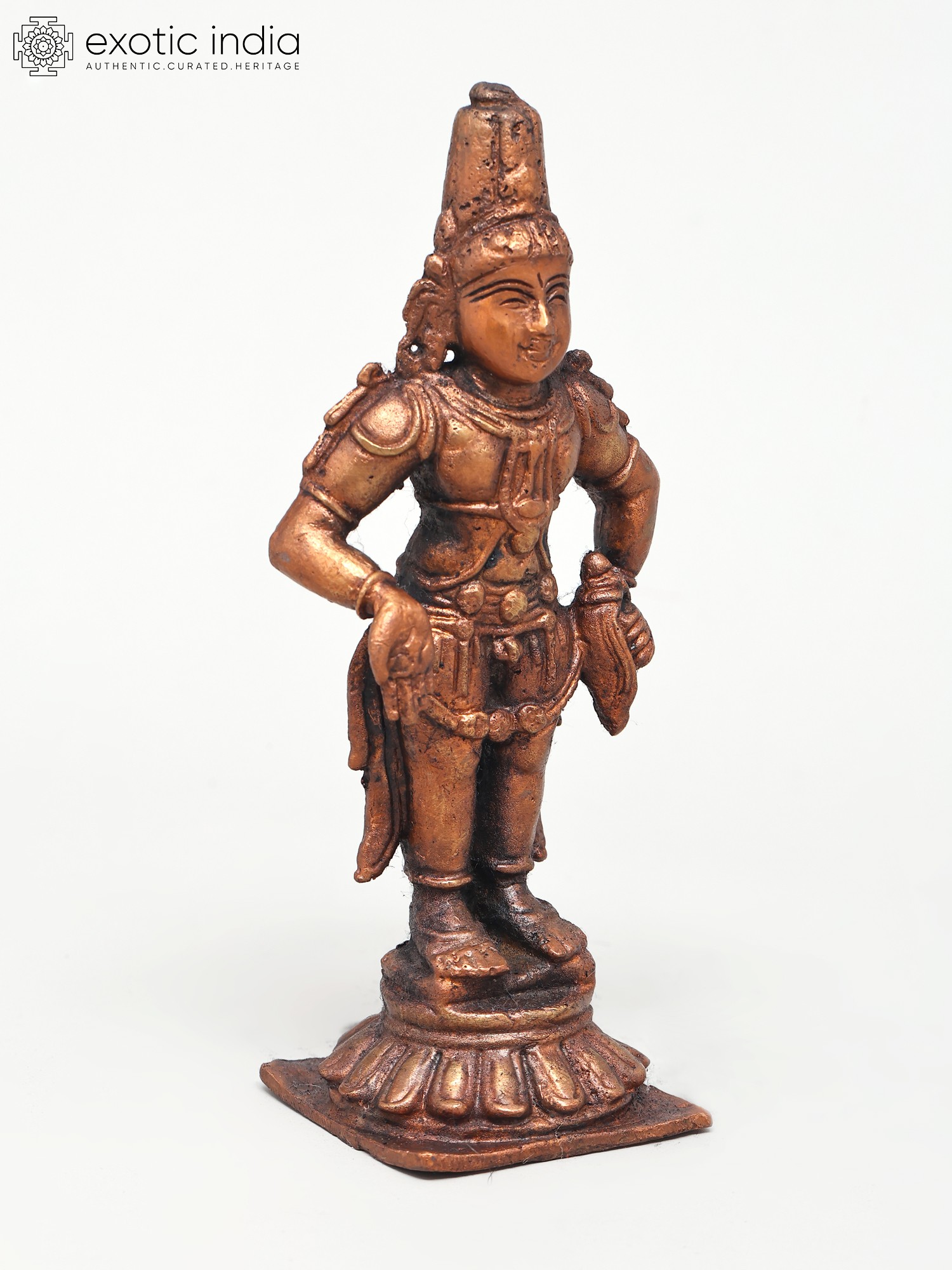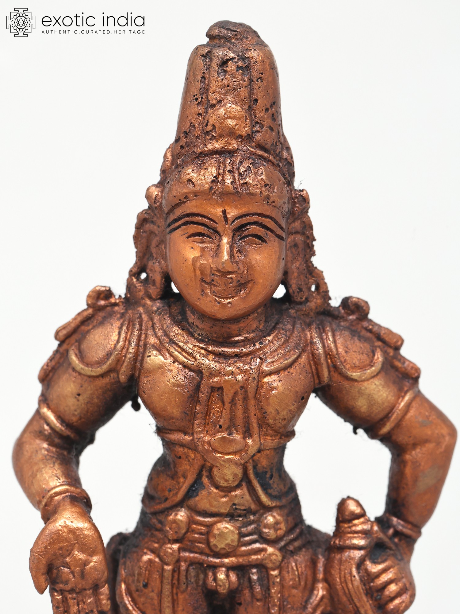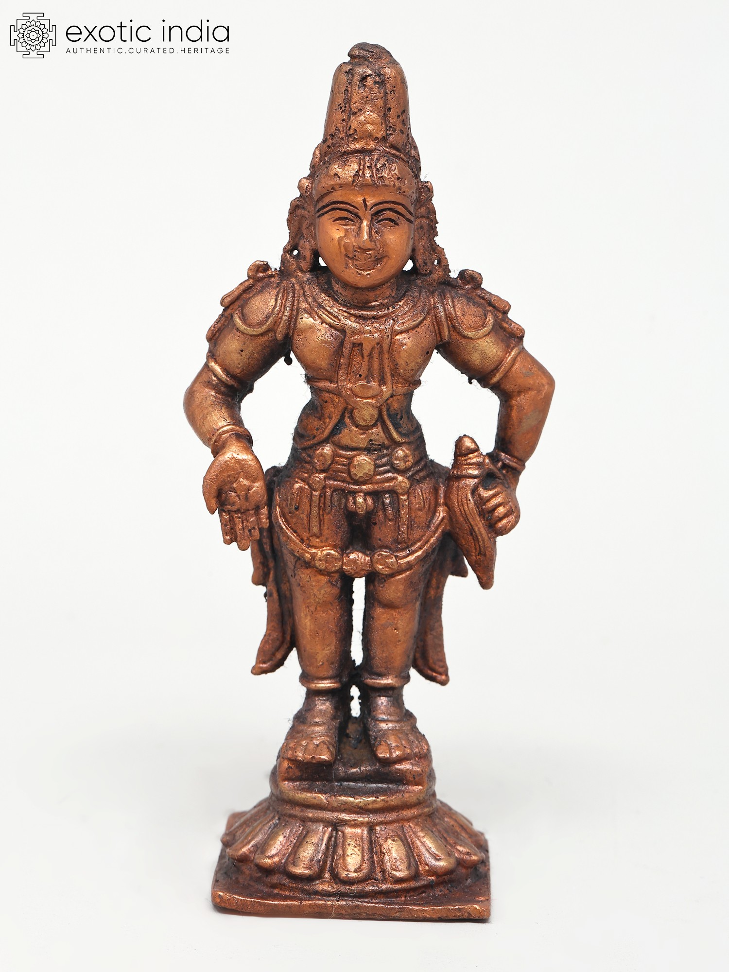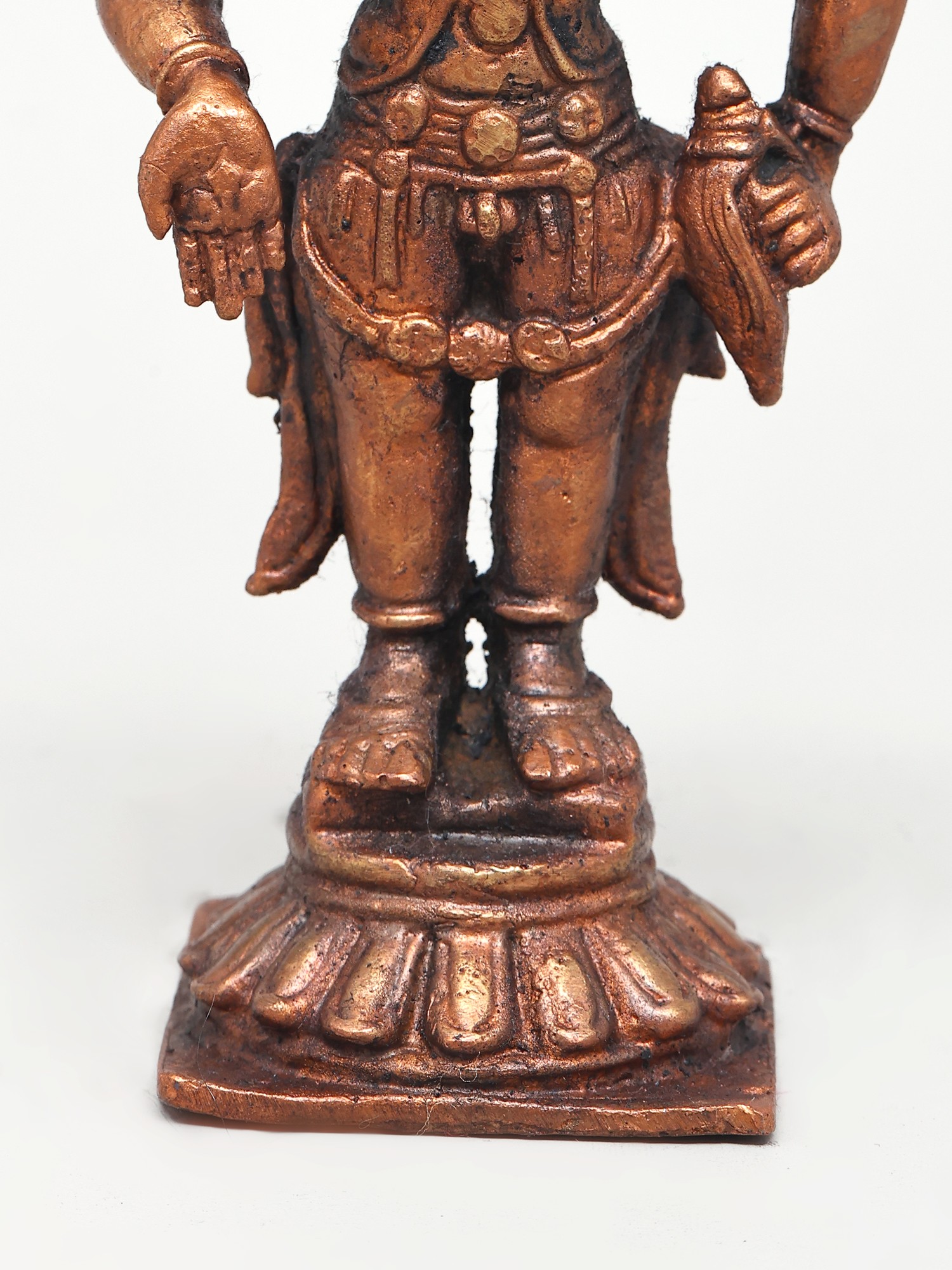 Crafted from enduring copper, this idol is a testament to the skilled artisans who have breathed life into the metal. The rich patina of the copper lends a timeless elegance to the sculpture, while the meticulous detailing of Vitthal's attire, his serene facial expression, and the characteristic pose speak volumes of the craftsmanship. Each element, from the ornate headdress to the finely molded hands and feet, is rendered with care, creating a piece that is not only a religious artifact but also a work of art. The compact size makes it ideal for placement on a personal altar, a study desk, or as a cherished addition to a collection of Indian deities.