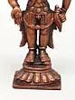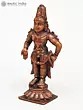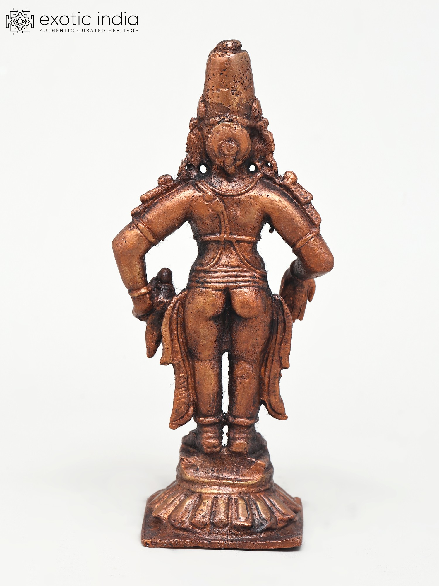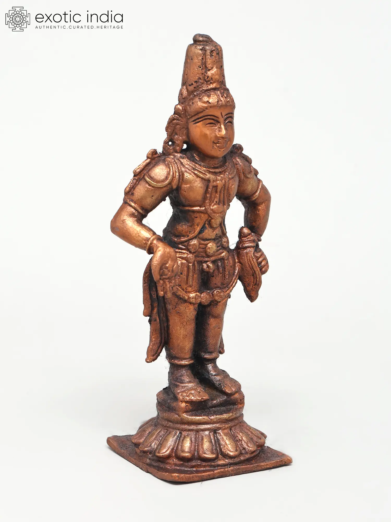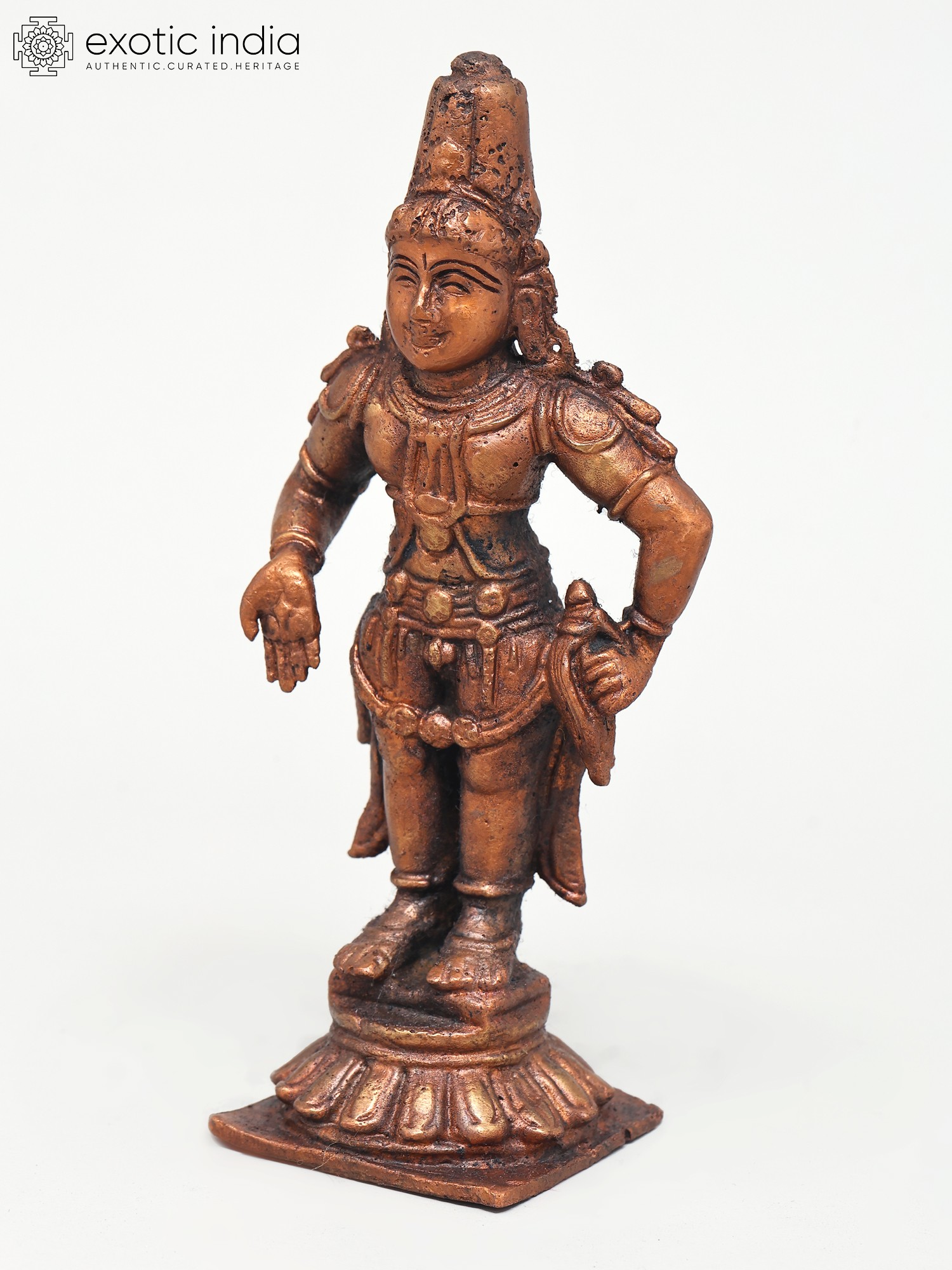 Crafted from enduring copper, this idol is a testament to the skilled artisans who have breathed life into the metal. The rich patina of the copper lends a timeless elegance to the sculpture, while the meticulous detailing of Vitthal's attire, his serene facial expression, and the characteristic pose speak volumes of the craftsmanship. Each element, from the ornate headdress to the finely molded hands and feet, is rendered with care, creating a piece that is not only a religious artifact but also a work of art. The compact size makes it ideal for placement on a personal altar, a study desk, or as a cherished addition to a collection of Indian deities.