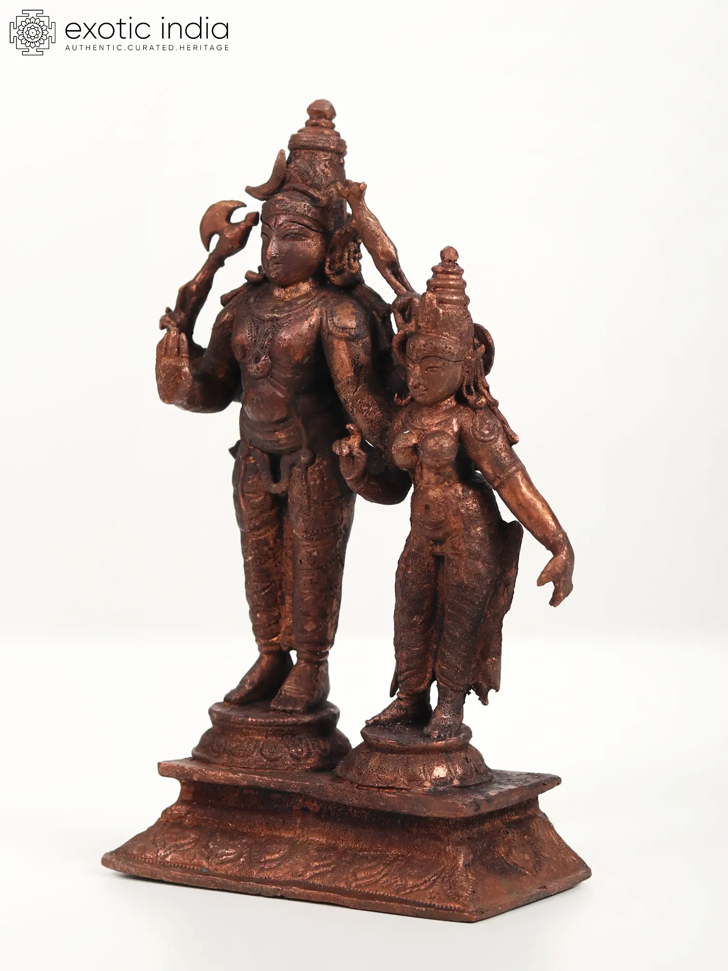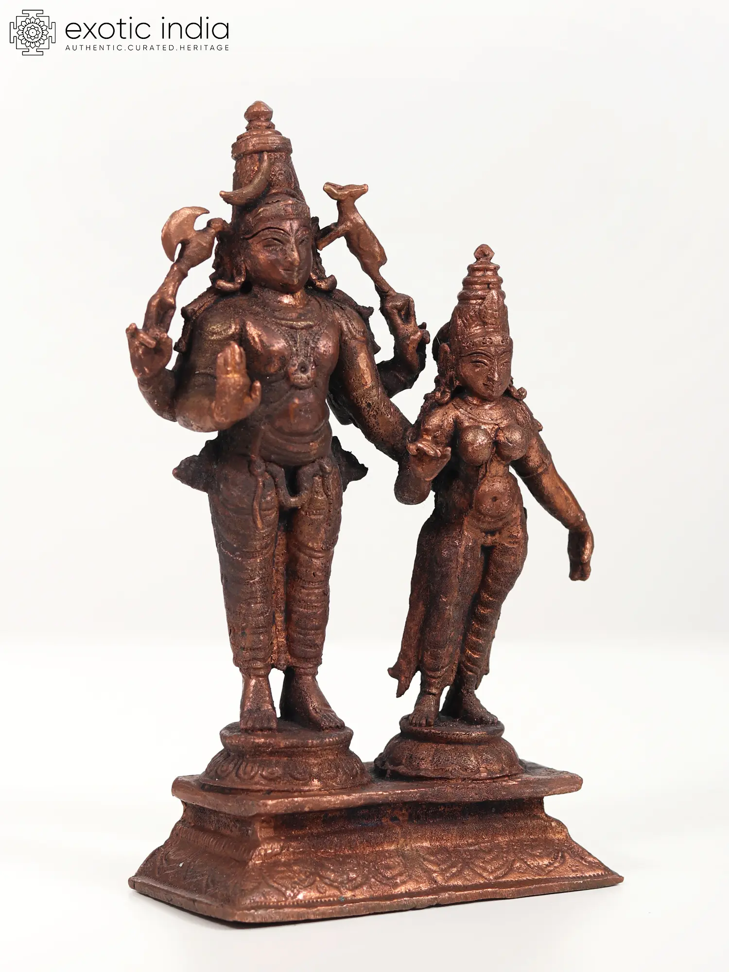 Goddess Parvati stands gracefully in the Tribhanga pose, showcasing her divine beauty. This intricately crafted copper statue captures the celestial aura of the divine couple, symbolizing the harmonious balance of cosmic forces and the eternal dance of creation and destruction in Hindu mythology.