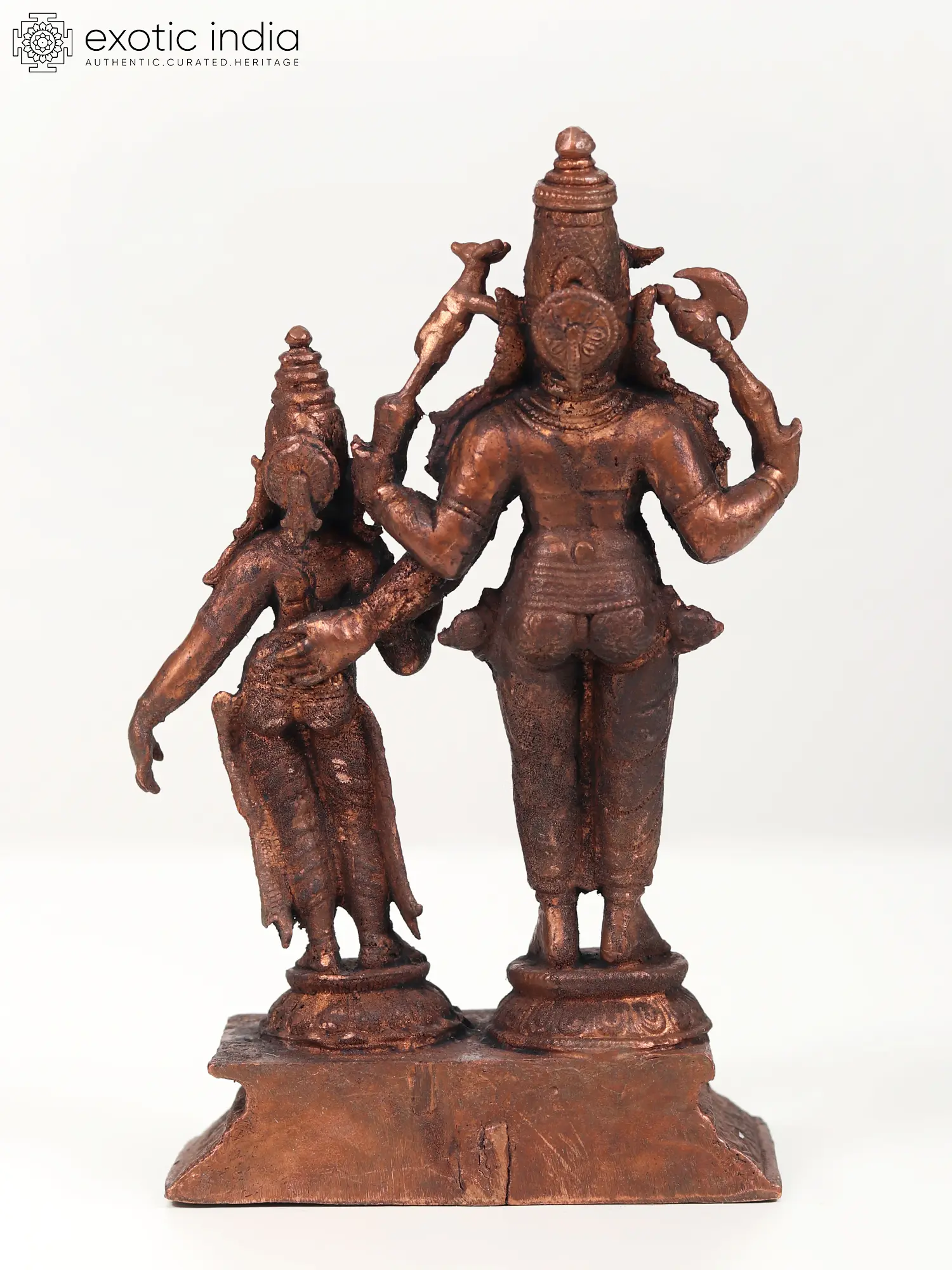 This Small Standing Shiva Parvati Copper Statue encapsulates the divine union of Lord Shiva and Goddess Parvati. Lord Shiva is depicted in the Chaturbhuj form, holding a deer and an axe in his upper hands, with his left hand in the Abhaya Mudra, signifying divine protection. A crescent moon adorns Shiva's crown.