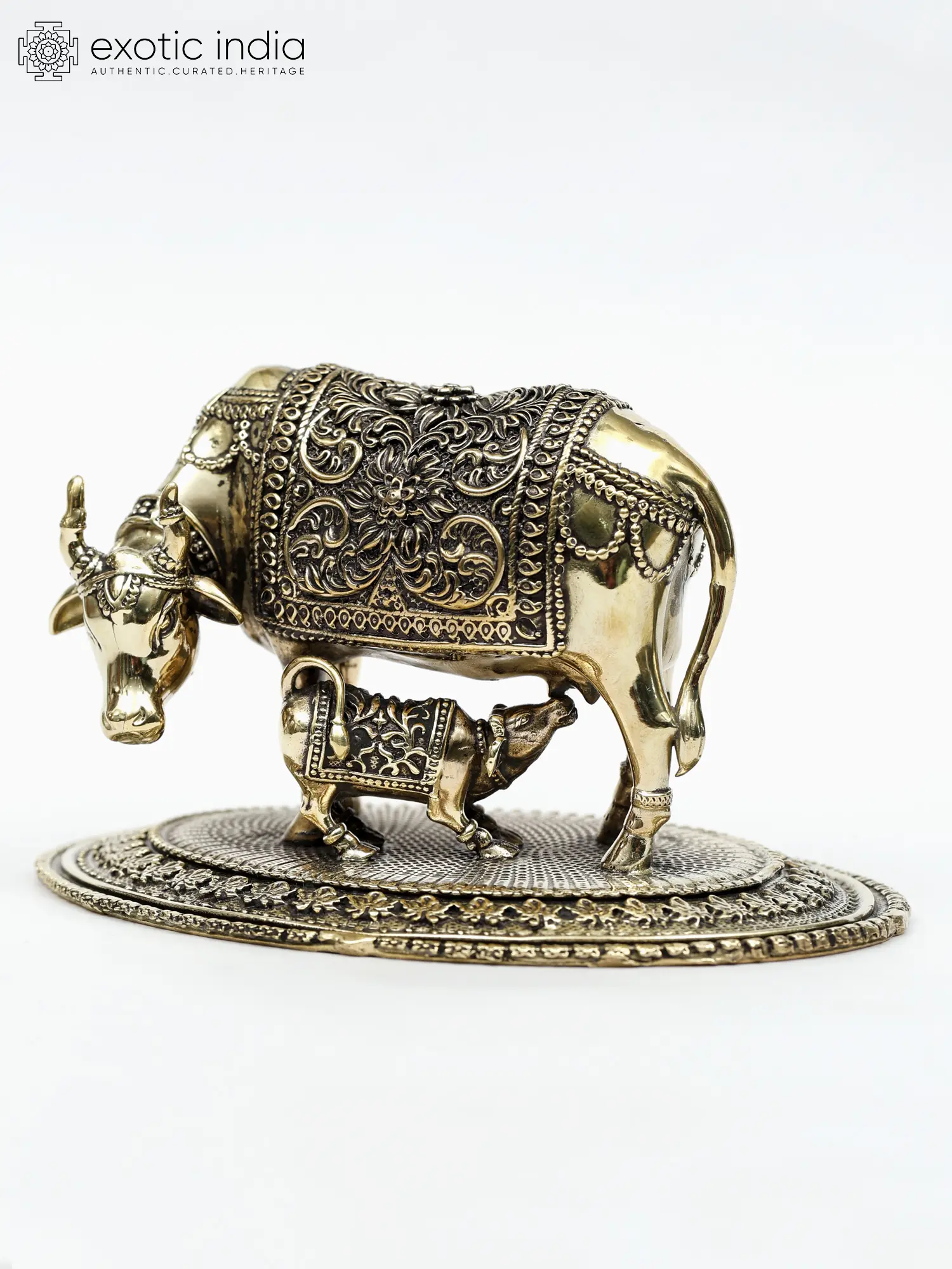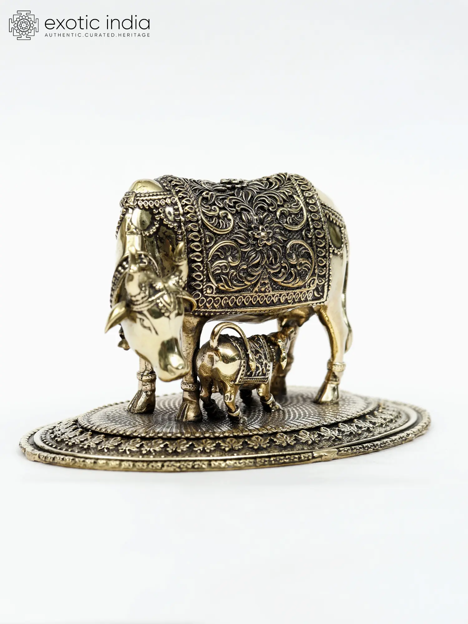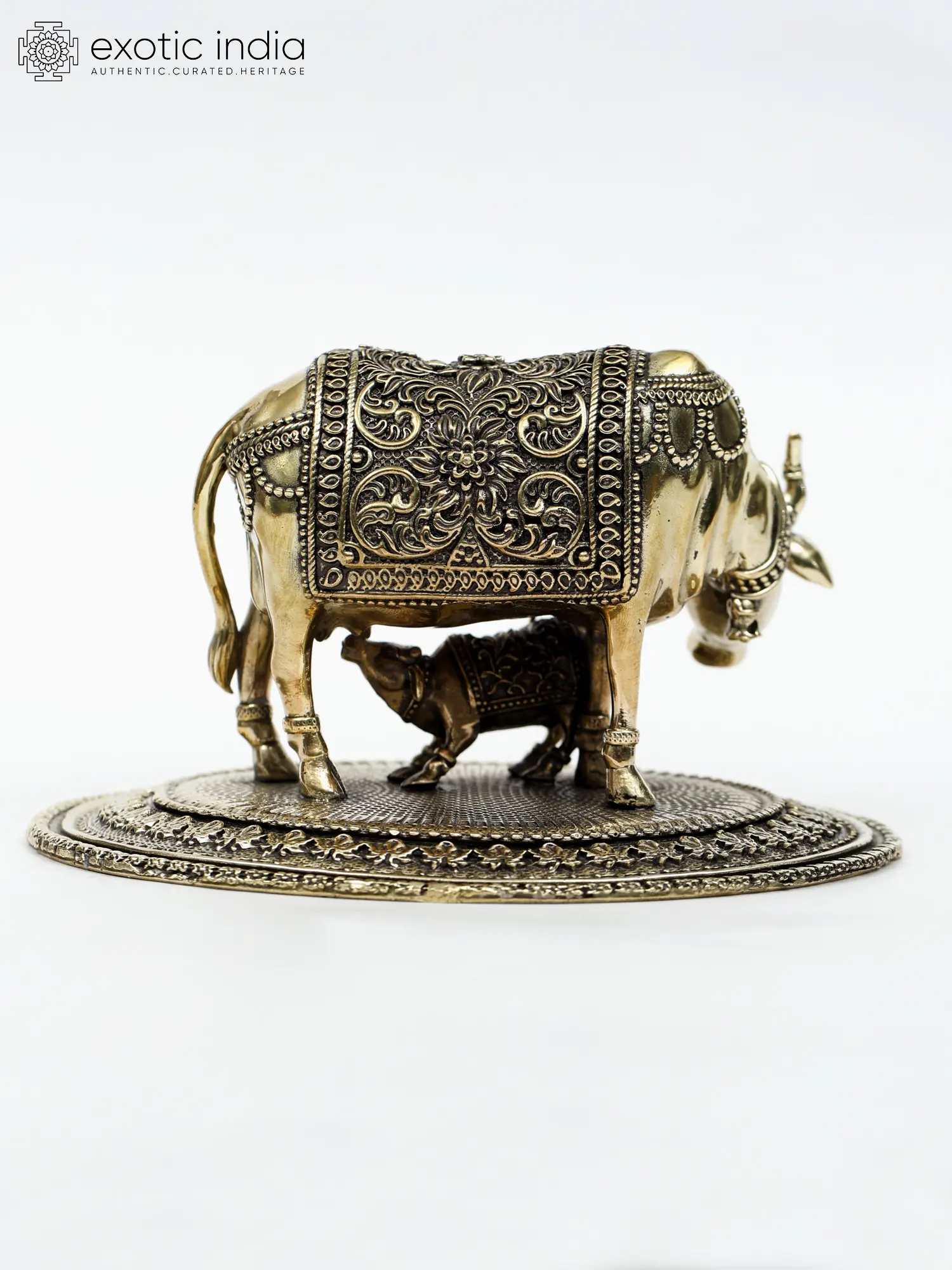 Introducing an elegant brass sculpture capturing the timeless essence of maternal love and nurturing care, this statue portrays a cow tenderly sheltering her calf. Crafted with exquisite detail, the piece emanates a sense of serenity and warmth, reflecting the deep bond between mother and child in nature.