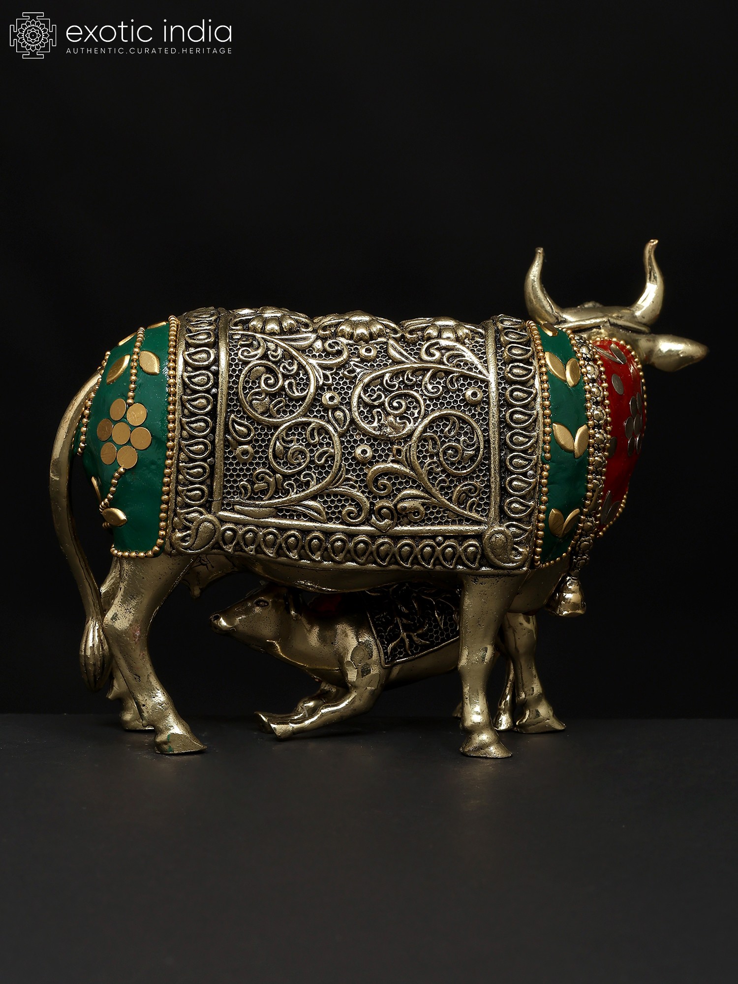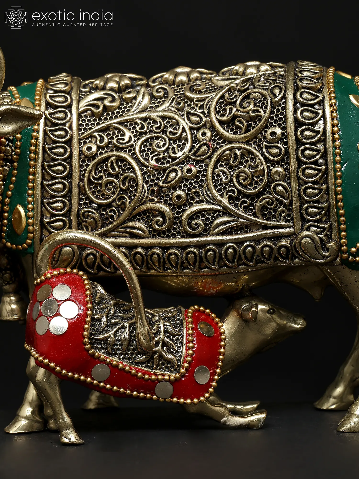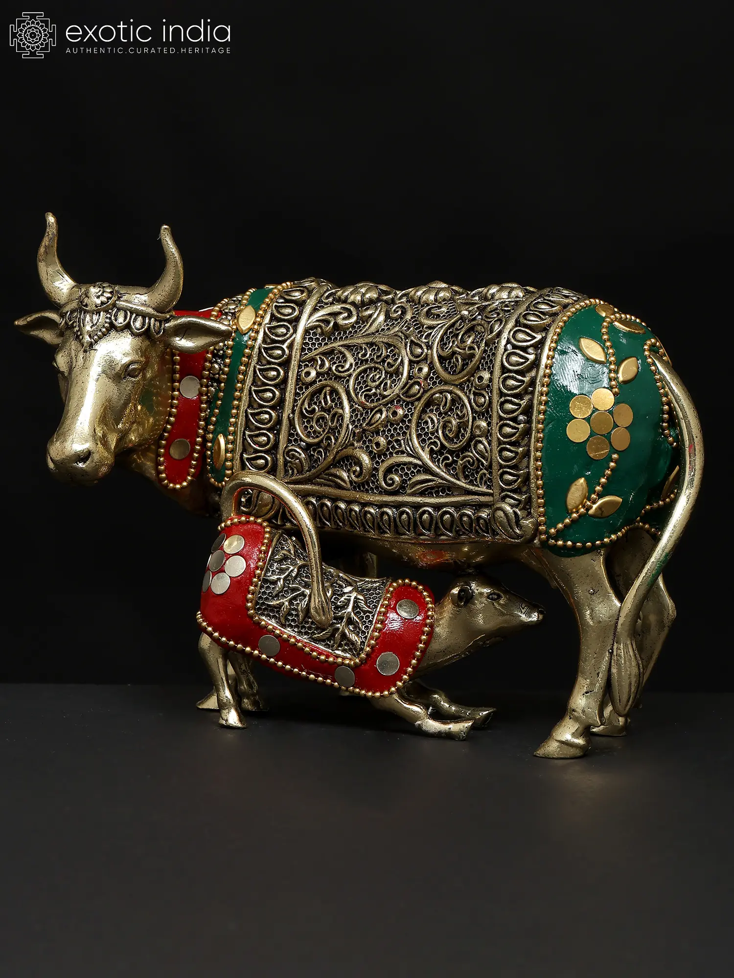 10" Brass Cow and Calf Gullak | Brass Statue with Inlay Work