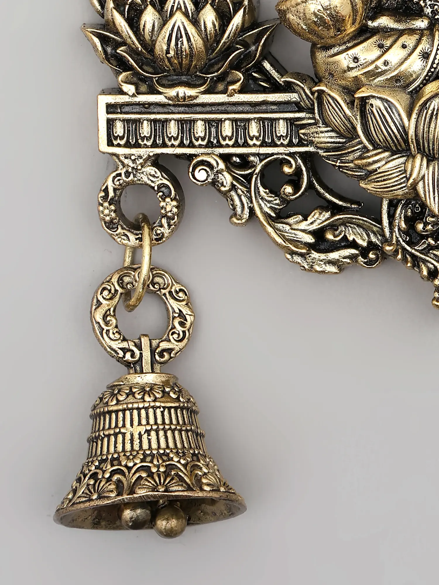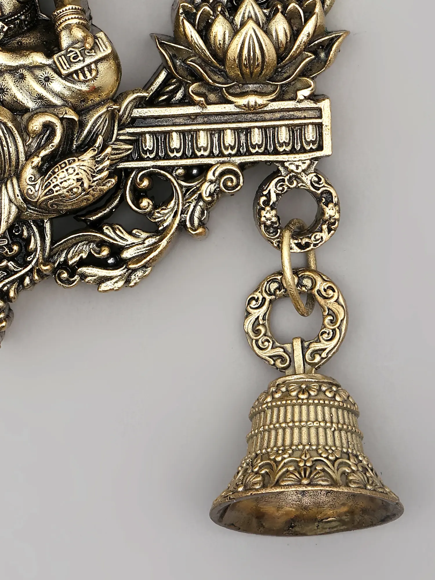 12" Superfine Sitting Lakshmi Ganesha with Dangling Bells | Wood Framed Brass Sculptures | Wall Hanging