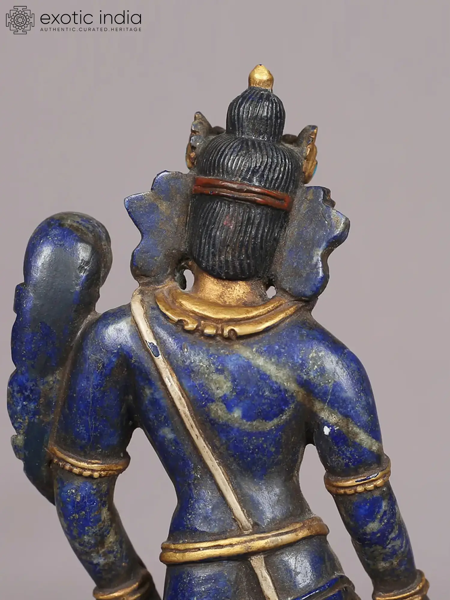 In the left hand, Lokeshvara gracefully cradles the stem of a blooming lotus flower, while the right hand assumes a gesture of boundless generosity. Dressed in resplendent attire, crowned and bedecked with celestial jewels, embellished with exquisite blue and red gemstones, this divine figure is meticulously carved from lapis lazuli stone. This choice of material carries timeless connotations of regality and divine presence, with the belief that the stone encapsulates the essence of the deity, bringing joy to its possessor.
