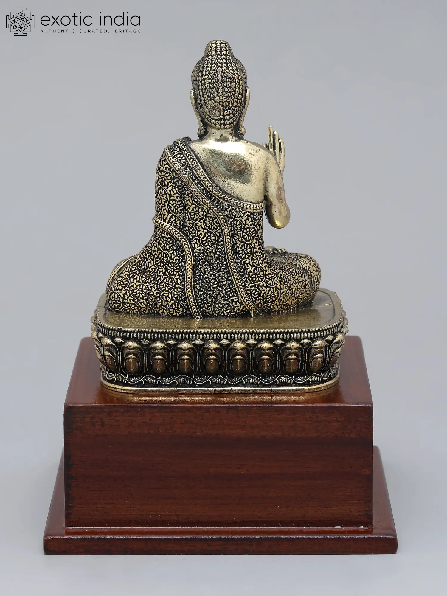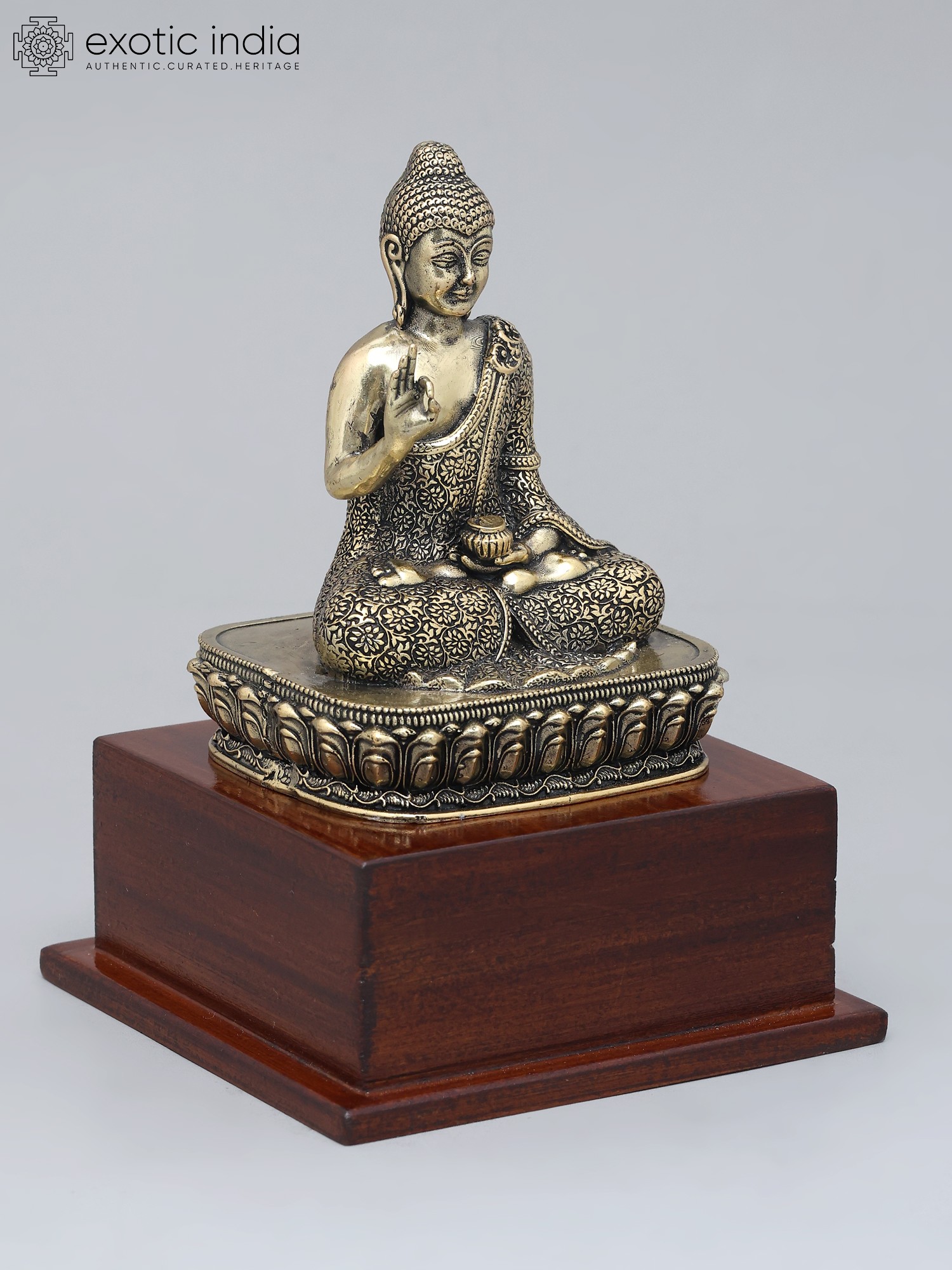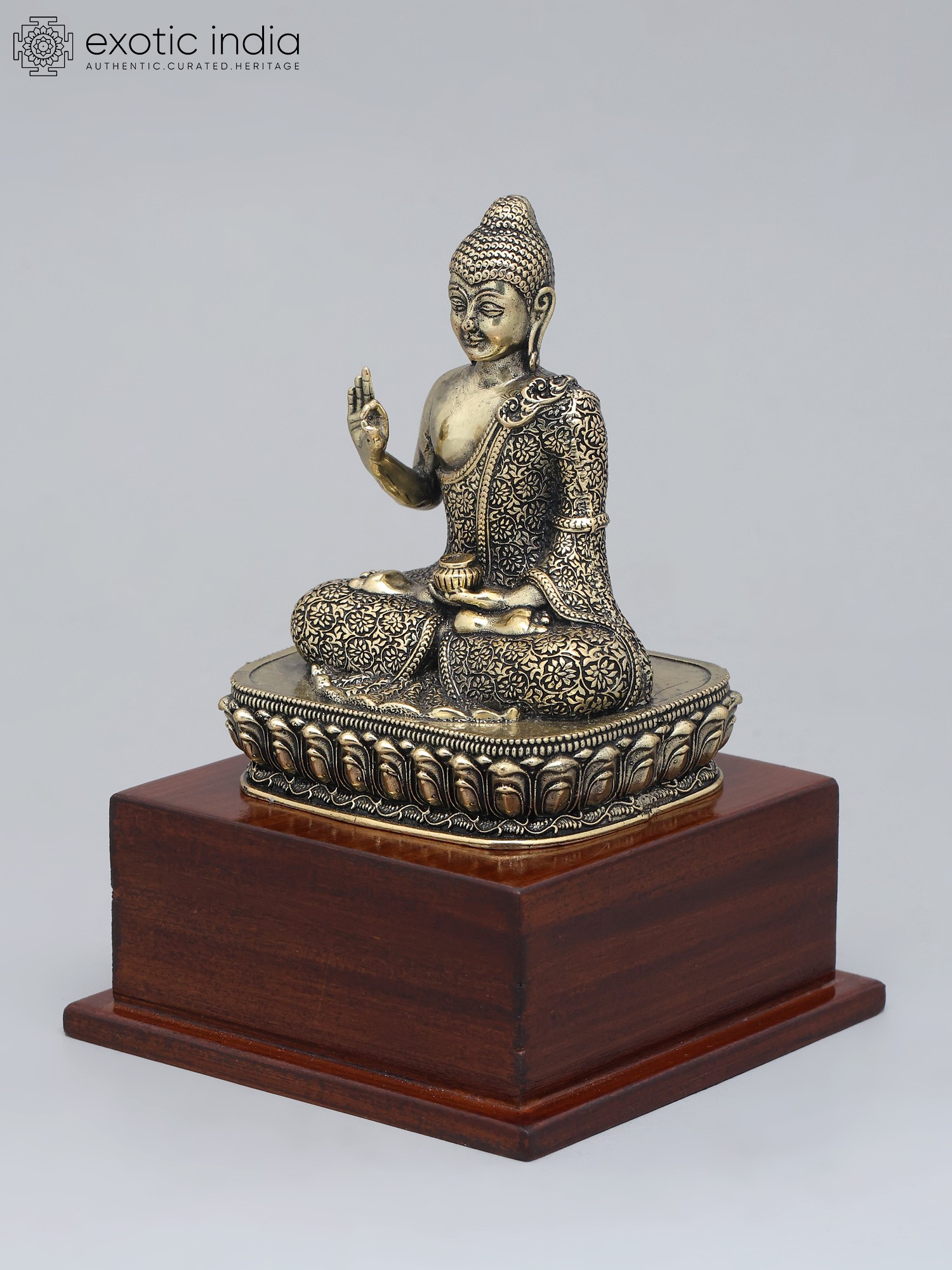 This meticulously crafted statue depicts the Lord Buddha in a moment of profound wisdom. Seated serenely upon an ornate lotus base, which itself rests upon a smooth, polished wood foundation, the figure embodies the essence of peace and understanding. The brass material gives the statue a warm, golden hue, enhanced by the detailed floral patterns etched into the Buddha's robes. Every contour, from the gentle curve of the lips to the precisely defined curls of the hair, speaks to the skill and dedication of the artisan.