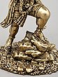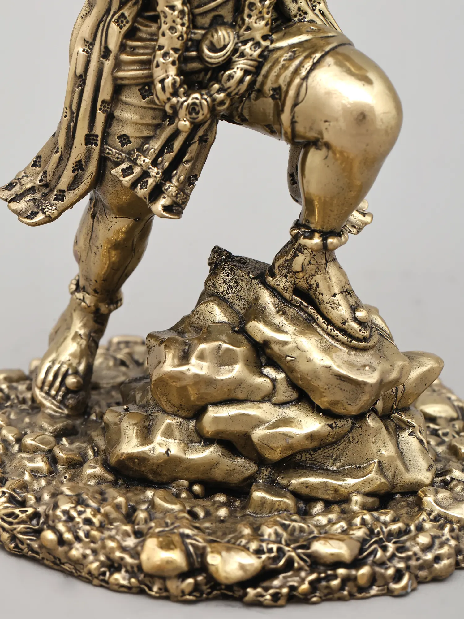 Crafted from high-quality brass, this superfine statue exhibits remarkable detail and craftsmanship. The artist has skillfully rendered Hanuman's powerful physique, his muscular build evident in every sculpted contour. His dynamic pose, with one knee bent and poised for action, conveys a sense of urgency and determination. The traditional attire, including the dhoti and the elaborate headgear adorned with feathers, adds to the regal aura of the deity. His jewelry, such as the elaborate necklaces and armbands, are intricately designed, further enhancing the statue's aesthetic appeal. The expression on Hanuman's face is one of intense focus and unwavering resolve, reflecting his divine purpose. The base of the statue is also meticulously detailed, depicting the rocky terrain of the Himalayas, complete with smaller rocks and foliage, grounding the divine figure in a semblance of the earthly realm. ––––––––––