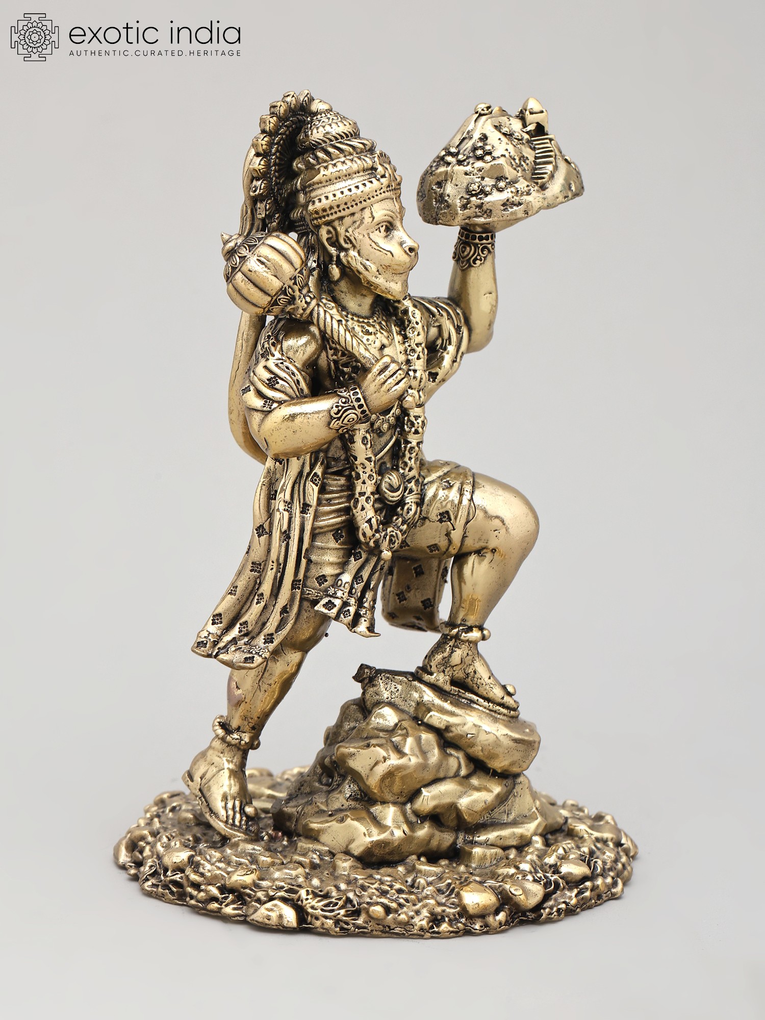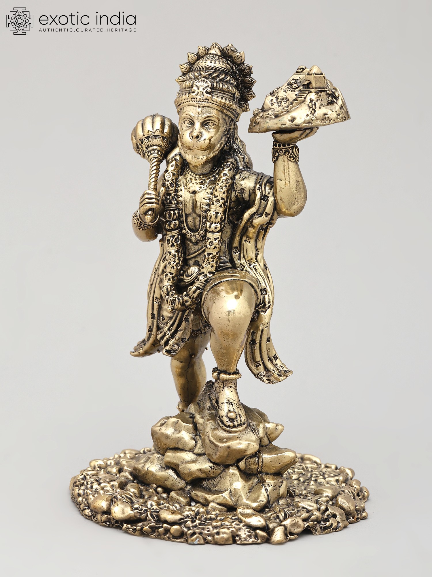 7" Lord Hanuman Brass Idol Lifting the Sanjivani Mountain | Handmade | Made In India