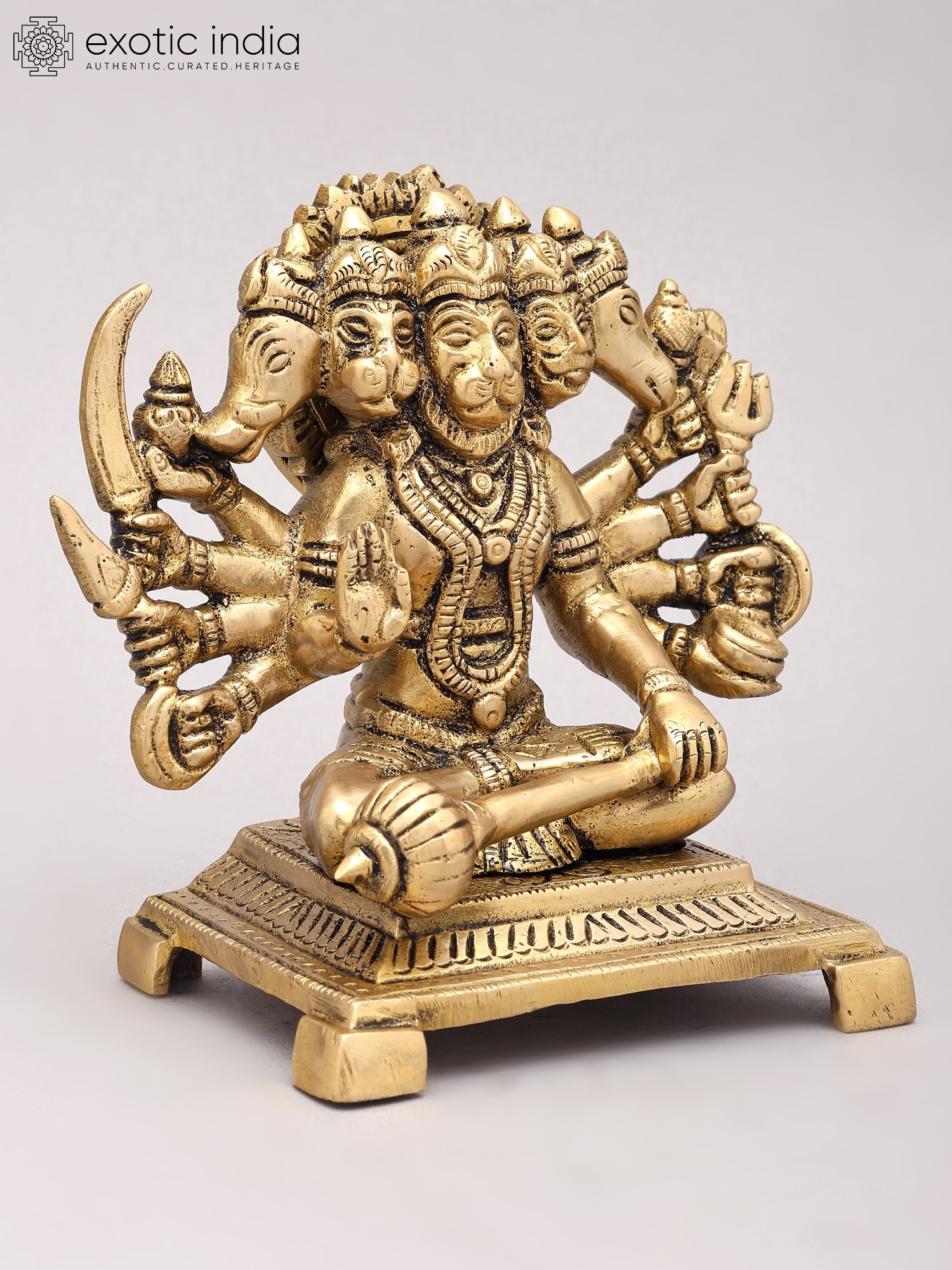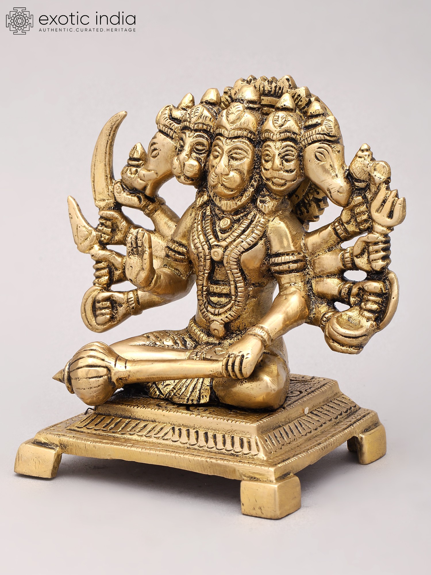 Superfine 5" Brass Sculpture: Panchamukhi Hanuman in Seated Gesture on Wood Base