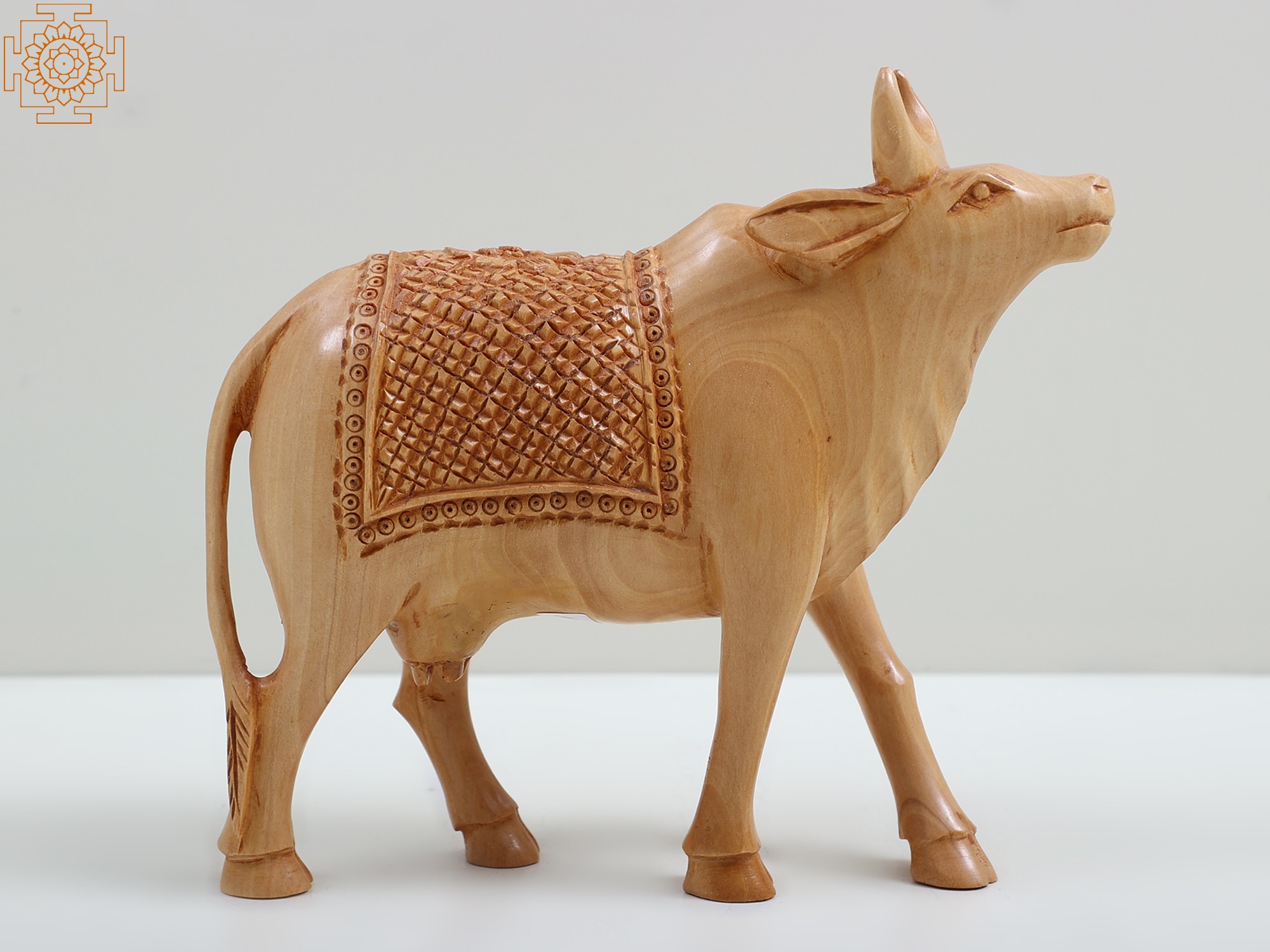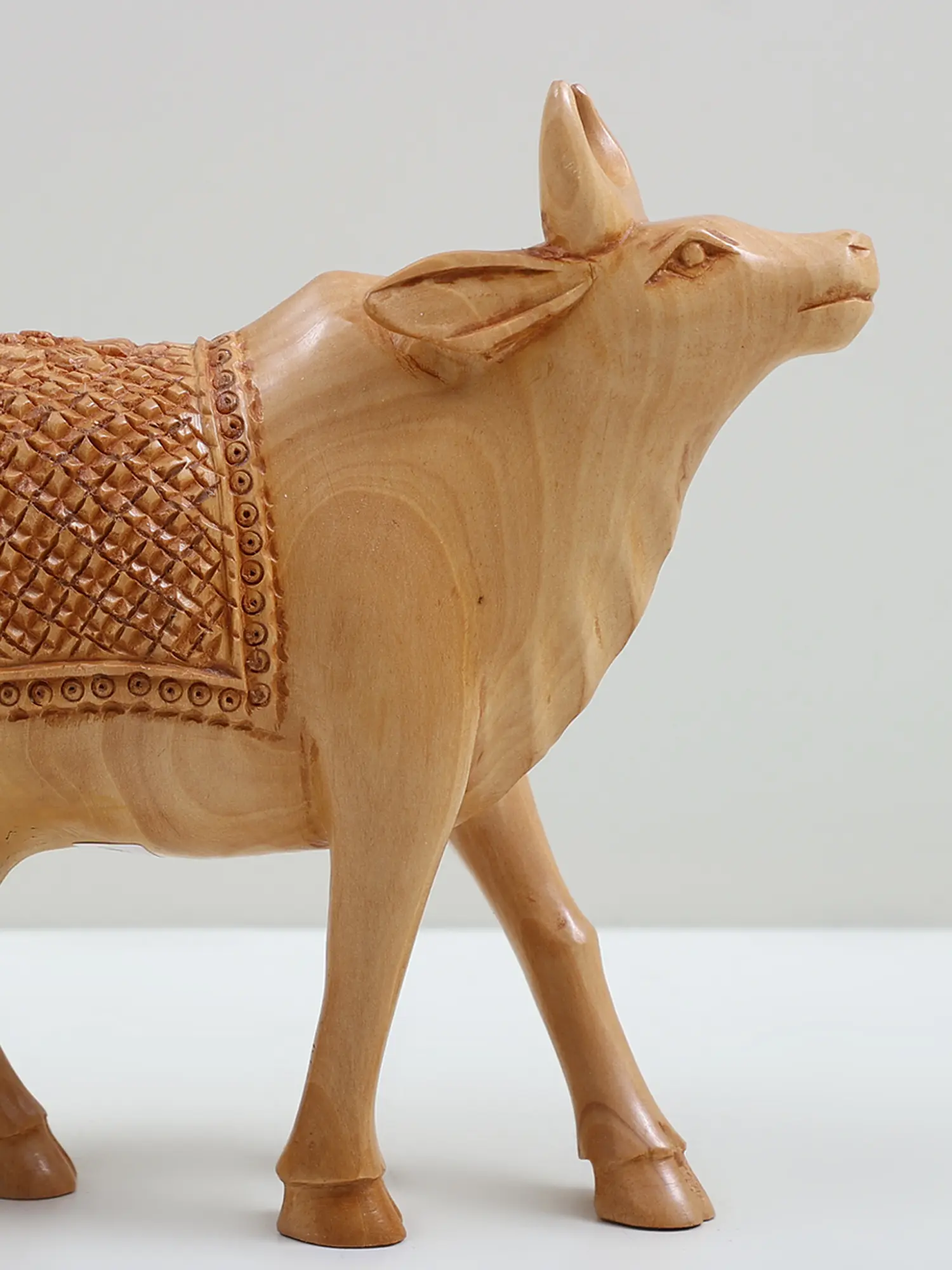 Each curve and contour of this wooden cow has been meticulously carved by skilled artisans, capturing the serene and benevolent spirit of this sacred animal. The natural wood grain lends an organic warmth and timeless beauty, while the intricately detailed saddle blanket adds a touch of regal elegance. The delicate carving on the blanket, with its geometric patterns and border of tiny circles, speaks to the care and devotion poured into its creation. This piece is a testament to traditional craftsmanship and artistic expression, designed to be a focal point of contemplation and admiration in any space.