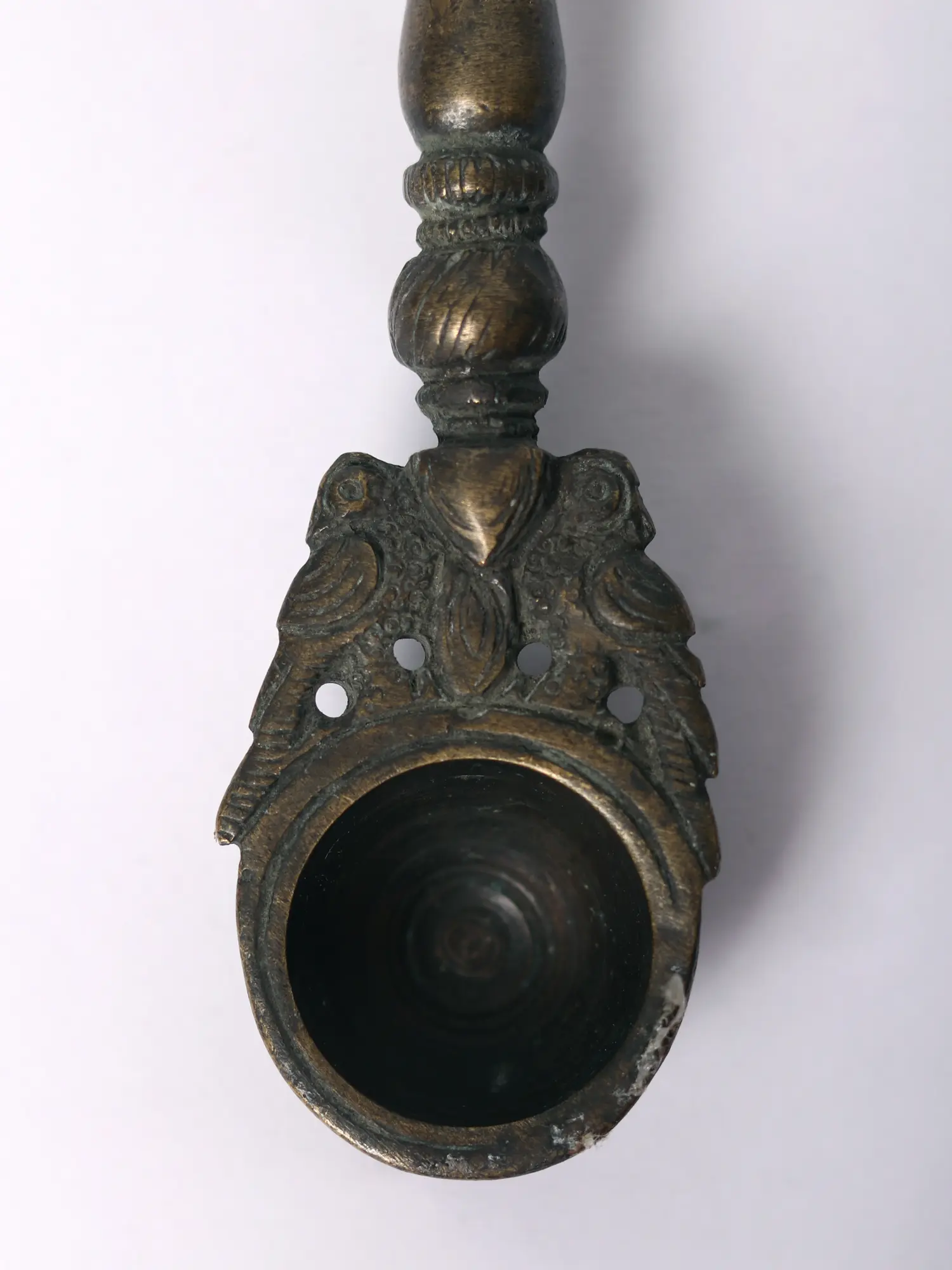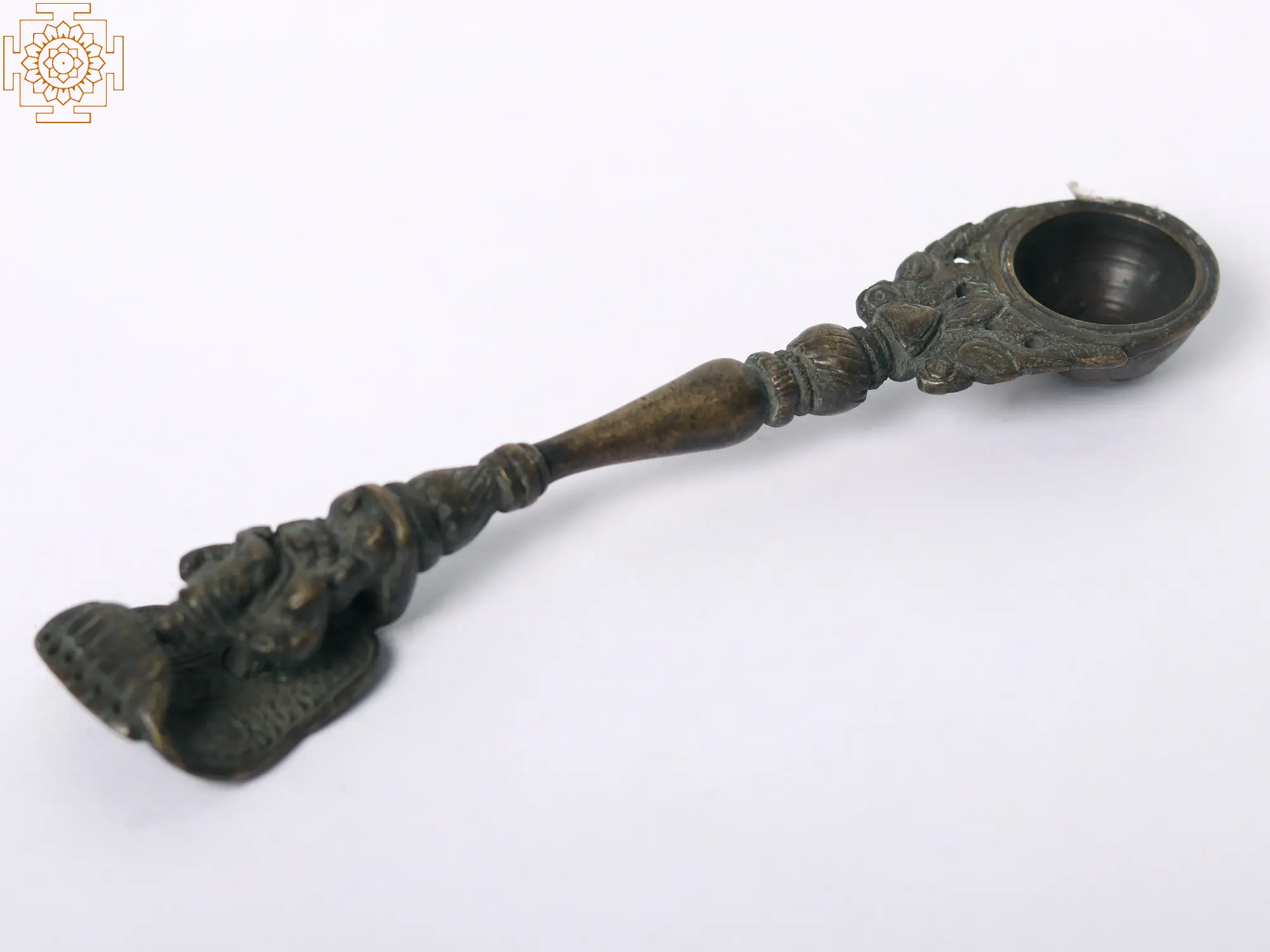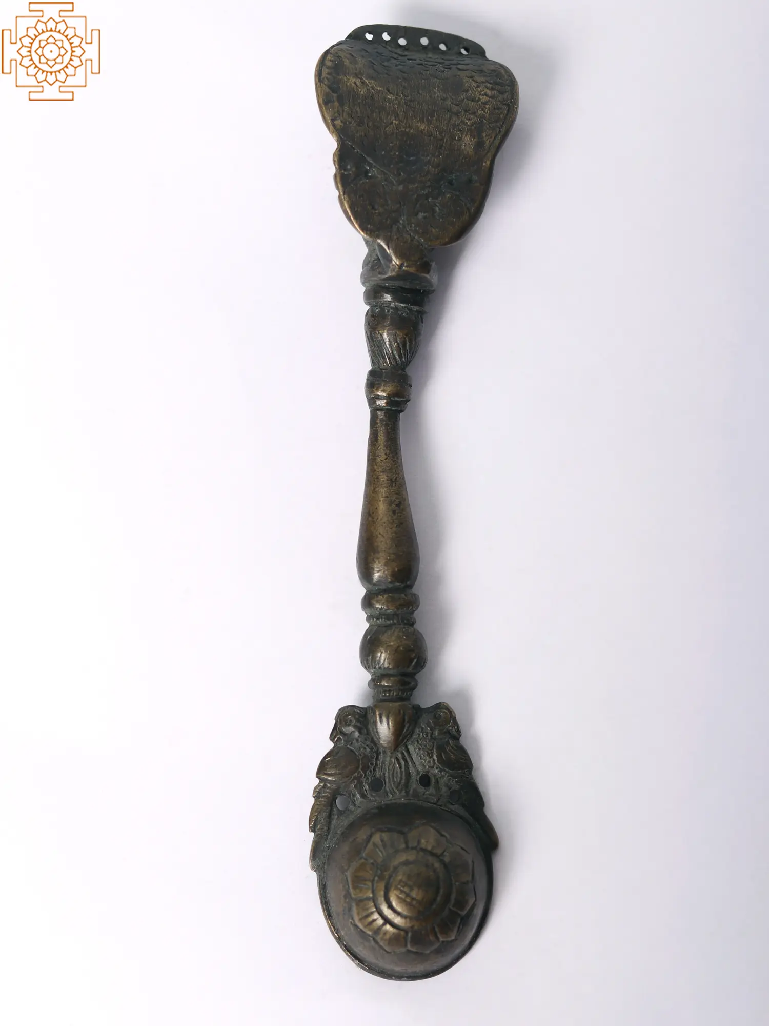 The Snake-Hooded Ganesha Ritual Spoon is a revered artifact for Hindu worship traditions, embodying the essence of sacred rituals and purity. Crafted with precision, this intricately designed spoon features Lord Ganesha, the remover of obstacles, adorned with a serpent hood. The serpent symbolizes protection and divine energy, enhancing the spoon's significance in rituals. The peacocks, accompanying Ganesha, represent grace and purity. Together, these elements infuse the spoon with unparalleled divinity. Hindus believe that using this sacred utensil in ceremonies invokes blessings, ensuring the sanctity of their offerings. It serves as a reminder of the profound connection between the material and spiritual realms, emphasizing the importance of purity in worship.