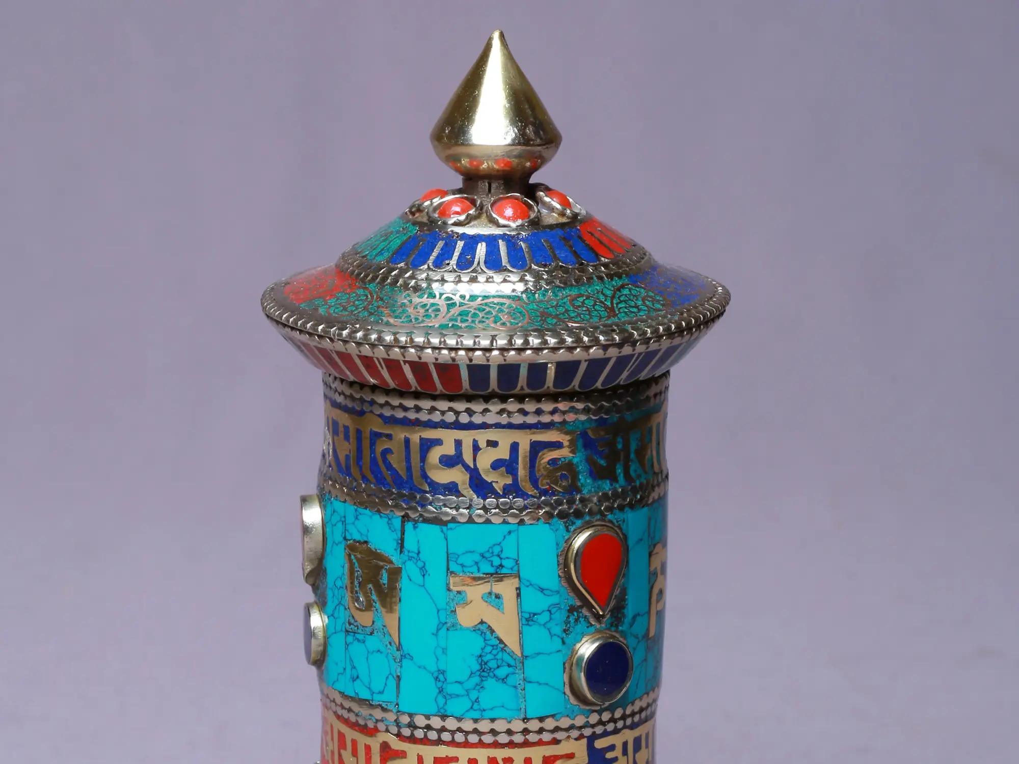 Prayer wheels are a fundamental aspect of Tibetan Buddhism, deeply interwoven with the daily lives of practitioners. The cylindrical structure houses a scroll inscribed with mantras—sacred syllables or phrases—primarily the mantra Om Mani Padme Hum, a powerful prayer for compassion and enlightenment. According to Buddhist beliefs, spinning the wheel is analogous to reciting the mantra countless times, generating positive karma and blessings not only for the spinner but for all beings. This action is often seen as a form of meditation in motion, a conduit to inner peace and spiritual growth. The inlaid stones, each with its own symbolic meaning in Tibetan culture, amplify the spiritual resonance of the wheel.